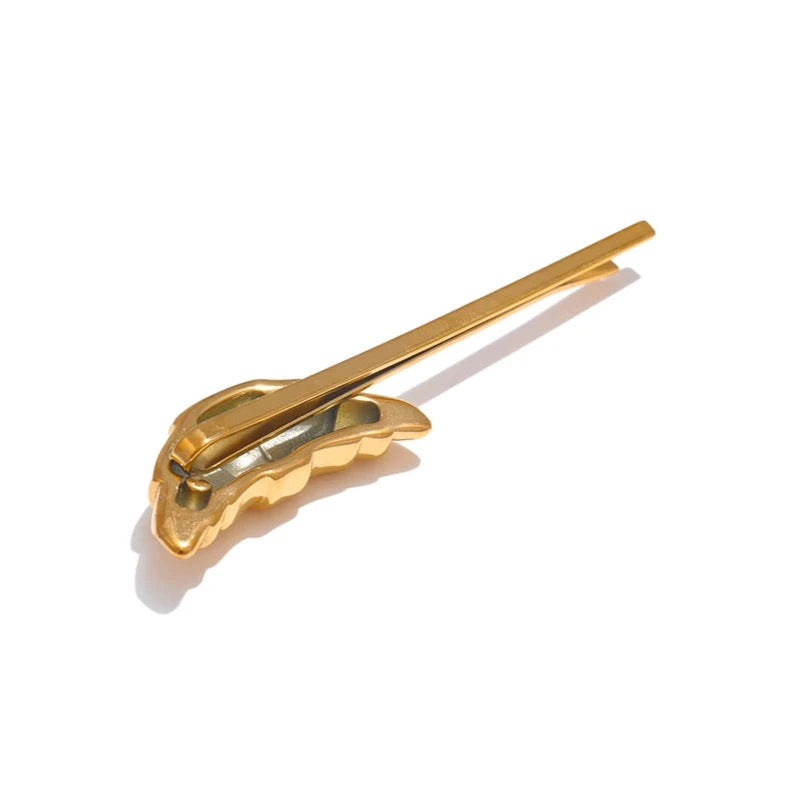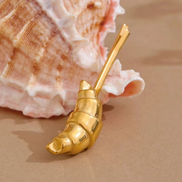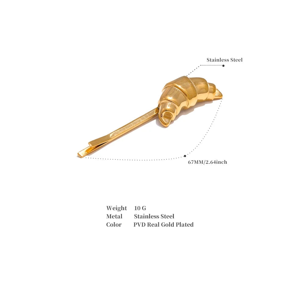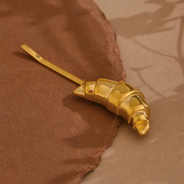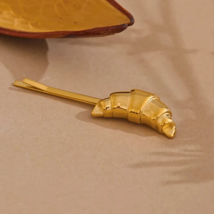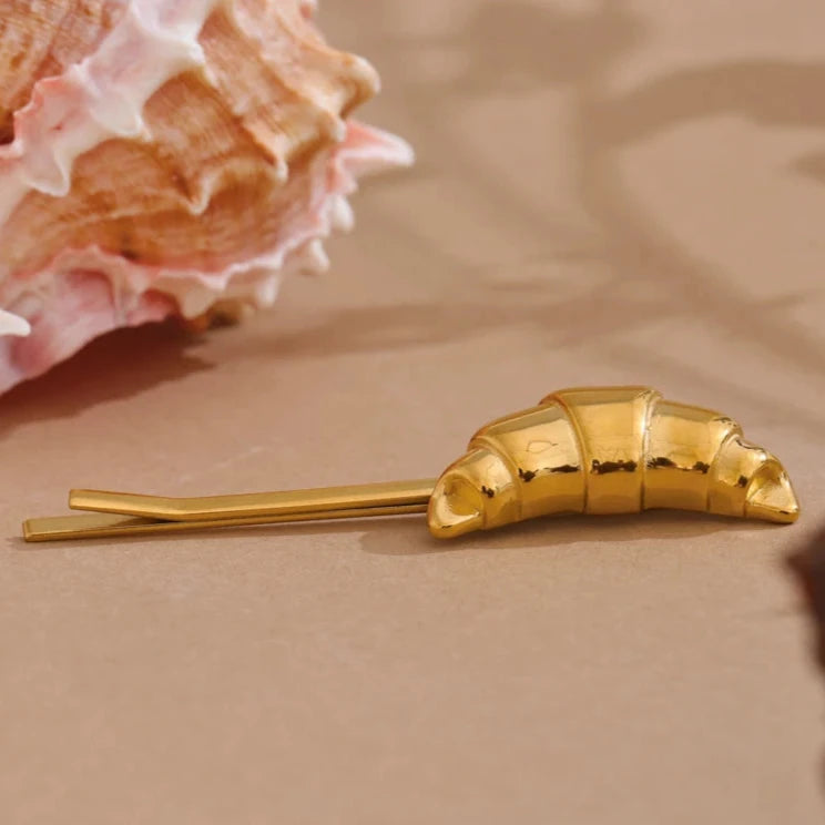 This cute croissant waterproof hairpin accessory is expertly crafted from stainless steel, providing durability and a sleek golden finish. It adds a touch of elegance and sophistication to any hairstyle. A perfect gift or for any occasion.