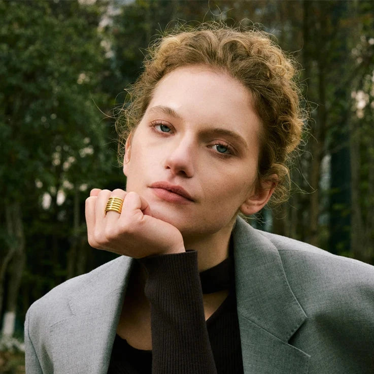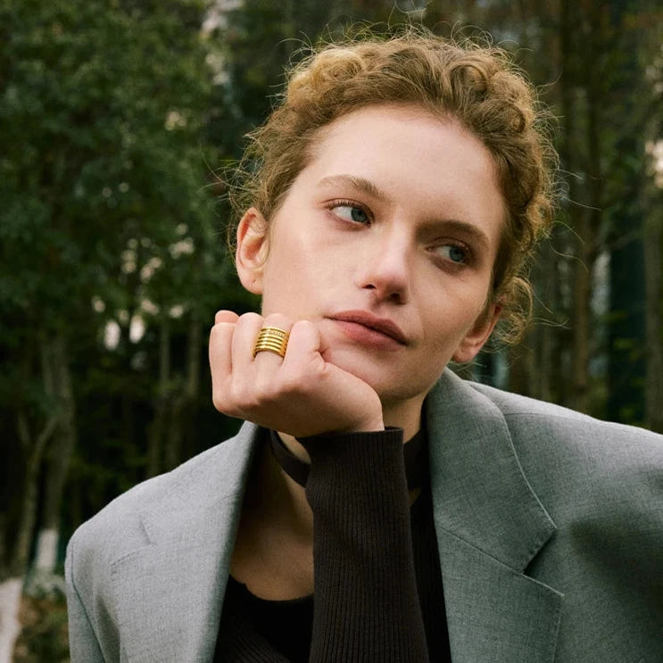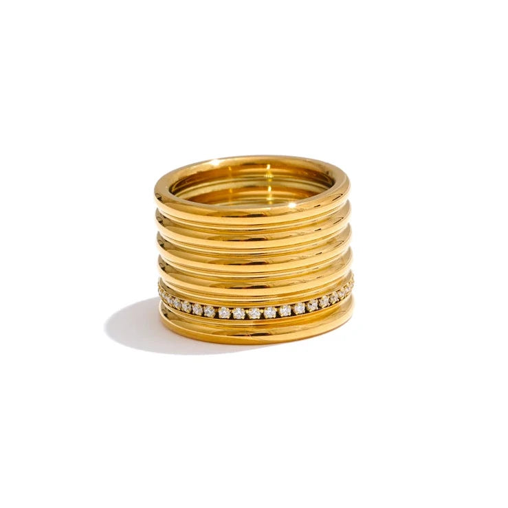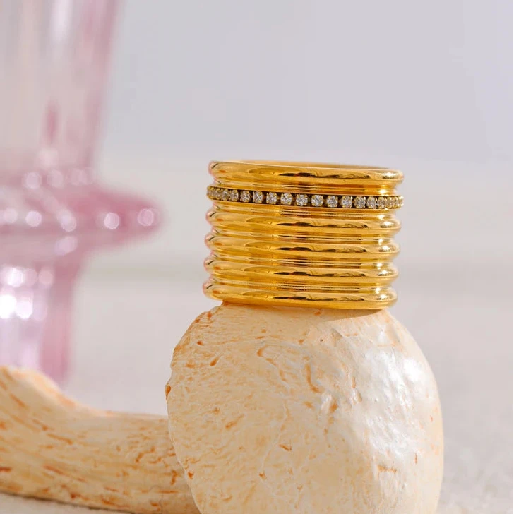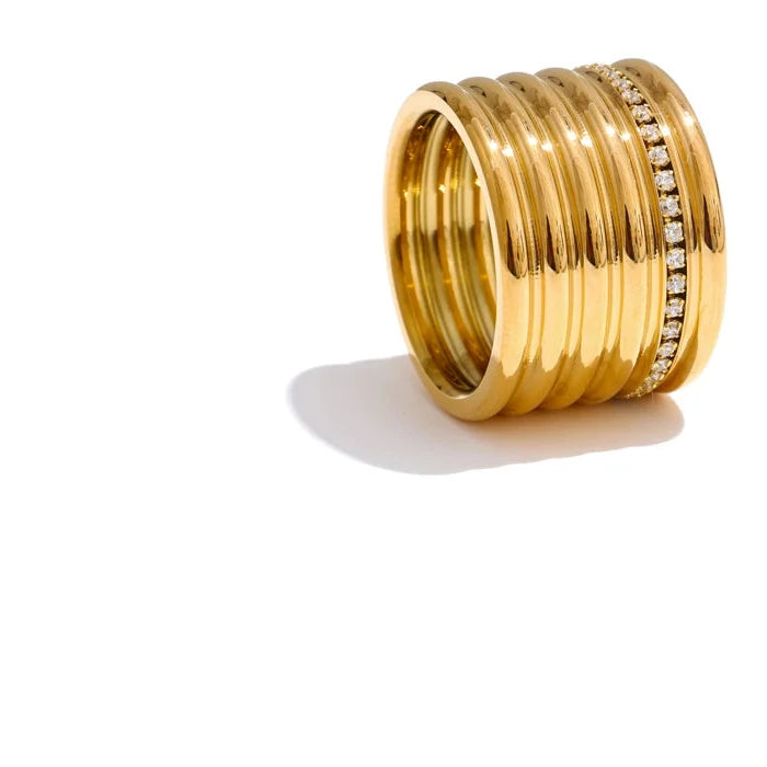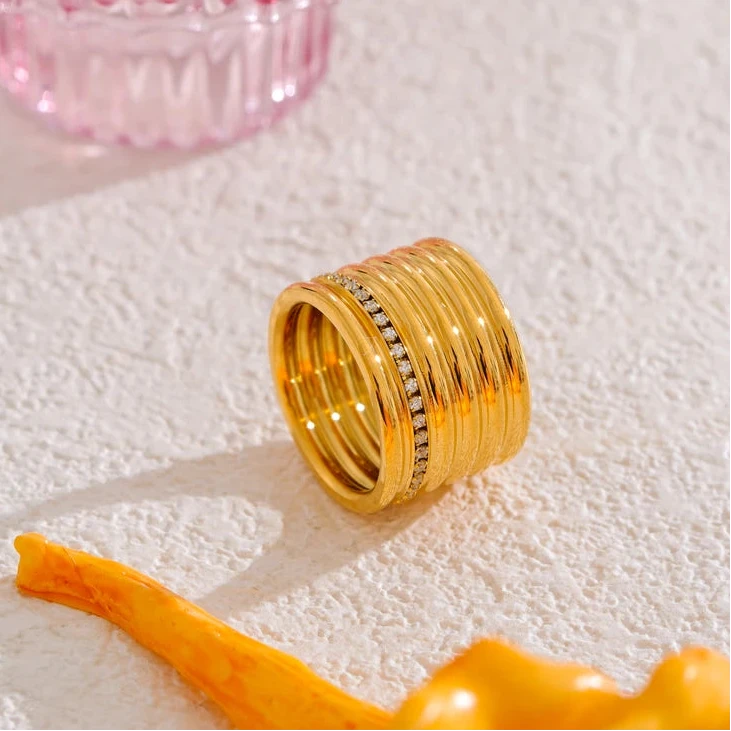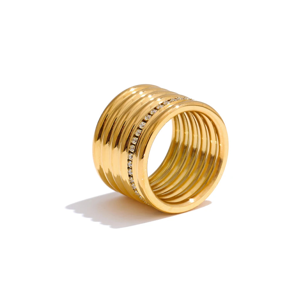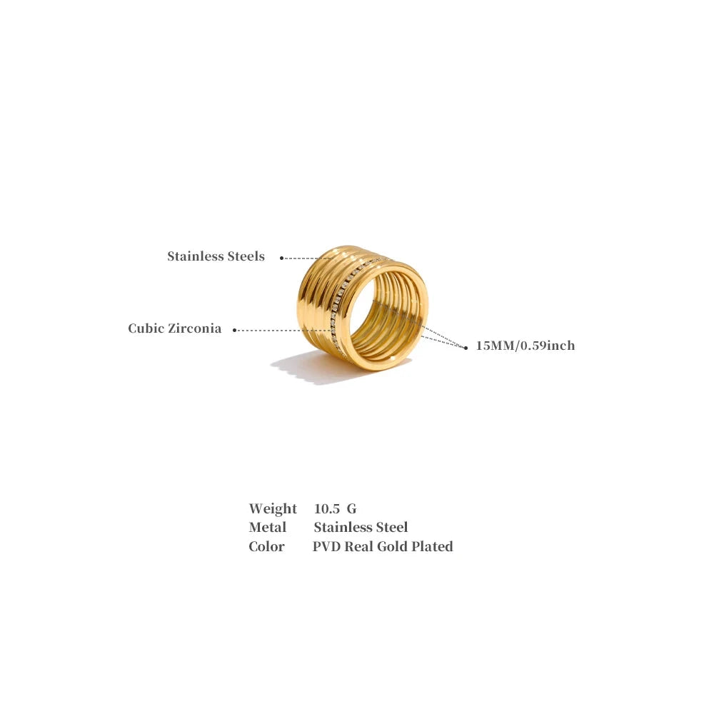 This stunning 18K PVD plated wide round ring features a layered design with inlaid zirconia set into durable 316L stainless steel. Combining lasting shine with modern sophistication, it offers a refined accessory suitable for both everyday wear and special occasions.