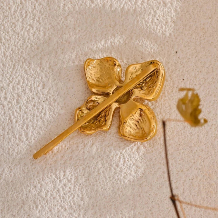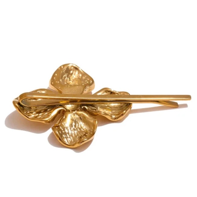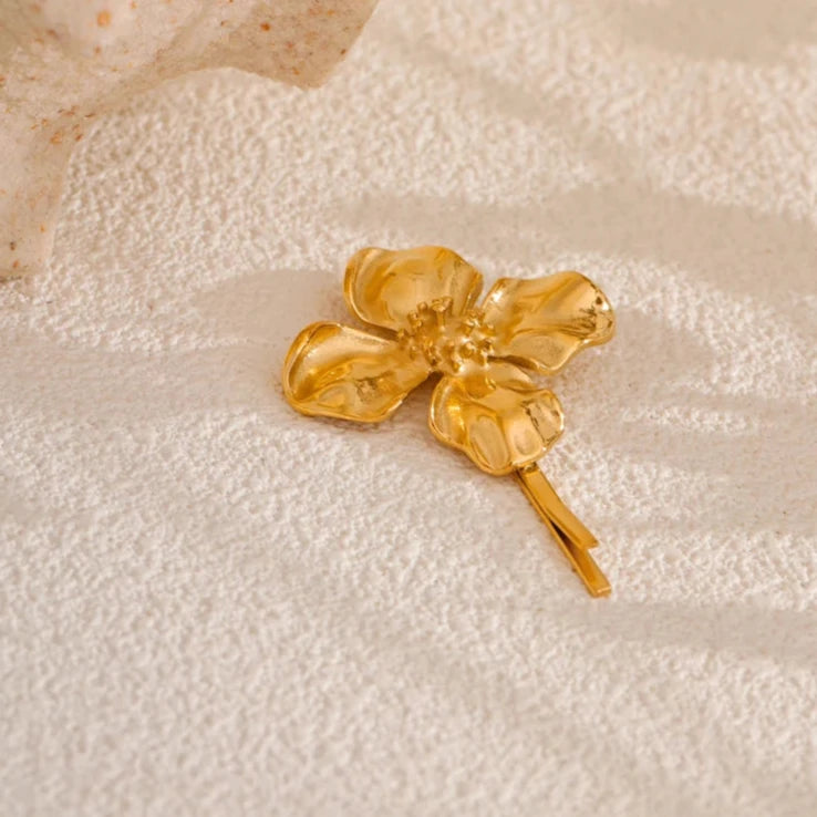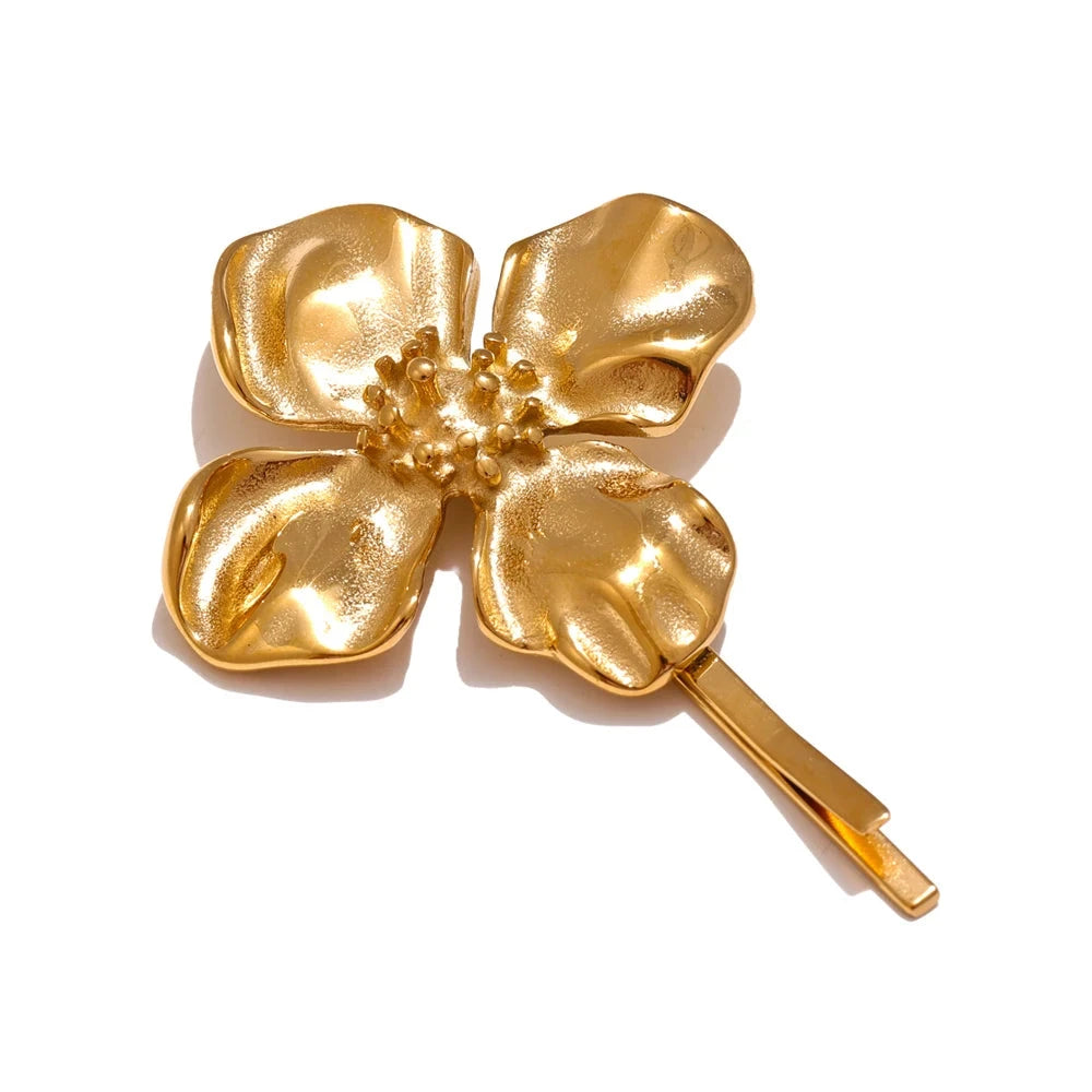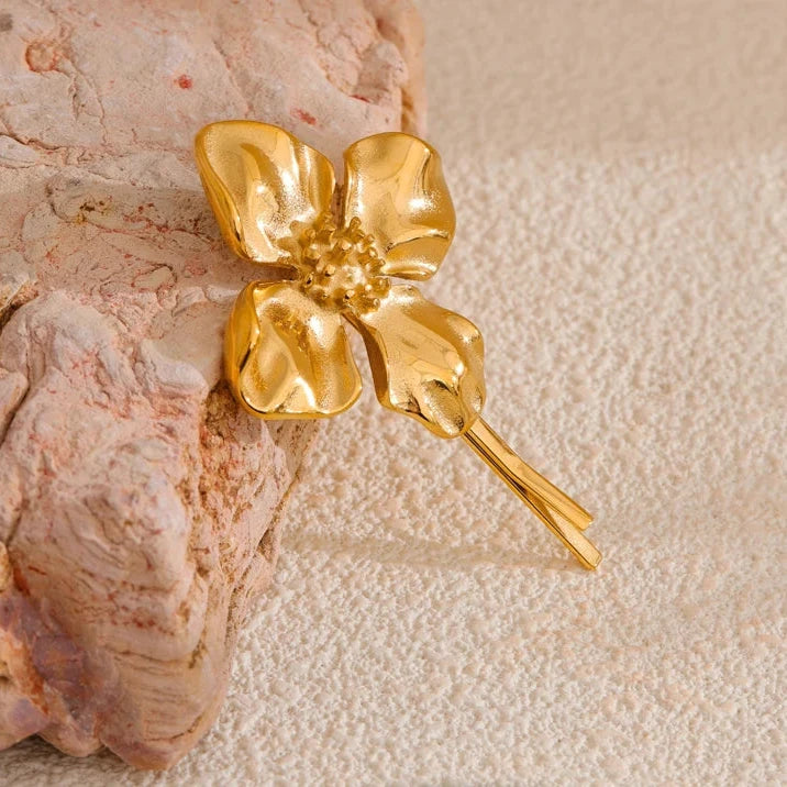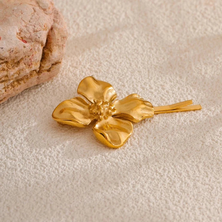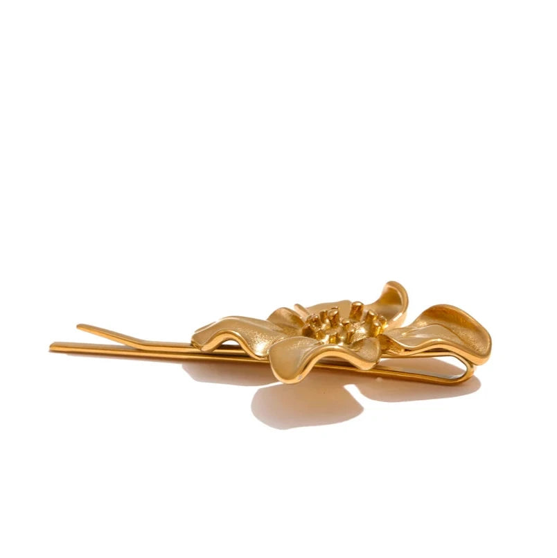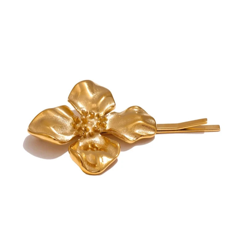 Crafted with stainless steel metal, this 18K golden flower hair clip is not only a stylish fashion accessory, but also durable and waterproof. Elevate your hair game with this charming piece of jewellery.