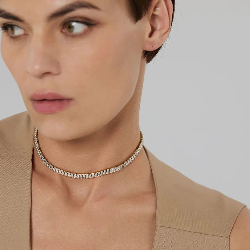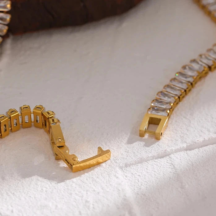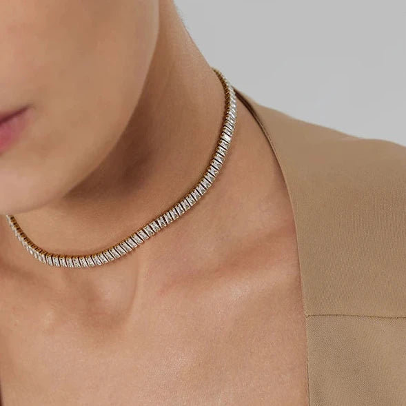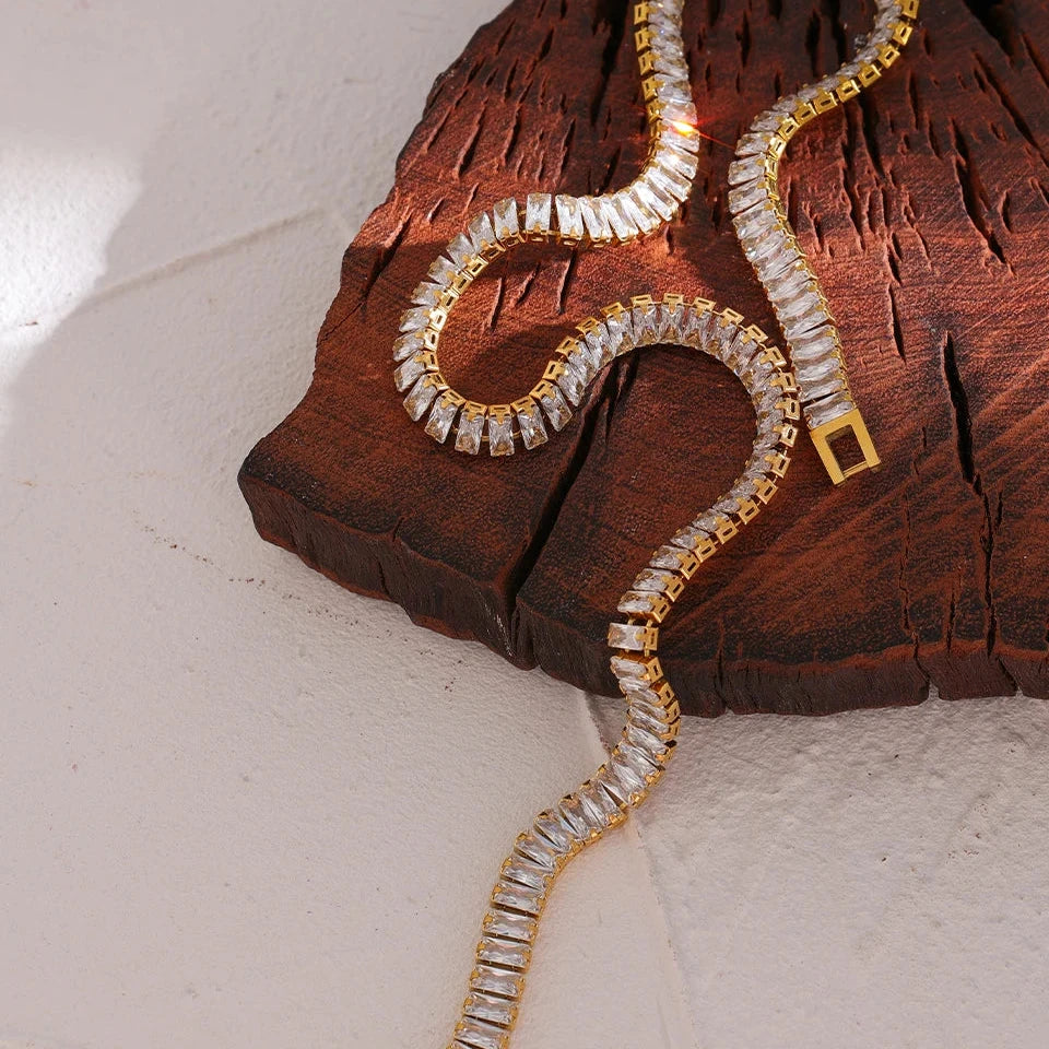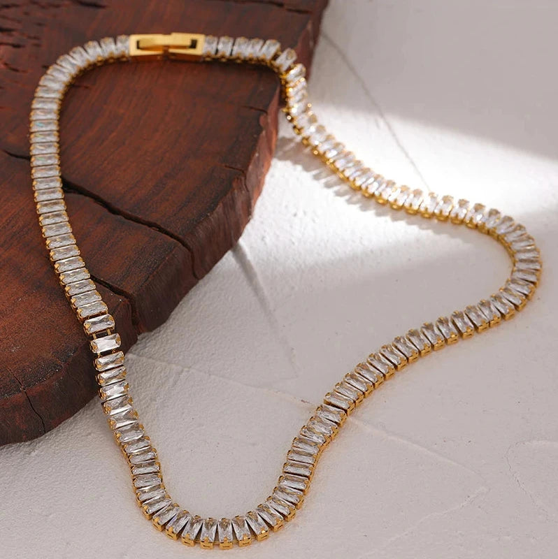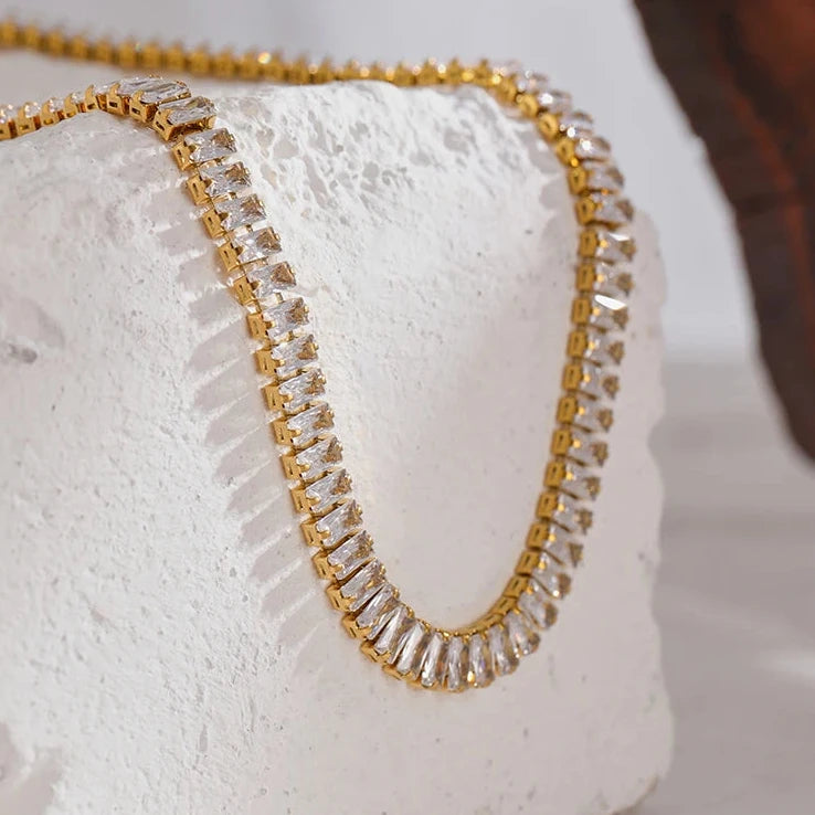 This luxurious piece features shiny cubic zirconia stones that exude elegance and add a touch of sparkle to any outfit. Made of durable stainless steel, it's the perfect piece for any special occasion.