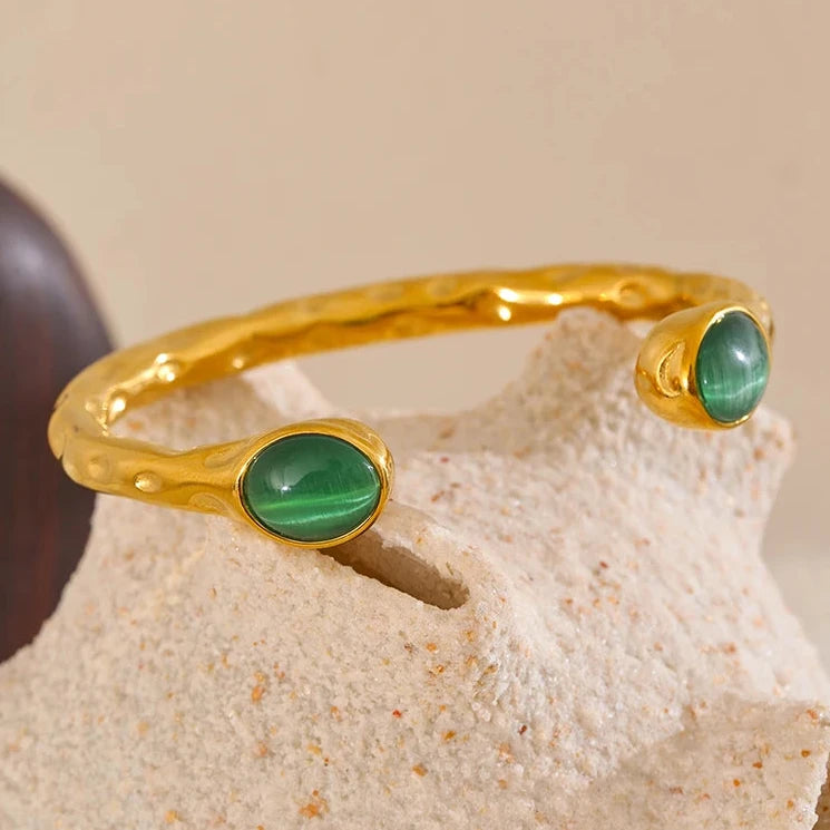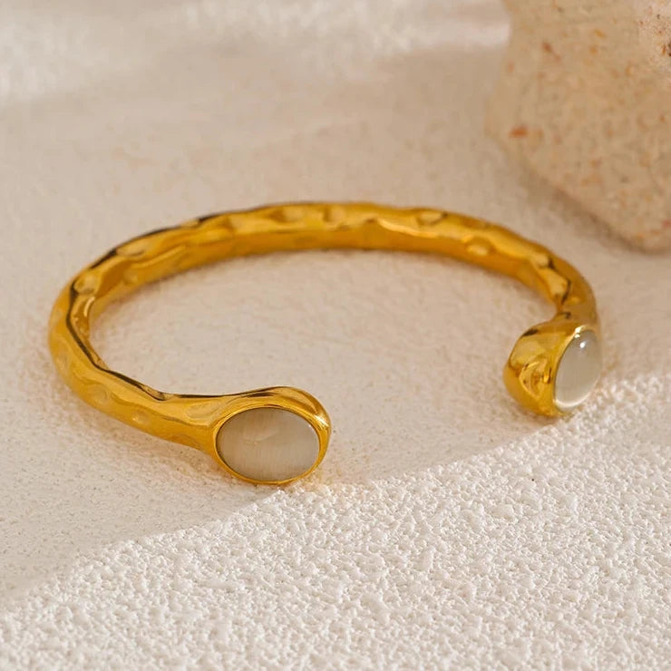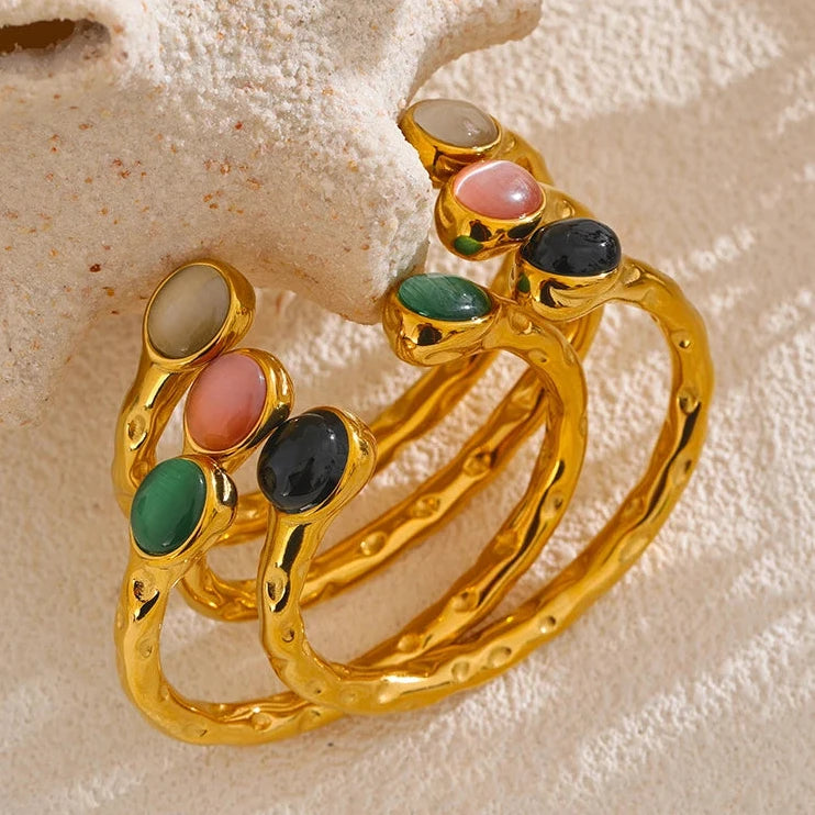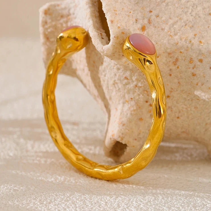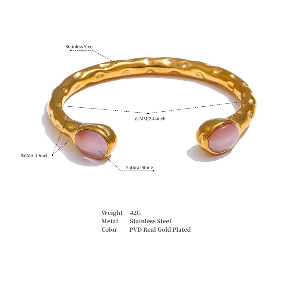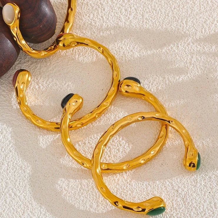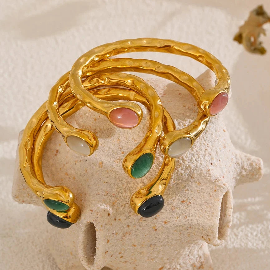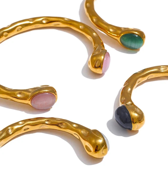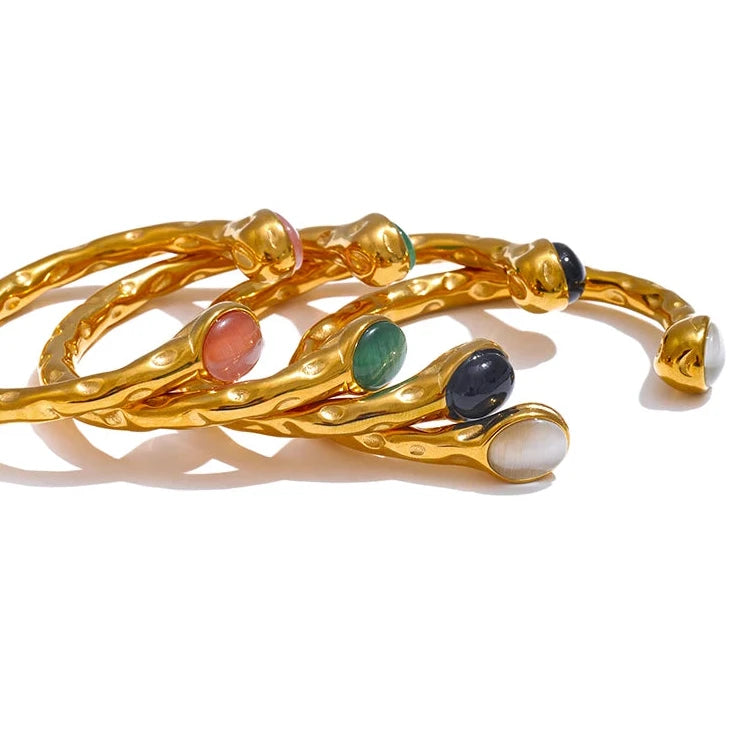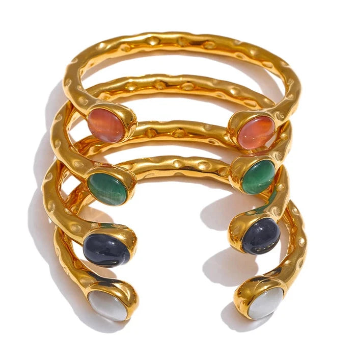 Experience elegance and durability with high quality stainless steel multicoloured natural stone golden cuff open bracelet. The water resistant design makes this bangle perfect for everyday wear. Elevate your style with this timeless piece of jewellery that will last for years to come.
