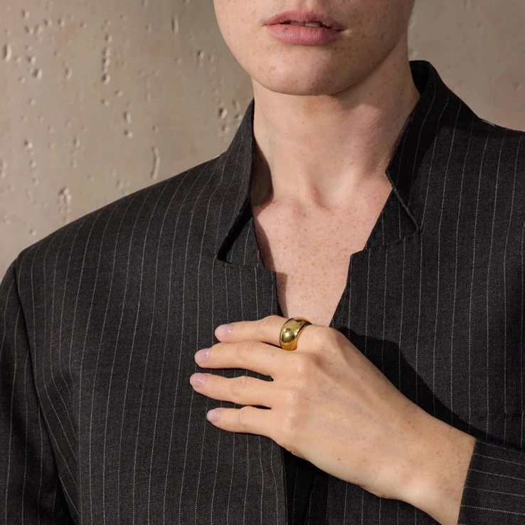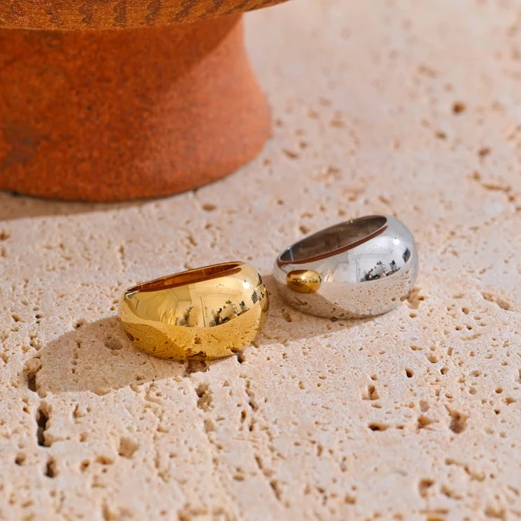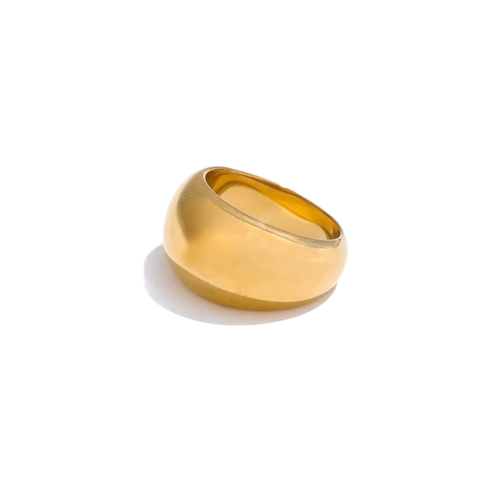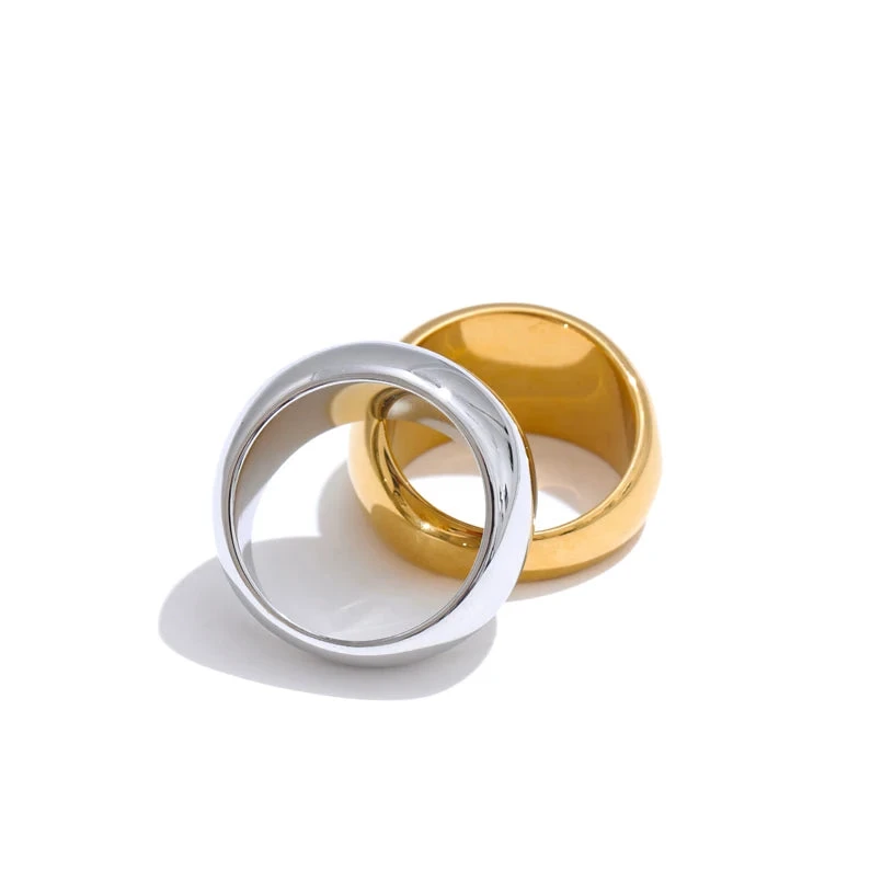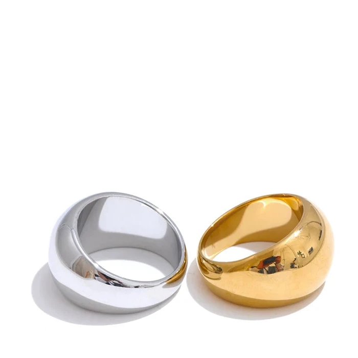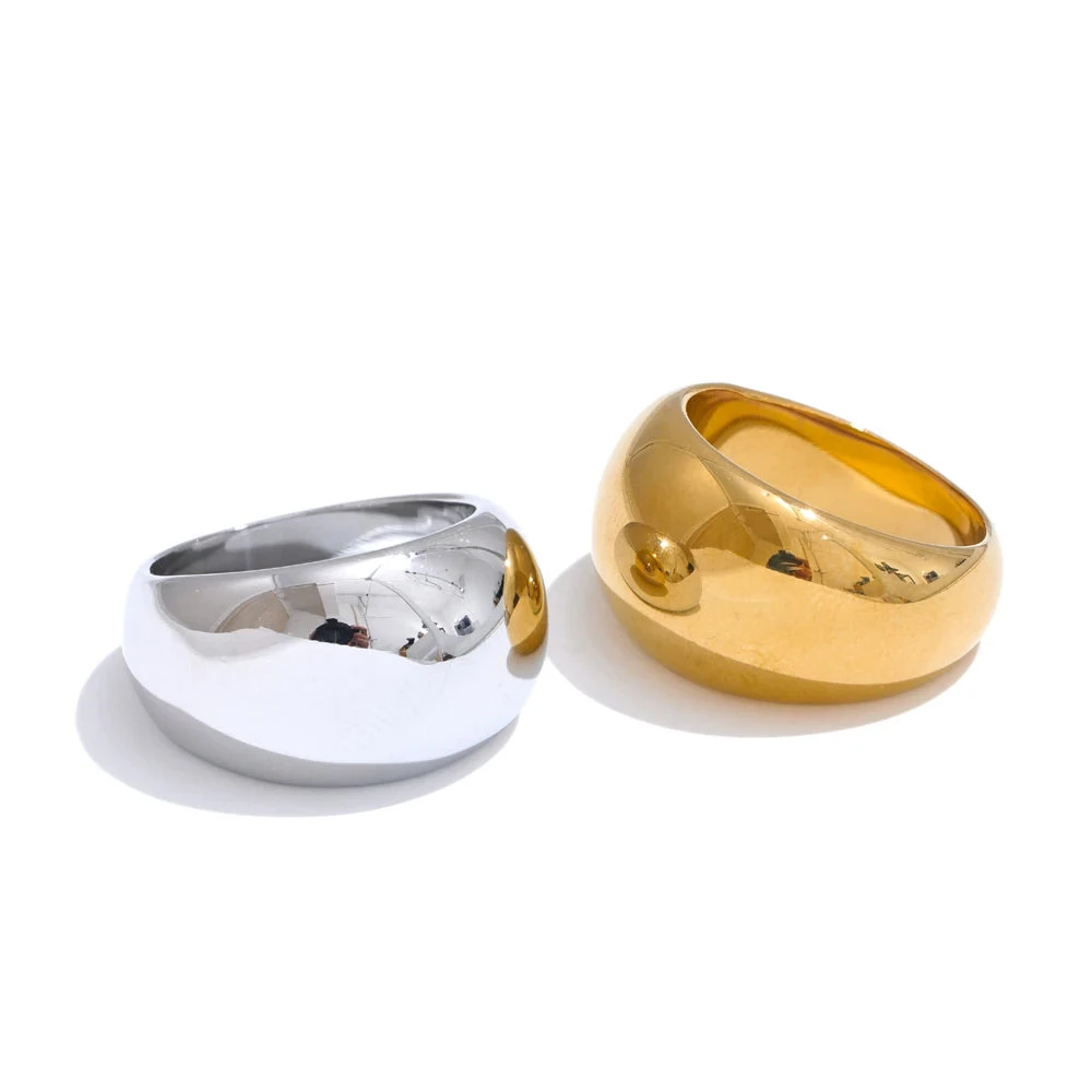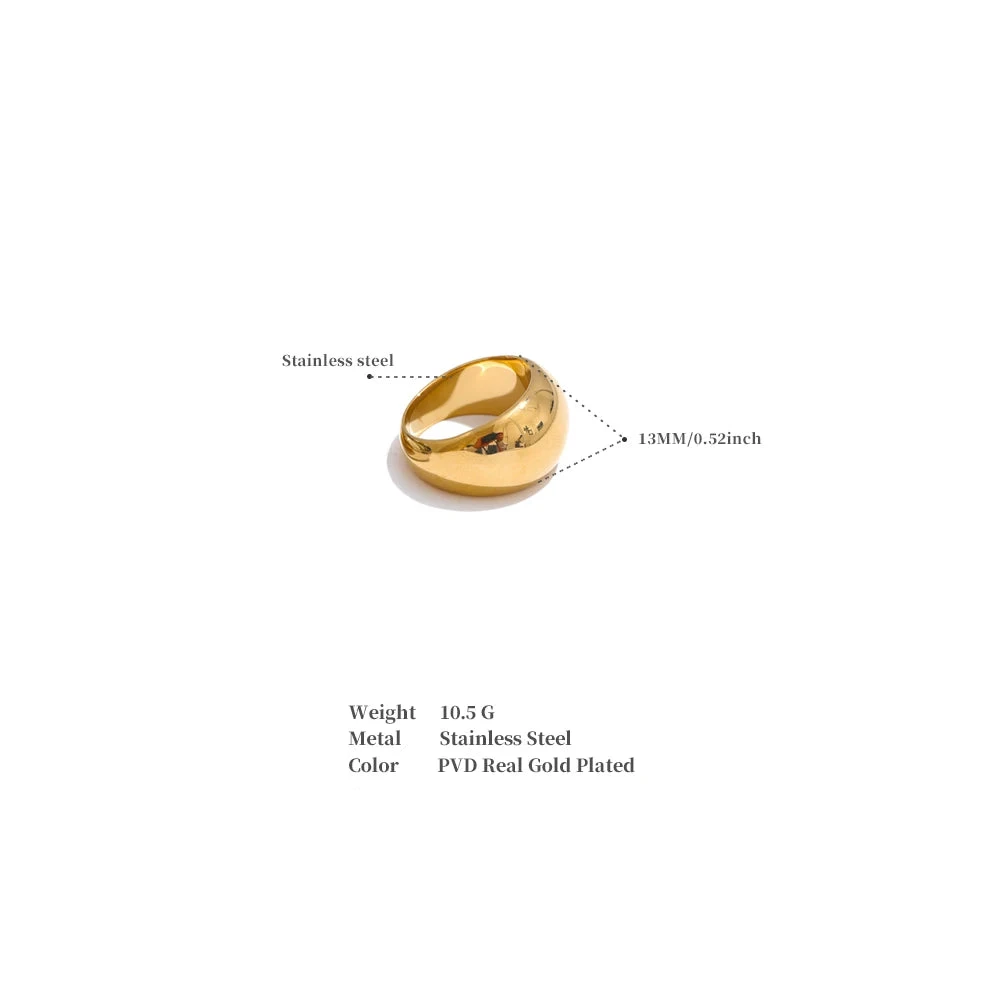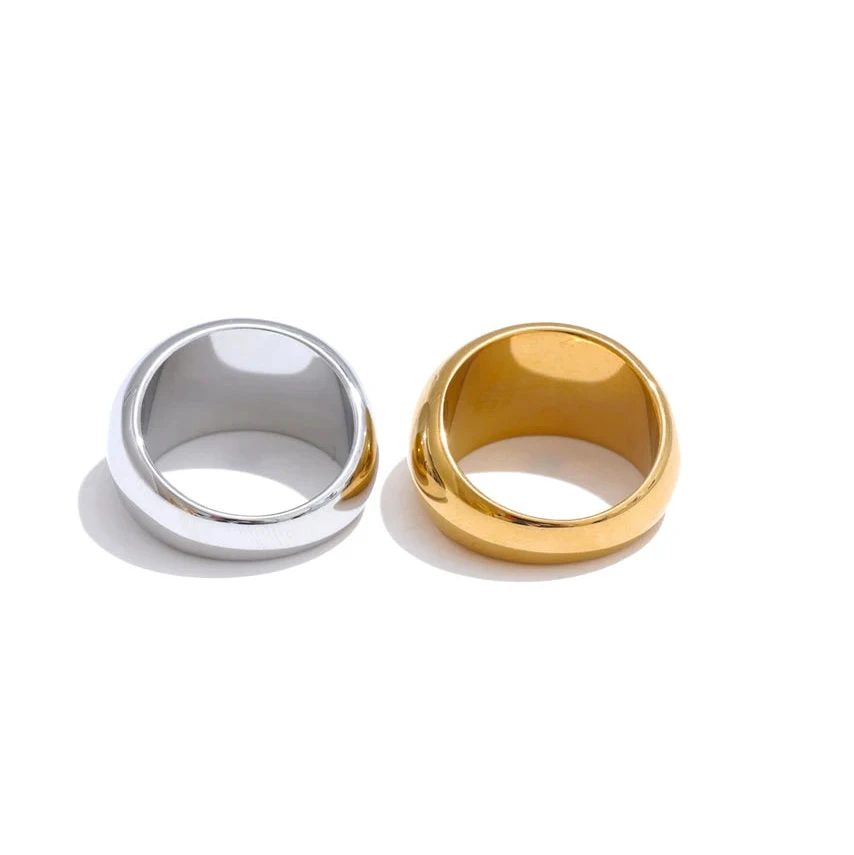 This minimalist chunky ring features a smooth, glossy stainless steel surface with an 18K PVD plating that ensures lasting shine and durability. Its classic design offers a refined, modern aesthetic suitable for everyday wear or special occasions.