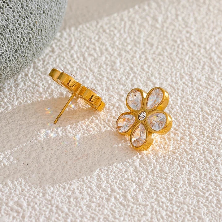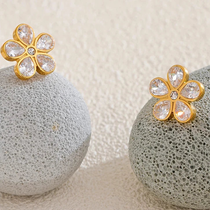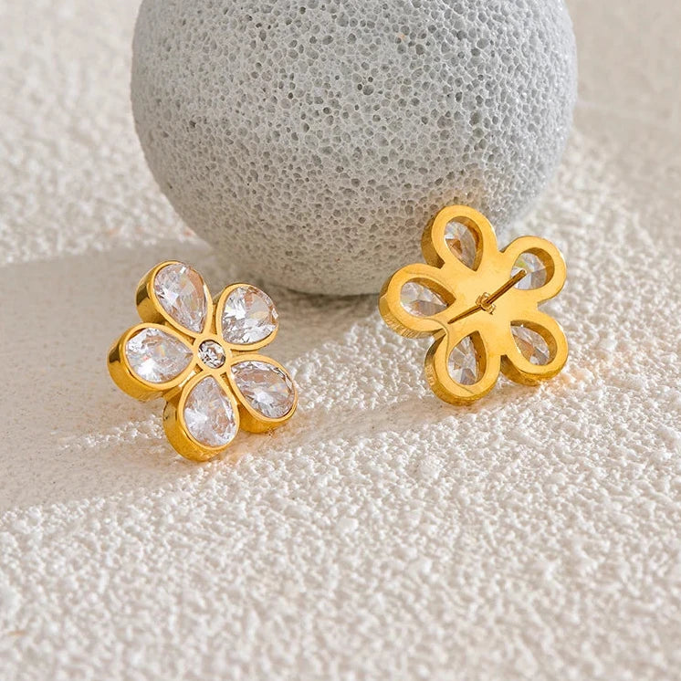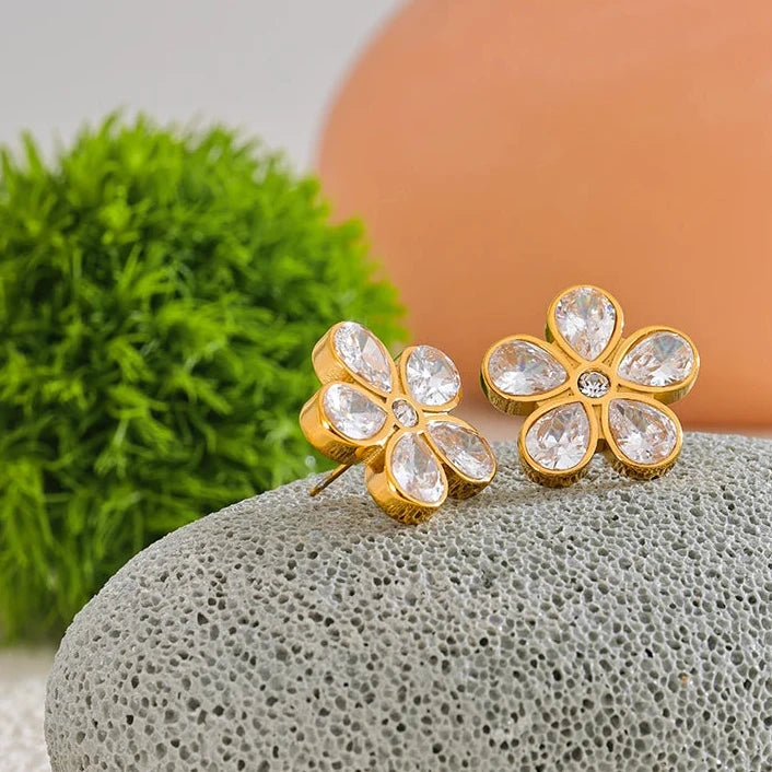 These are 18K gold plated stainless steel stud earrings. Not only are they resistant to water, sweat, and heat, they are also hypoallergenic and skin-friendly, ensuring no discoloration or tarnishing. Keep them safe in the included reusable pouch.