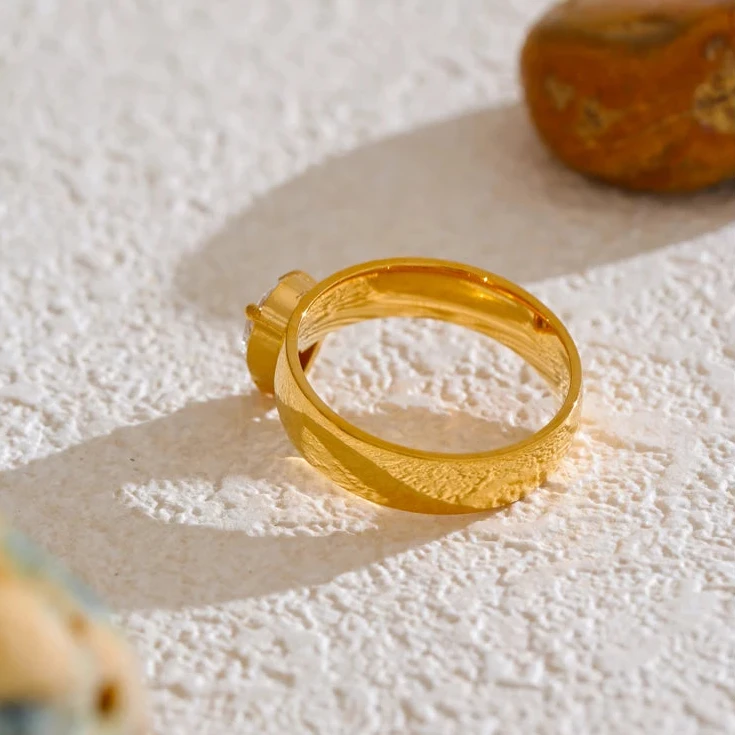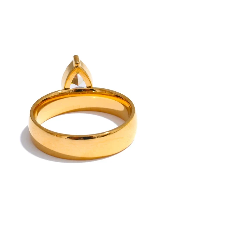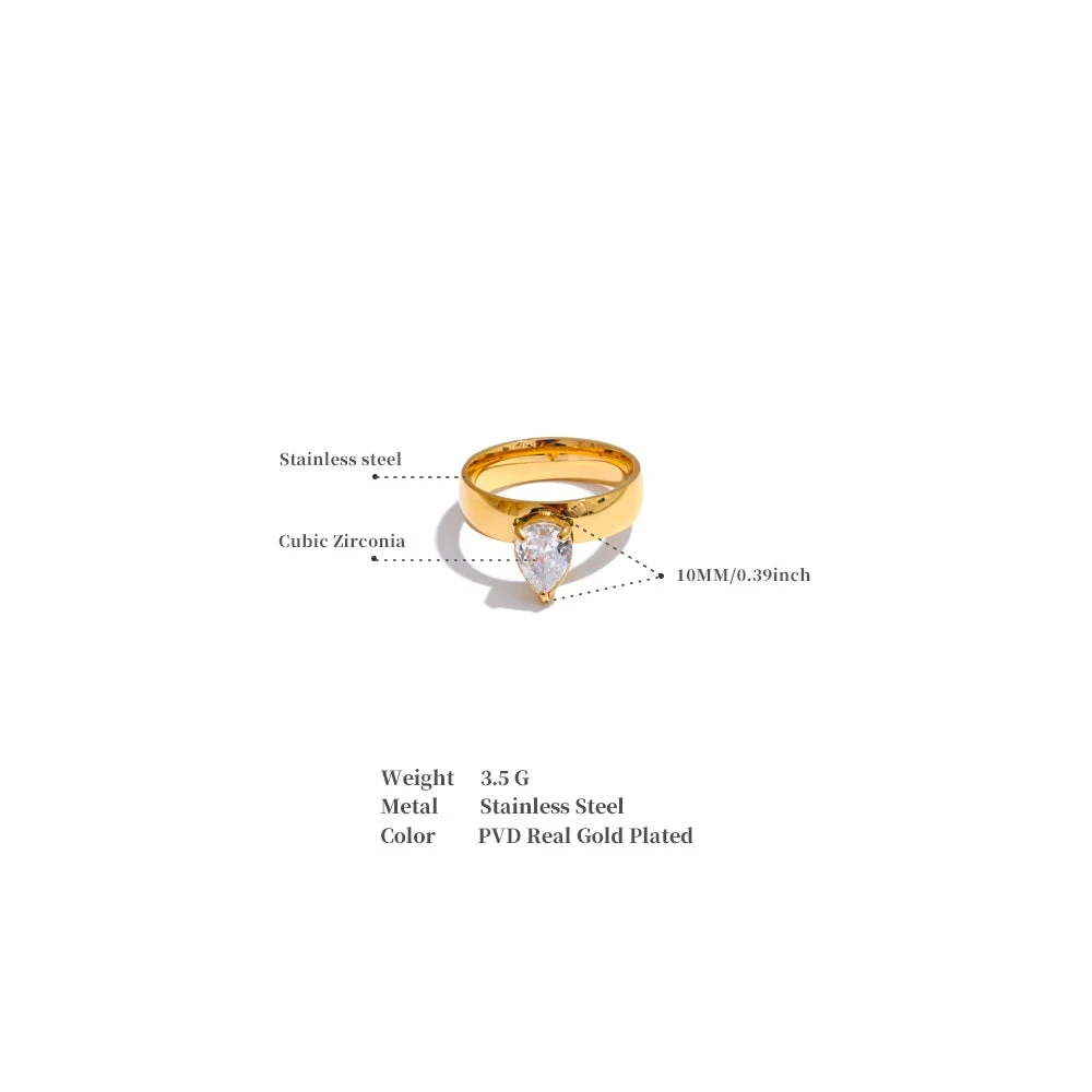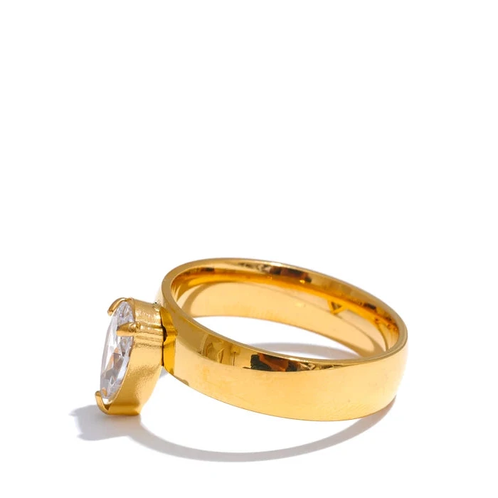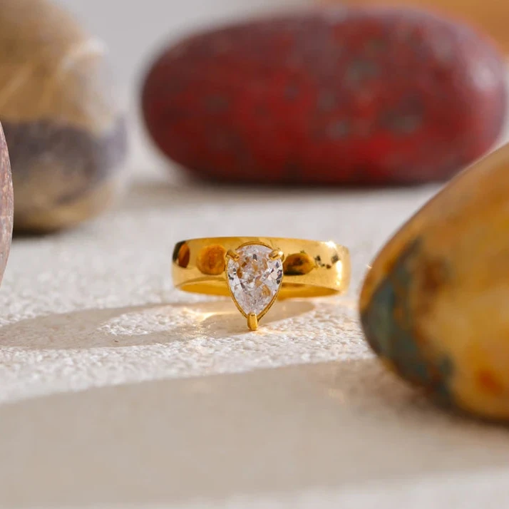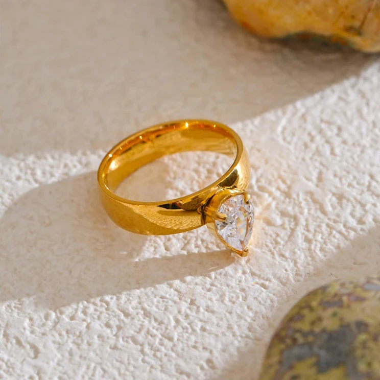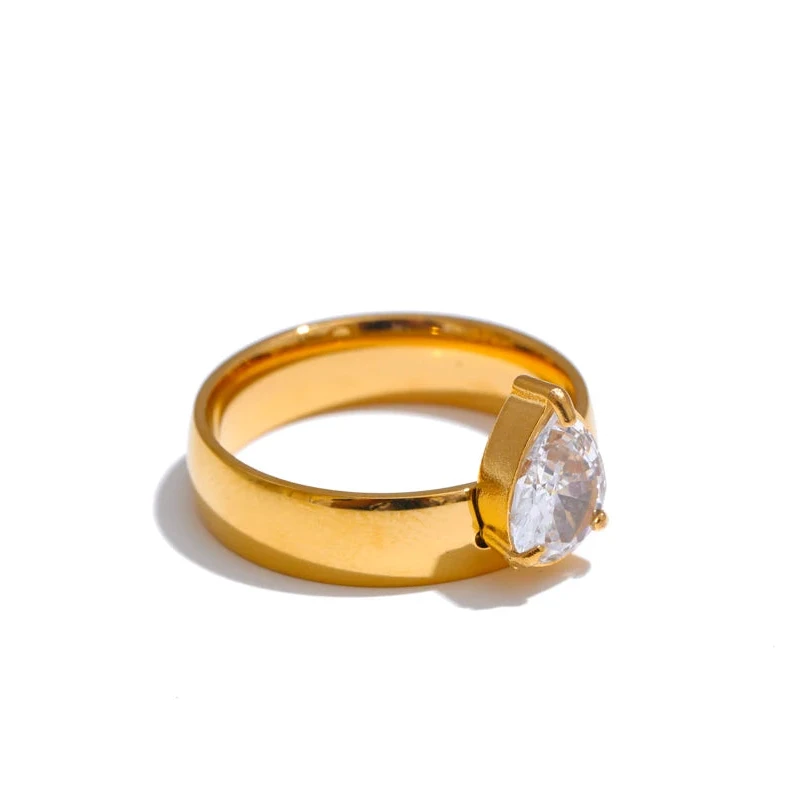 Elevate your style with the Ray ring, featuring a high-quality golden band adorned with a shimmering cubic zirconia water drop. Its geometric design combines elegance and modernity, offering a delicate yet striking accessory.