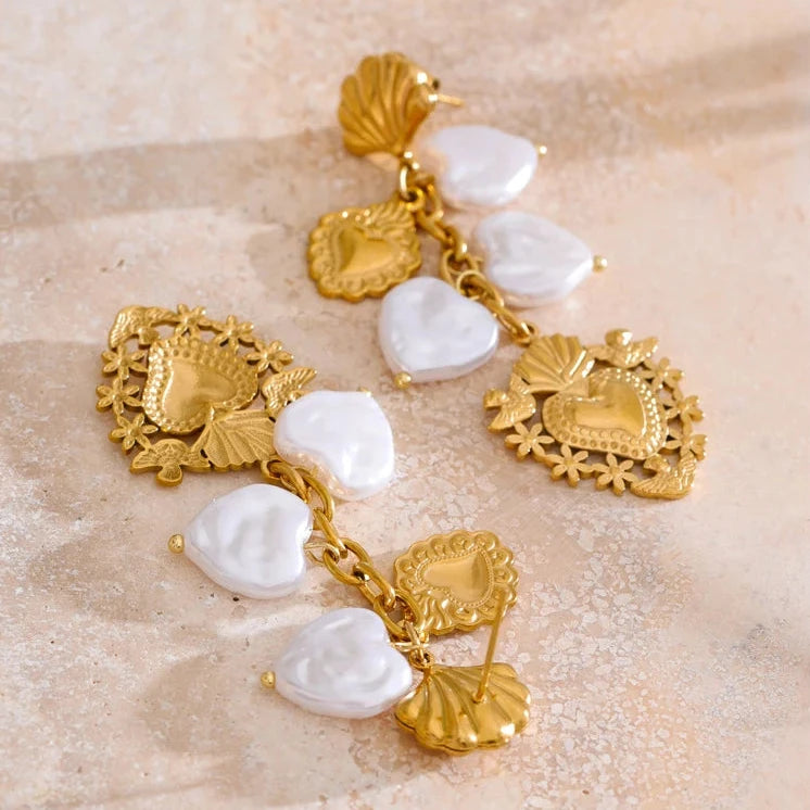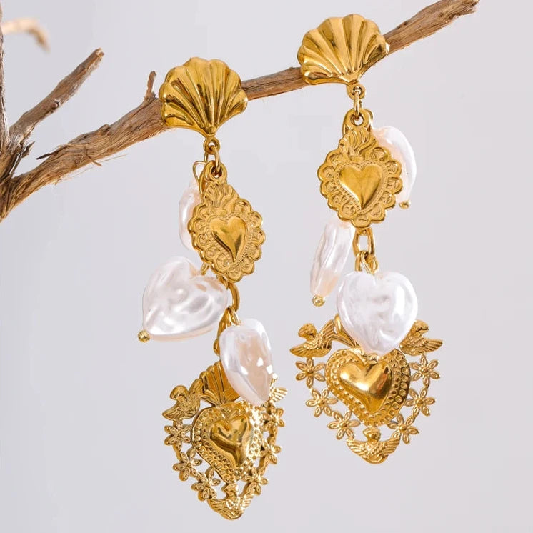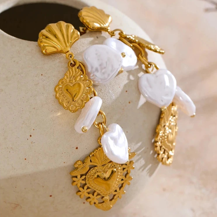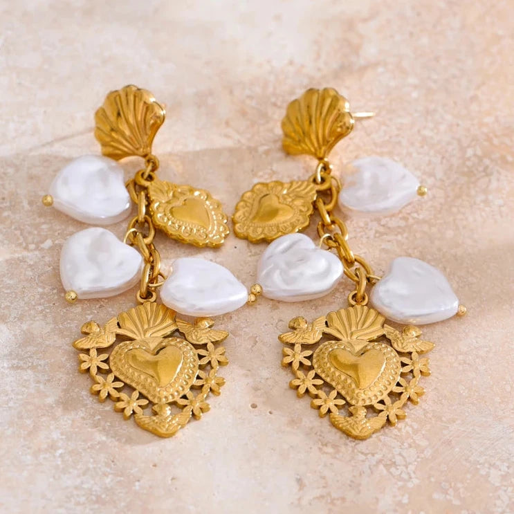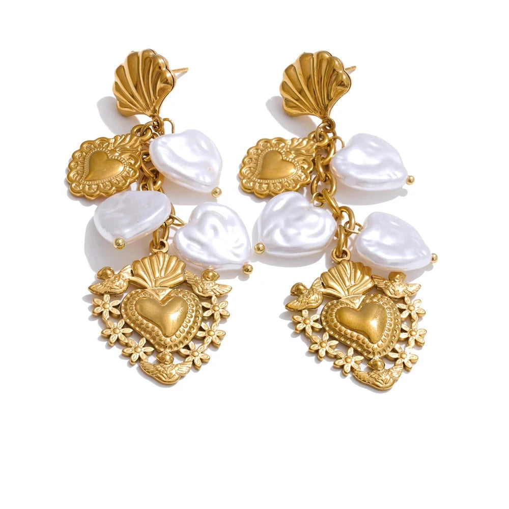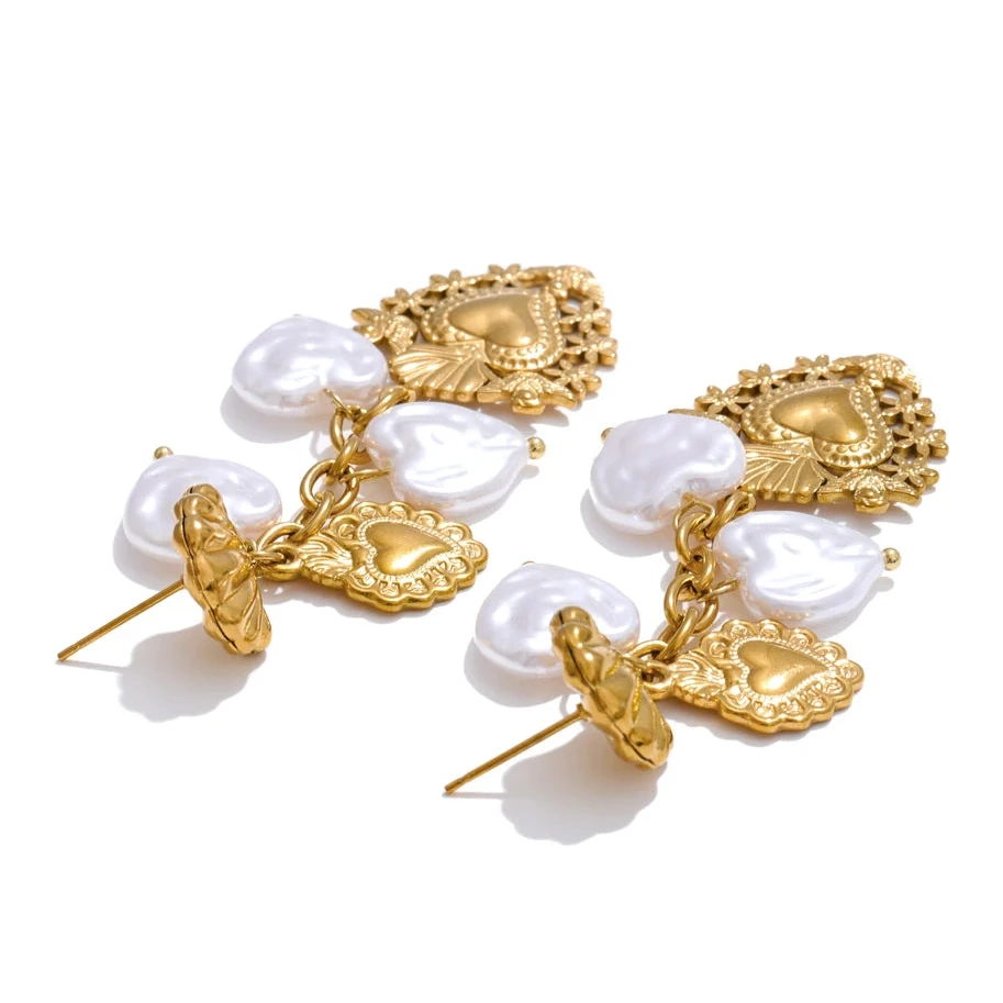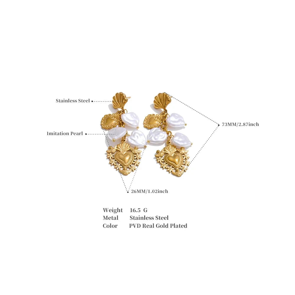These Baroque imitation pearl earrings feature a heart-shaped drop design, combining classic elegance with contemporary charm. Crafted from stainless steel with a golden PVD plating, they offer durability and a luxurious finish.