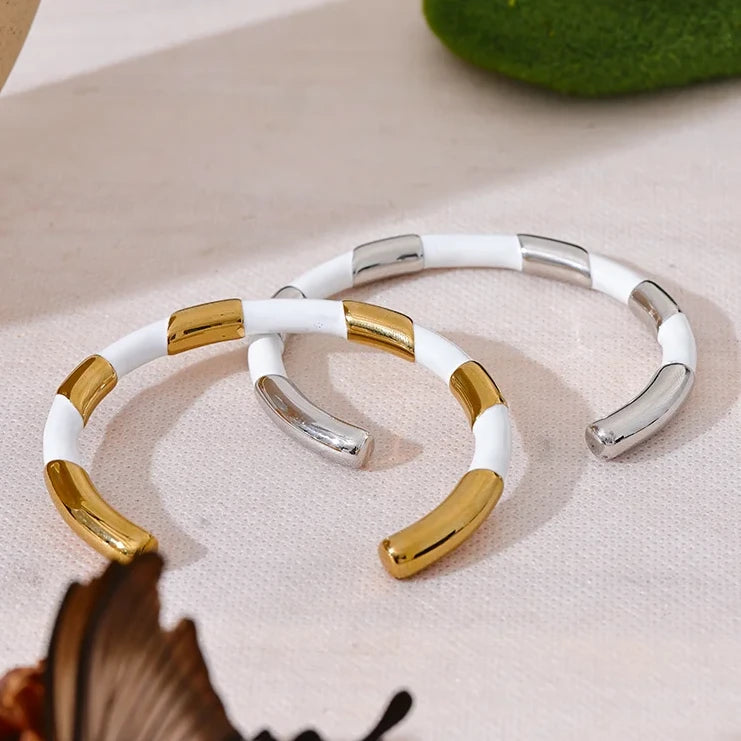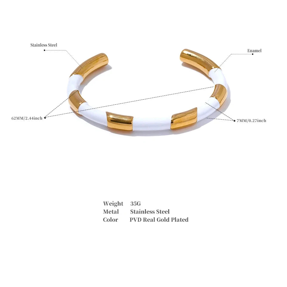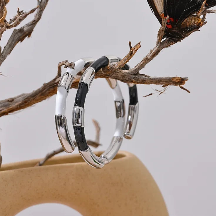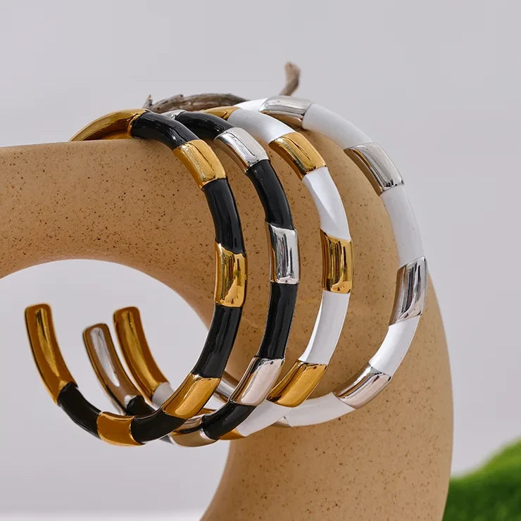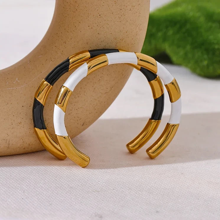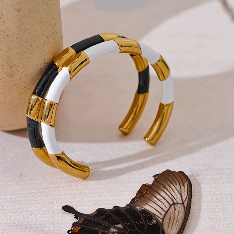 This unique cuff bracelet is crafted from black and white enamel on stainless steel, making it both stylish and durable. The open hand design adds a trendy touch to any outfit, and its textured surface adds a subtle elegance. Elevate your wrist game with this bracelet.
