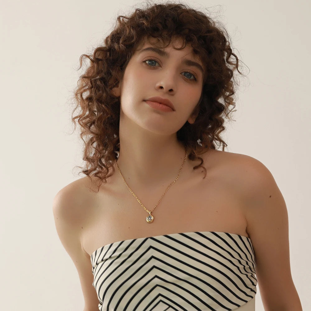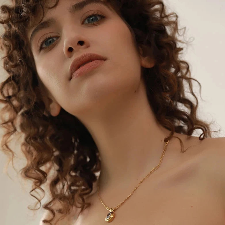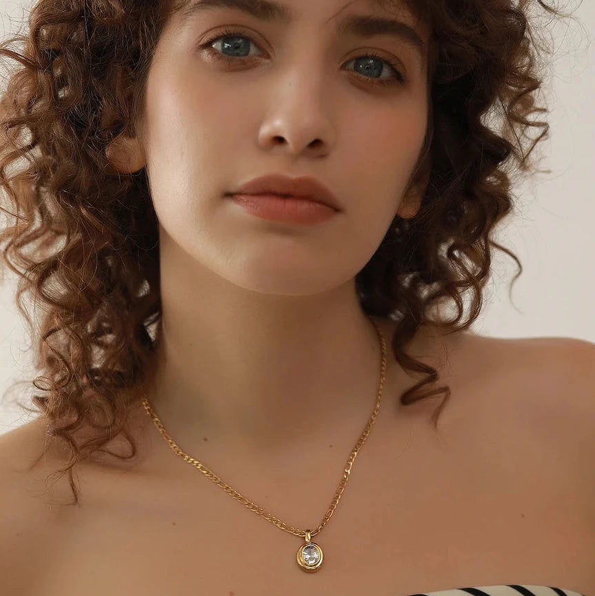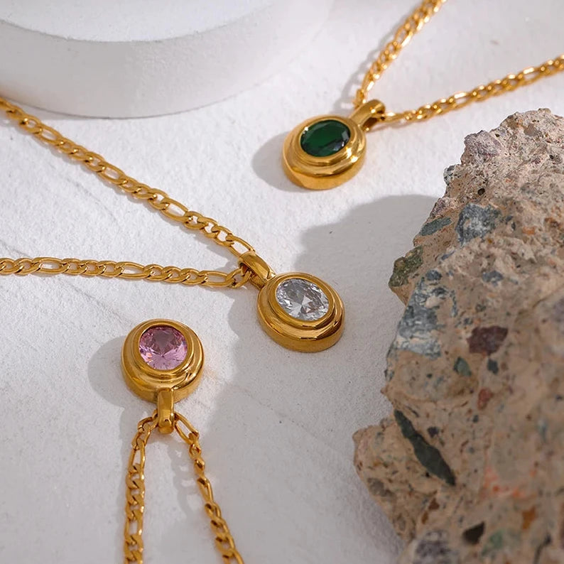 This necklace is crafted with stainless steel and features a sparkling cubic zirconia pendant in a unique geometric oval shape. It's the perfect accessory to add a touch of elegance and style to any outfit. With a delicate golden chain, this necklace is sure to make a statement.