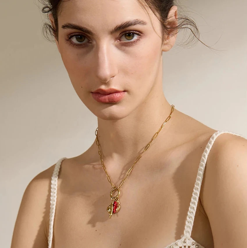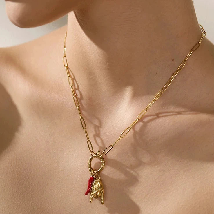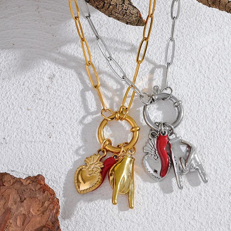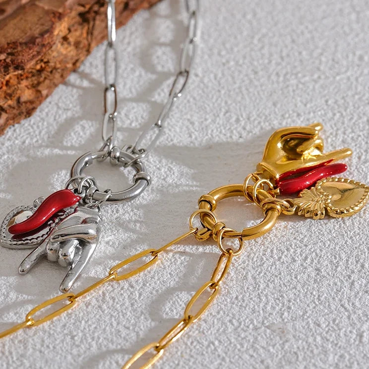 Enhance your style with the red chilli heart charms pendant necklace. Made of durable stainless steel, this piece features an attractive charm that adds a unique touch to your look. Perfect accessory for a statement.