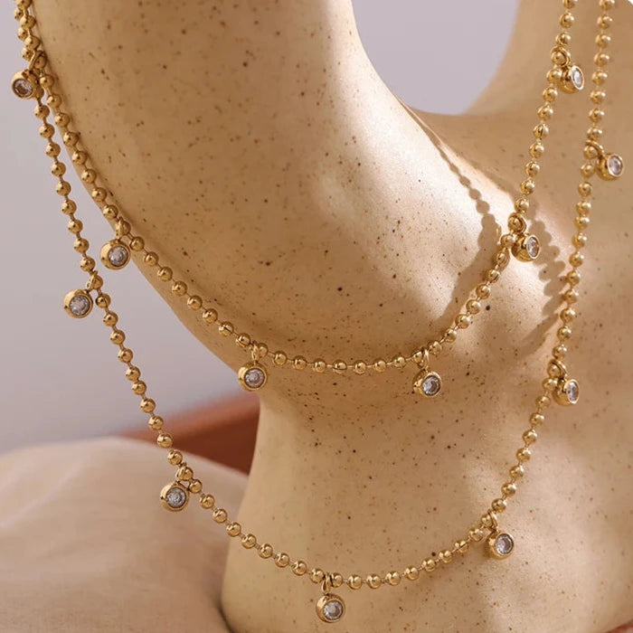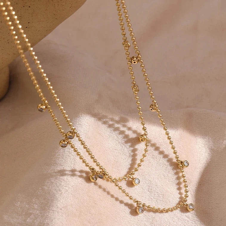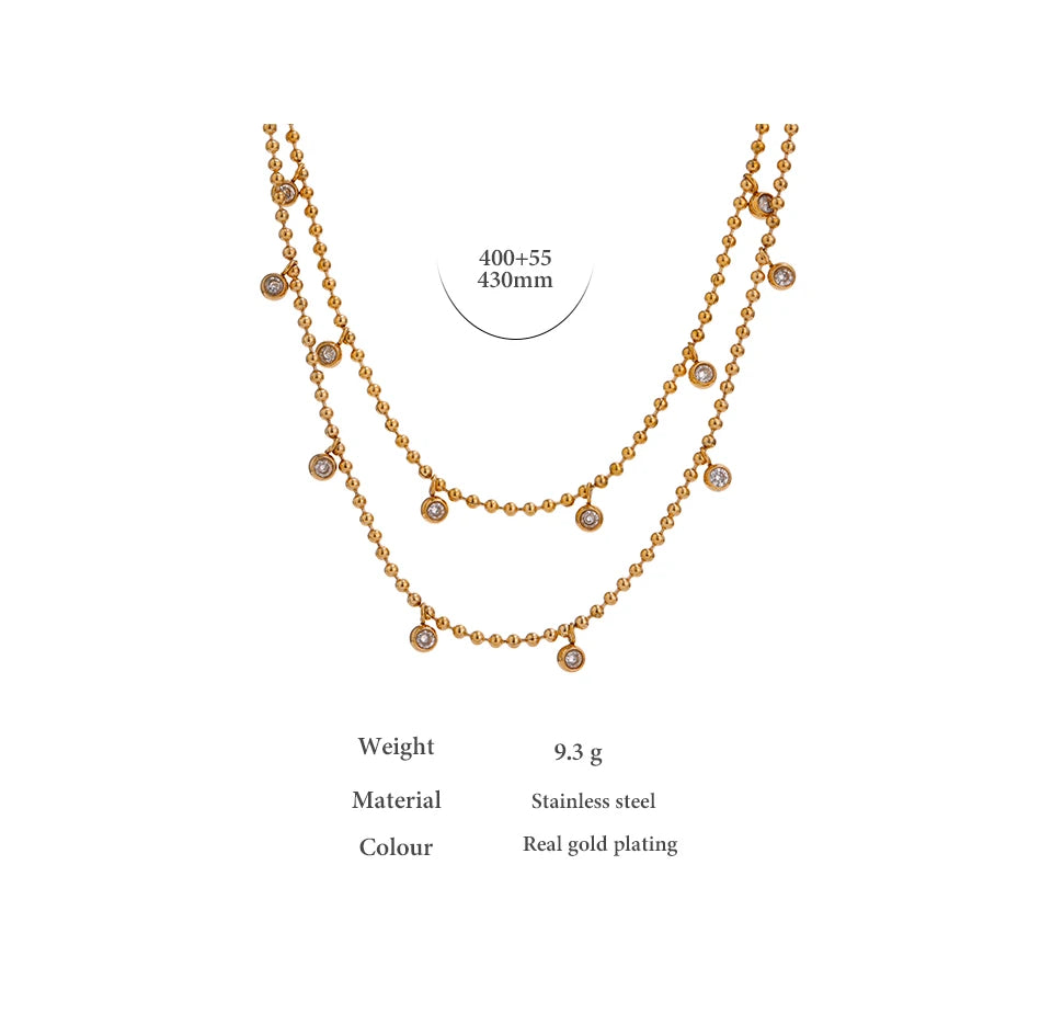 This double layered necklace features sparkling cubic zirconia beads for a chic and elegant look. Made with durable stainless steel, it is perfect for any occasion, whether it's a party or a formal event. Add a touch of sophistication to your outfit.