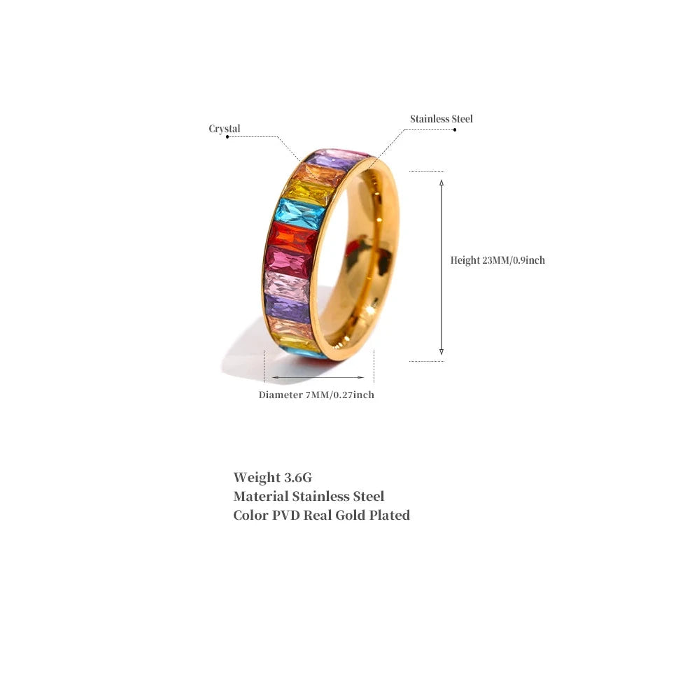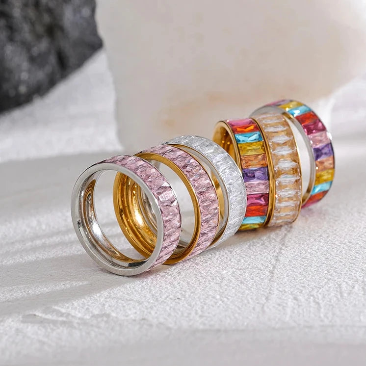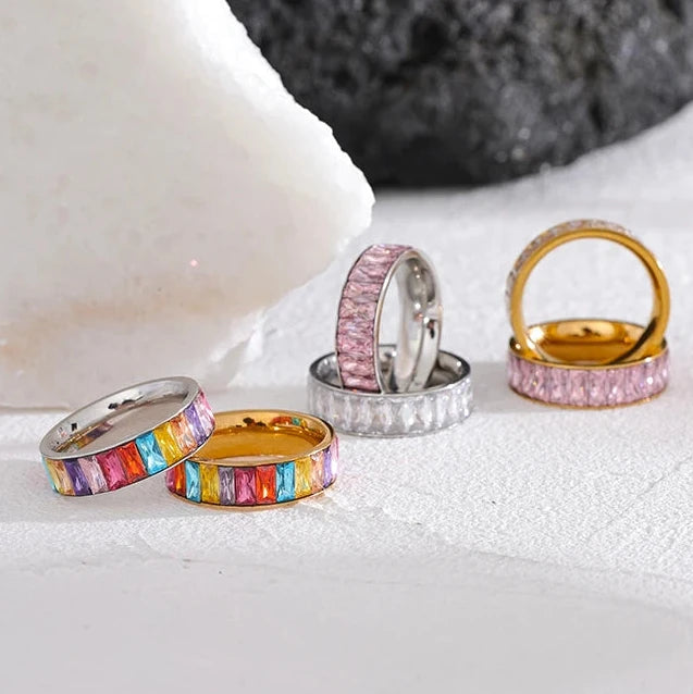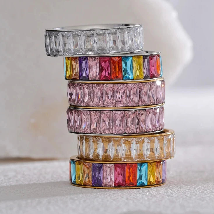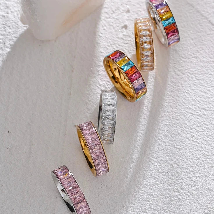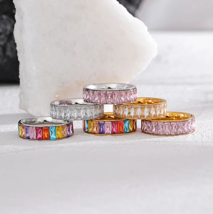 Made with high quality stainless steel and delicate, colourful cubic zirconia, this ring is the perfect blend of luxury and fashion. With its shiny finish and popular bling design, you'll be sure to turn heads and make a lasting impression.