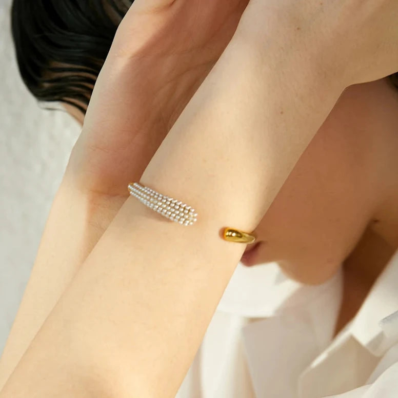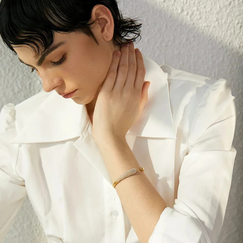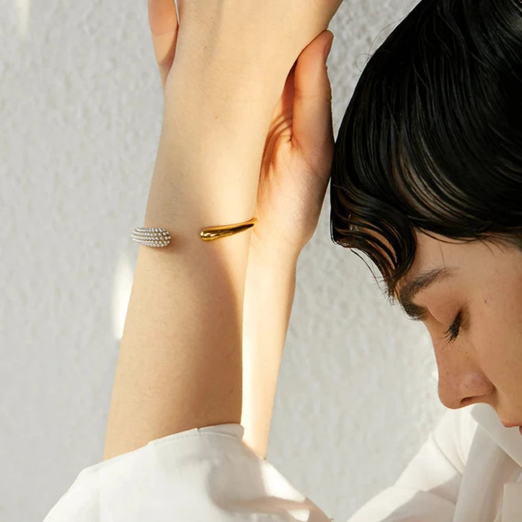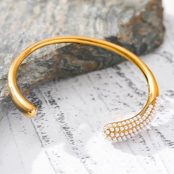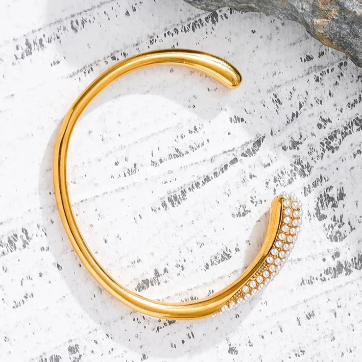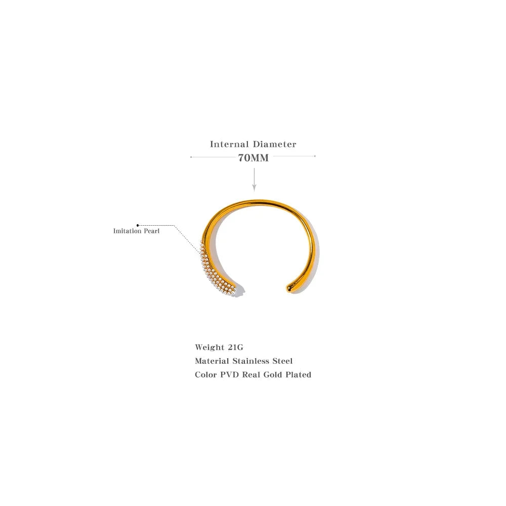 This bangle features elegant imitation pearls and a geometric stainless steel design with a 18K gold colour finish. Made with high-quality materials for a sophisticated and timeless look.