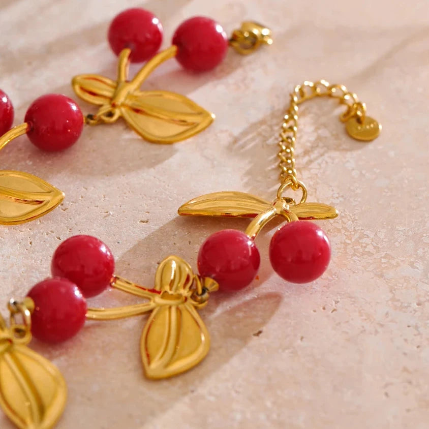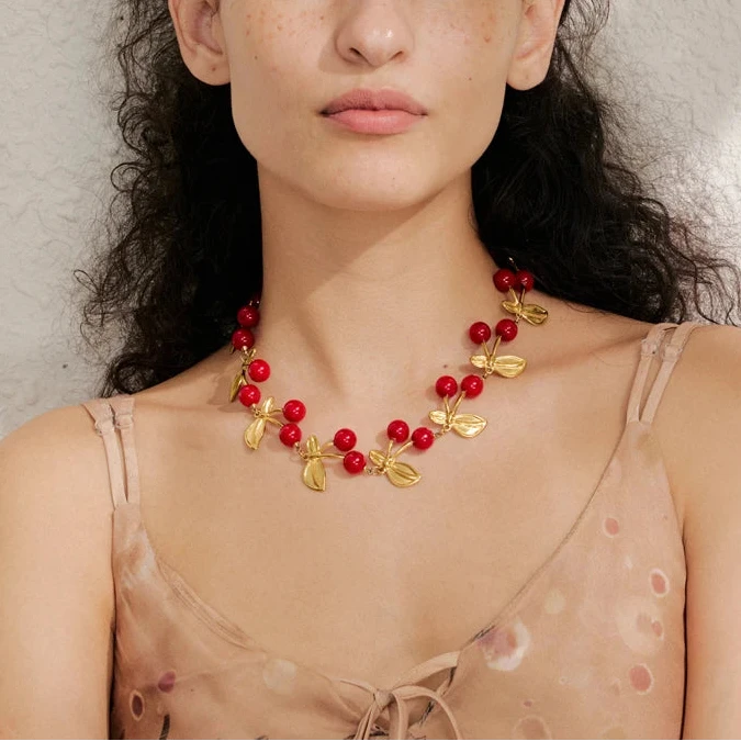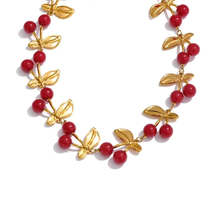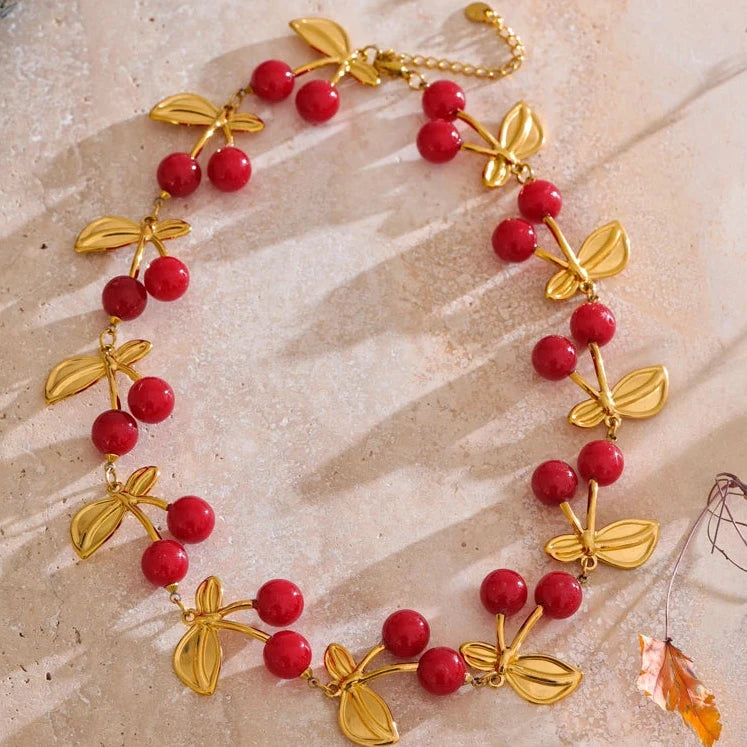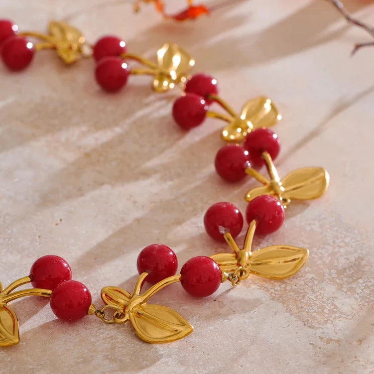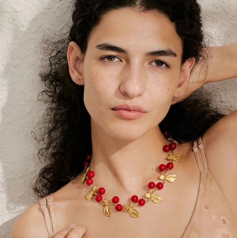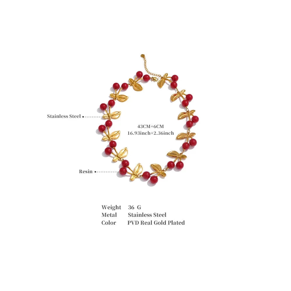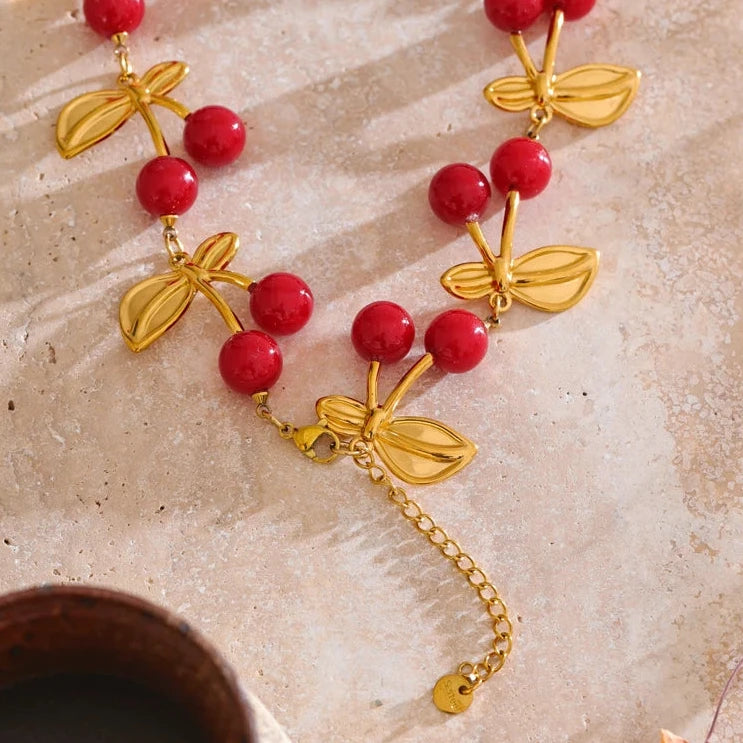Elevate your style with the gorgeous Ceri necklace, featuring an exclusive red resin cherry charm meticulously handmade for a unique touch. It is a standout piece to add to any collection.