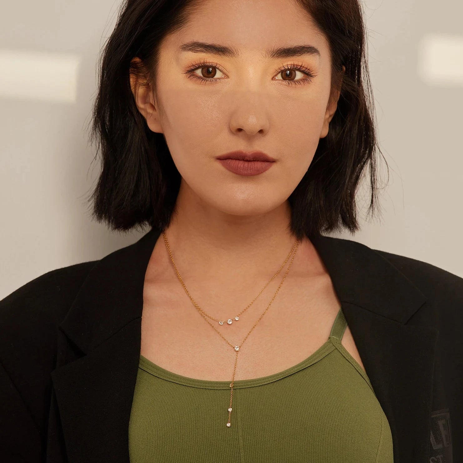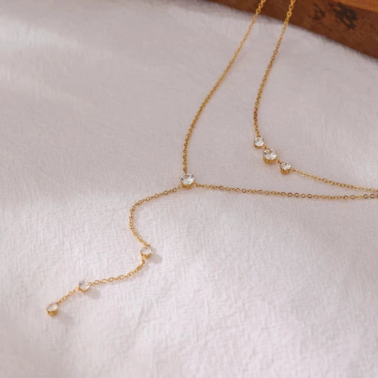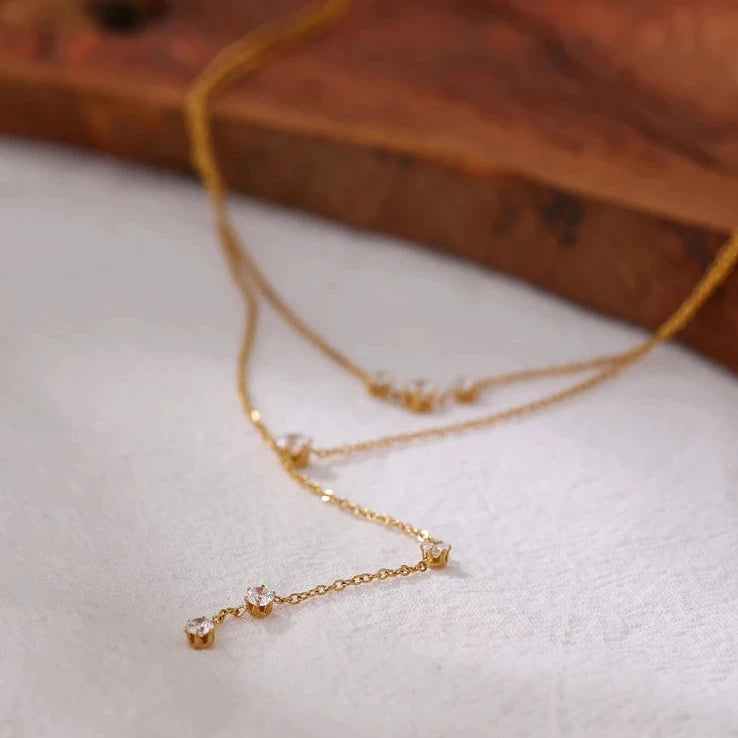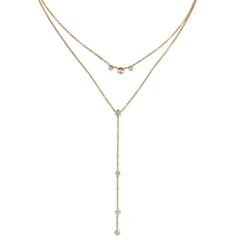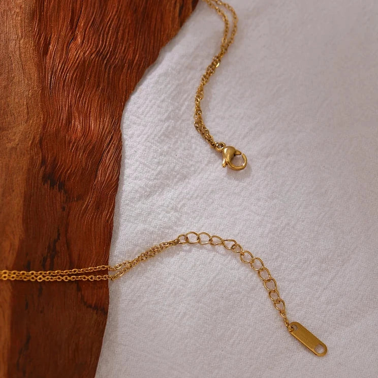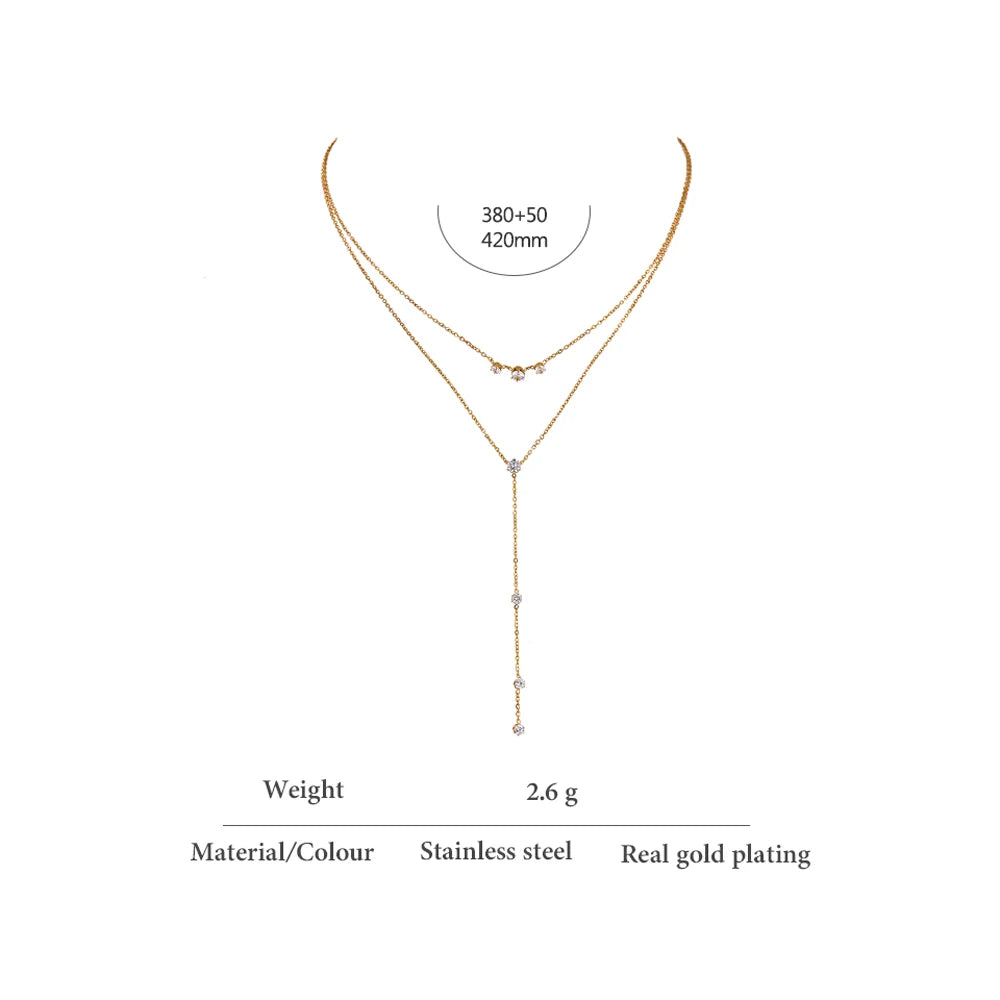 This necklace exudes elegance with its exquisite cubic zirconia pendant and layered stainless steel chain. The bling adds a touch of glamour to any outfit, making it the perfect accessory. Upgrade your style with this 18K gold plated necklace.