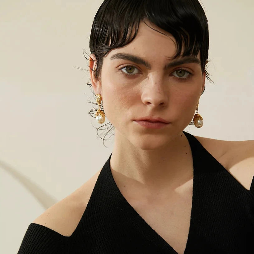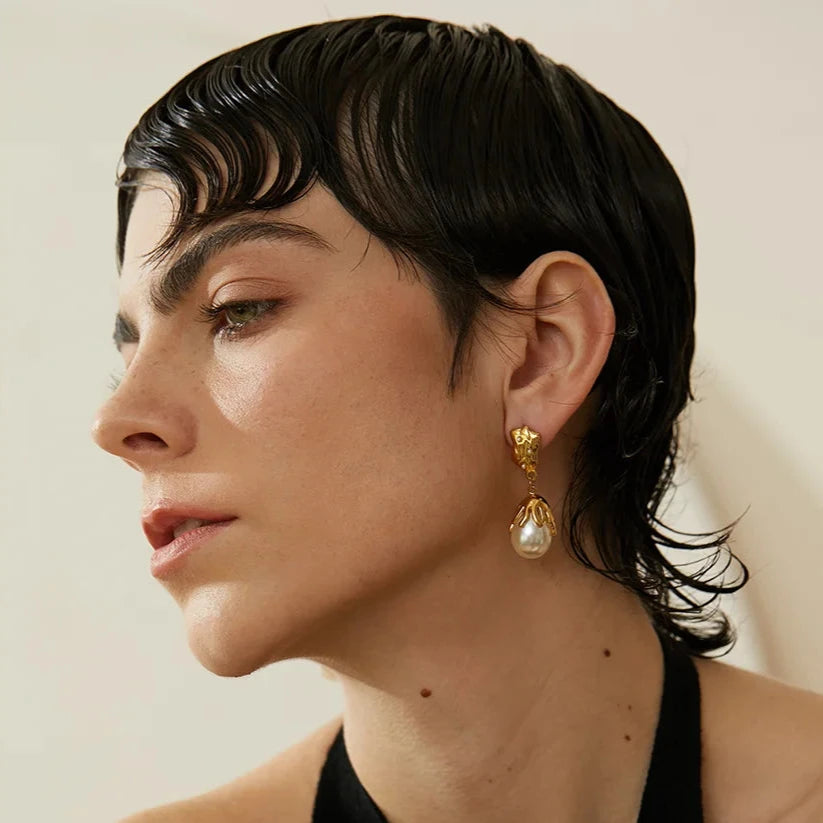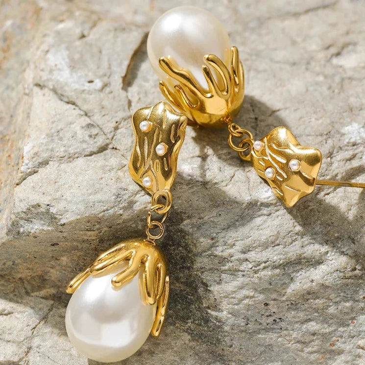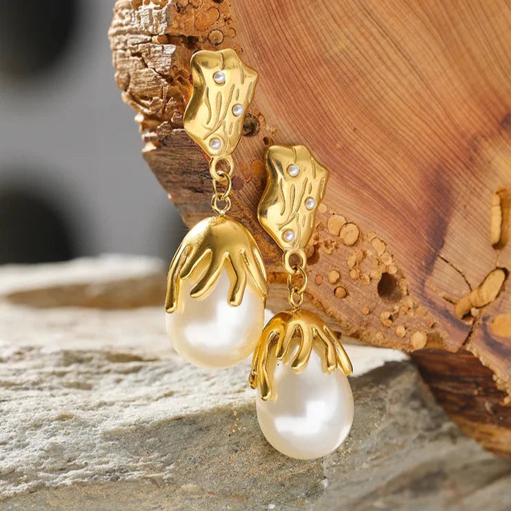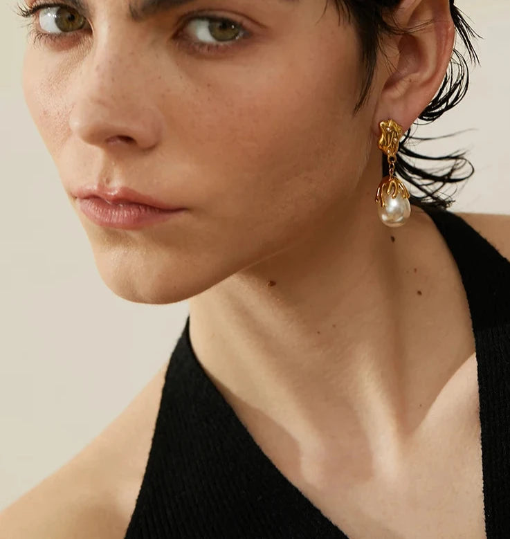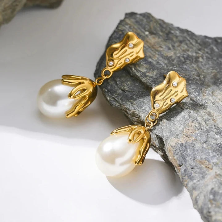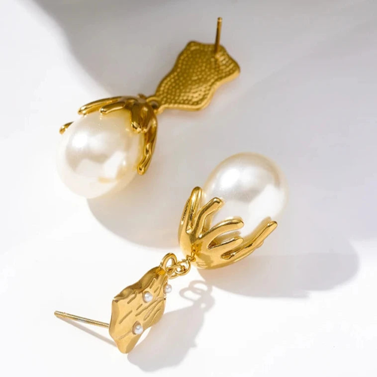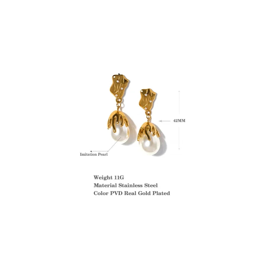 Enhance your elegance with these exquisite imitation pearl earrings. Crafted from stainless steel with a gold finish, they feature a unique geometric design that adds a touch of charm to any outfit.