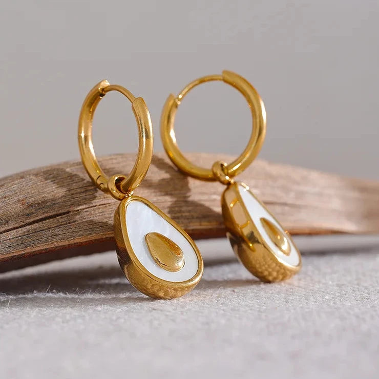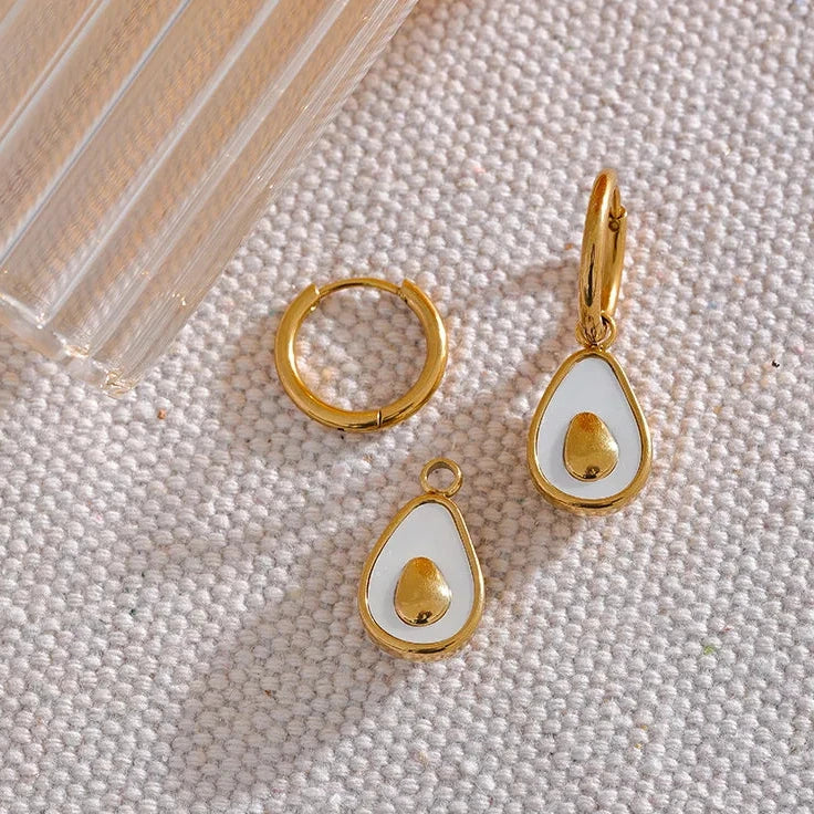 The Ava earrings are the cutest golden avocado drop huggies. Crafted with natural shell, they add a touch of charm to any outfit. Made with 18K gold plated stainless steel, this piece is water, sweat, and heat resistant, ensuring no discoloration or tarnishing. Hypoallergenic and skin-friendly, it comes in a cute reusable pouch for easy storage.