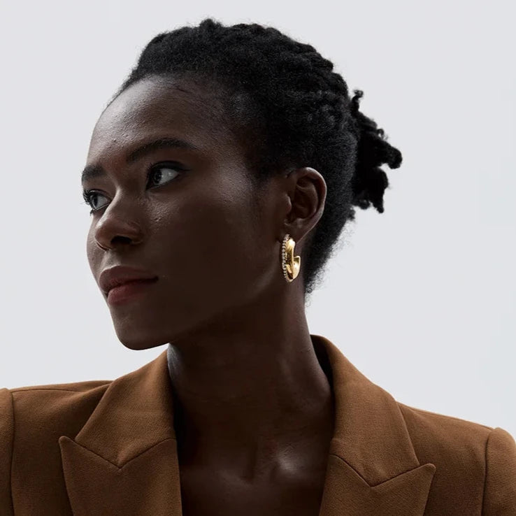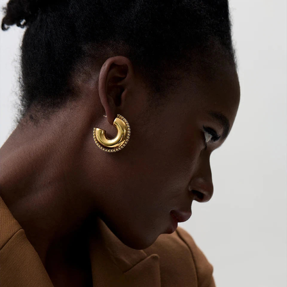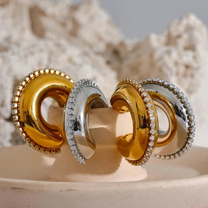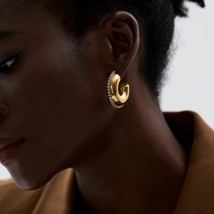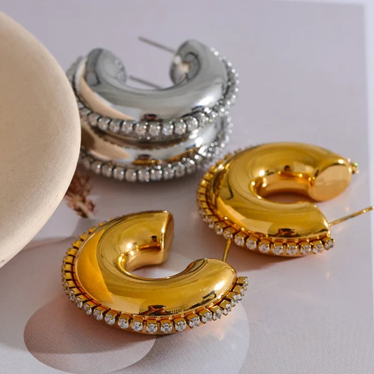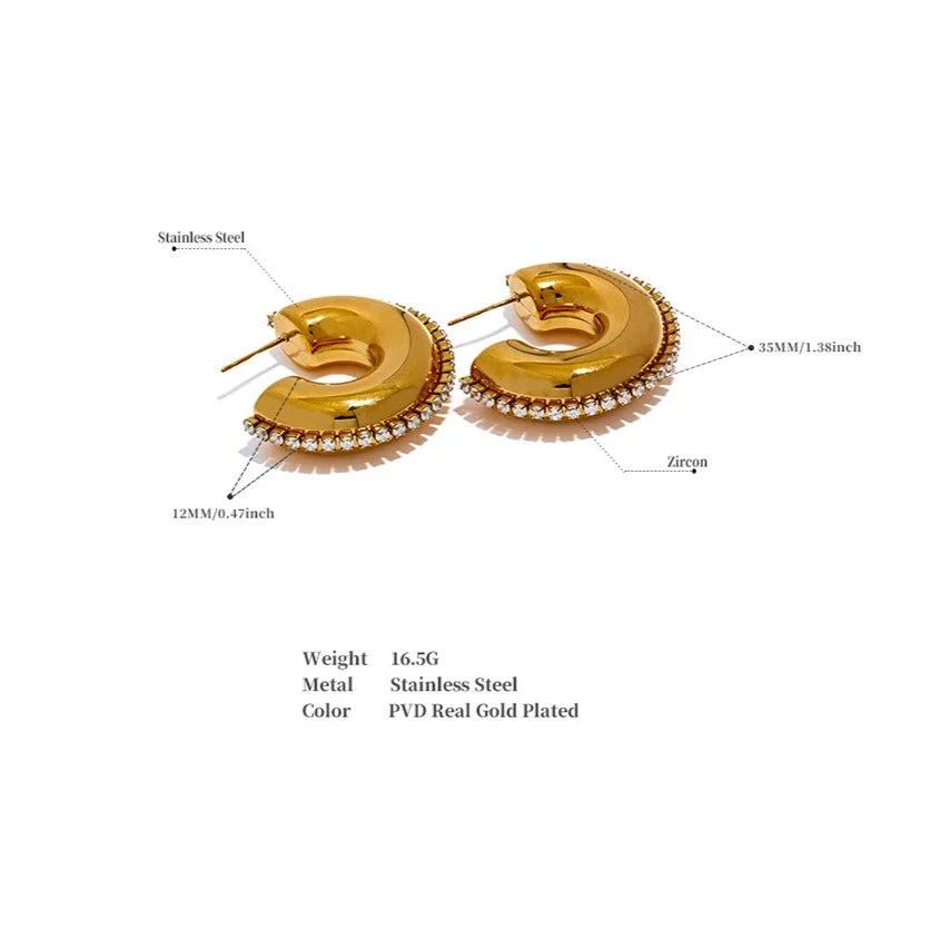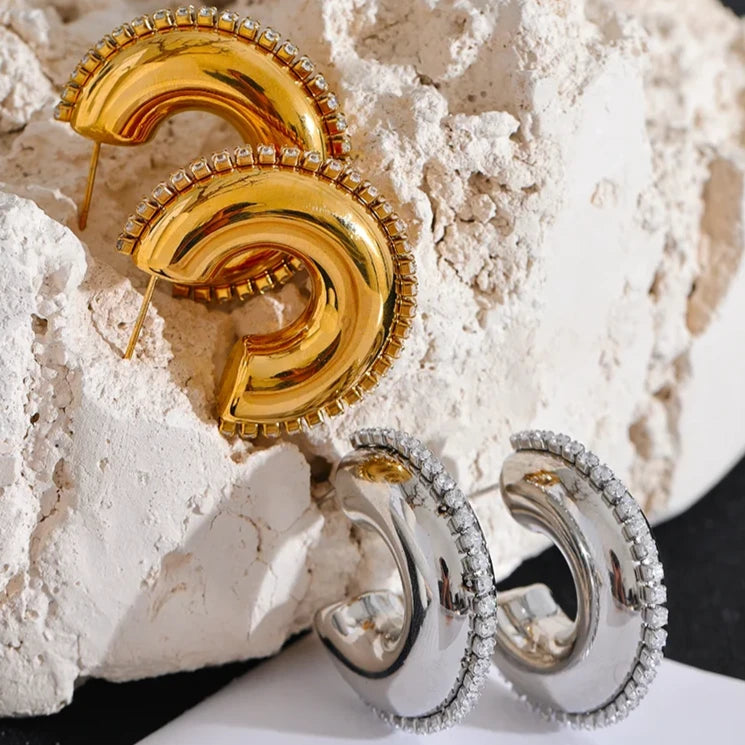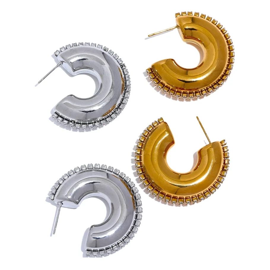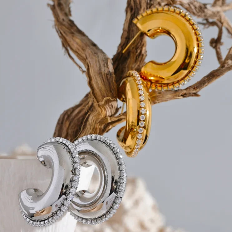 These earrings feature a sleek C shape design that exudes both chic and edgy vibes. Made from high-quality stainless steel, these earrings are adorned with sparkling cubic zirconia for a touch of glamour.