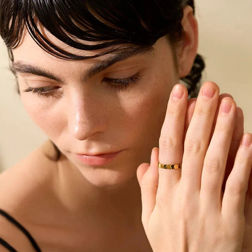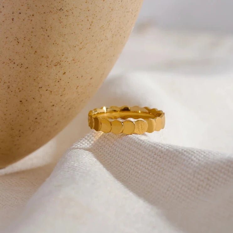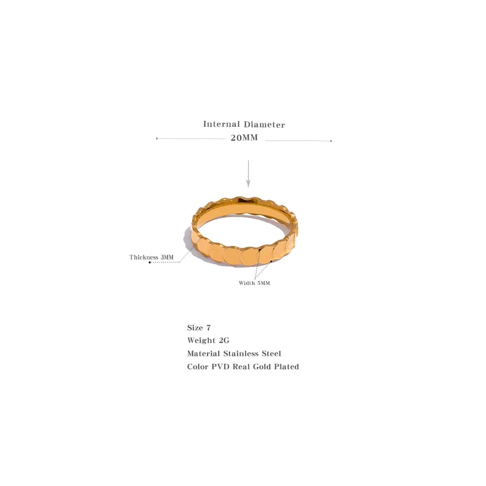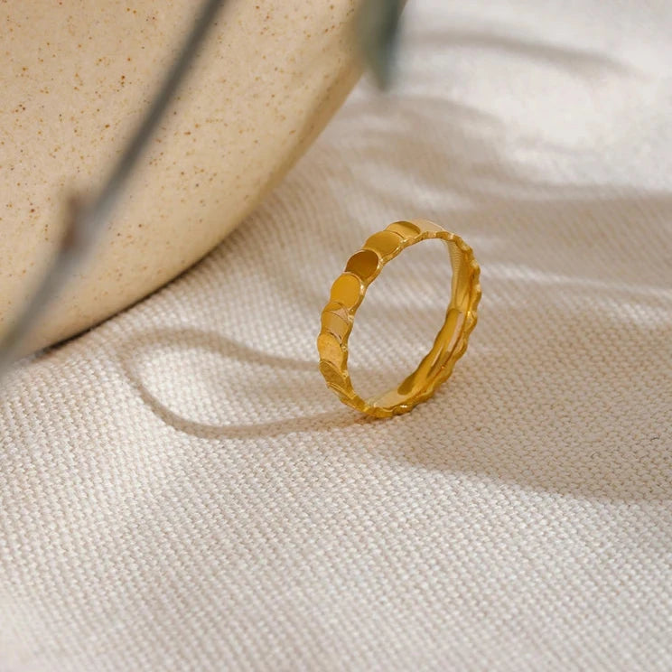 This minimalist stainless steel round texture ring features a sleek 18k gold plating and is completely waterproof. Its charm makes it a perfect gift for women who value both style and functionality. Elevate any outfit with this elegant and durable piece.
