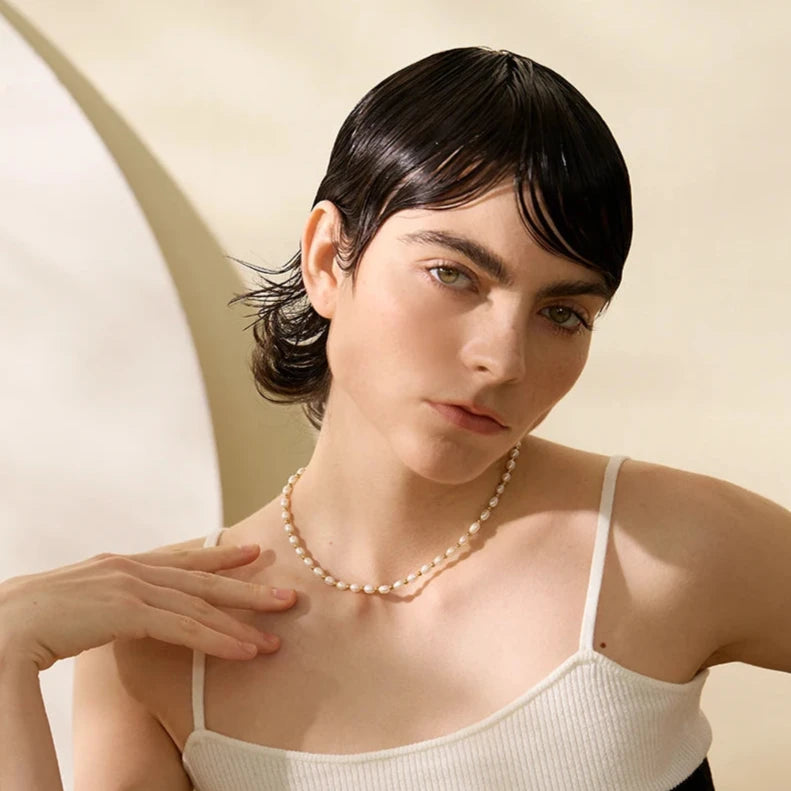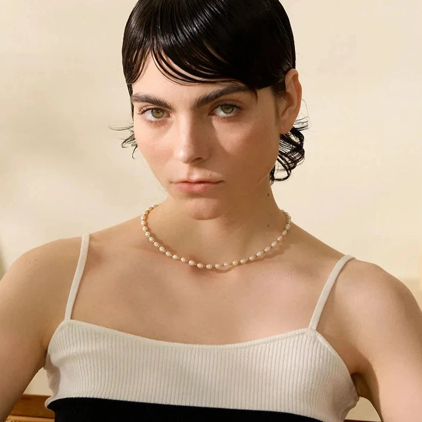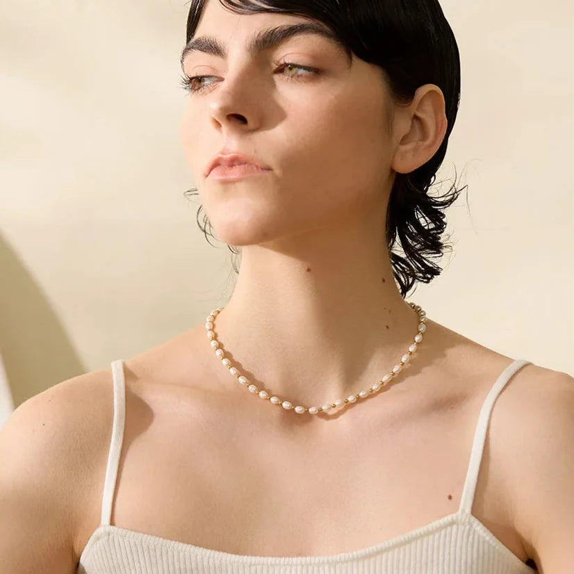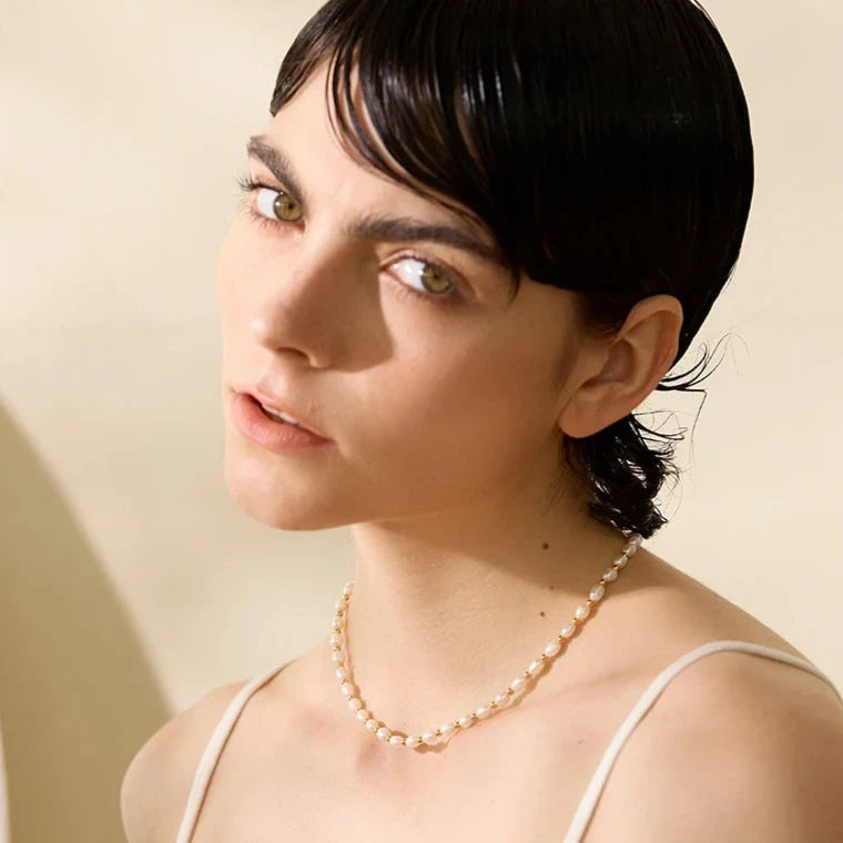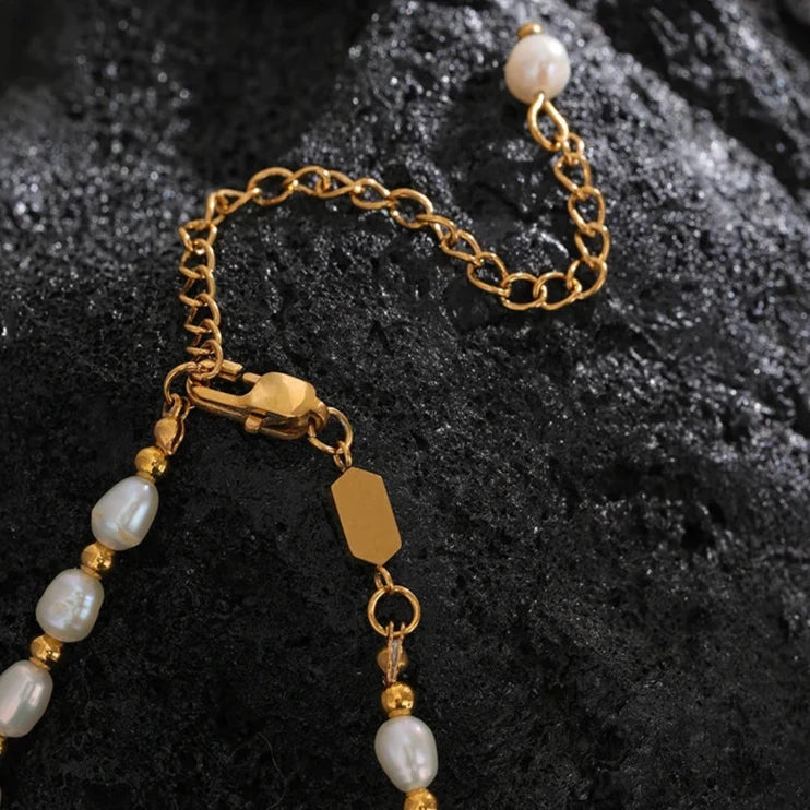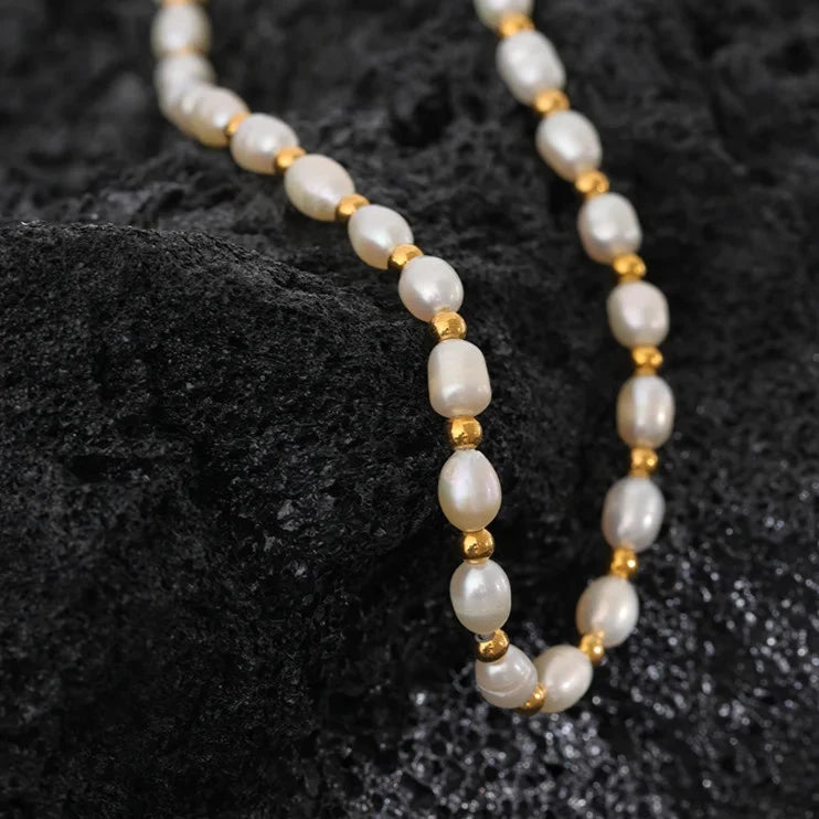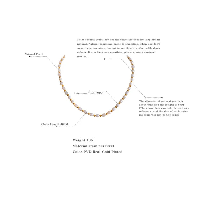 This necklace features natural freshwater pearls and stainless steel beads in a waterproof design. The gold colour adds a touch of luxury to any outfit, making it a perfect gift for women who appreciate handmade jewellery.