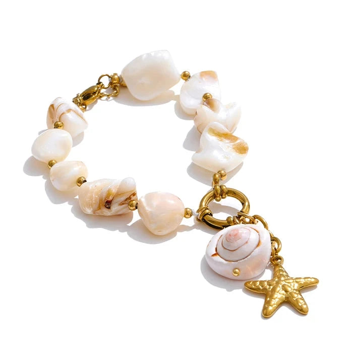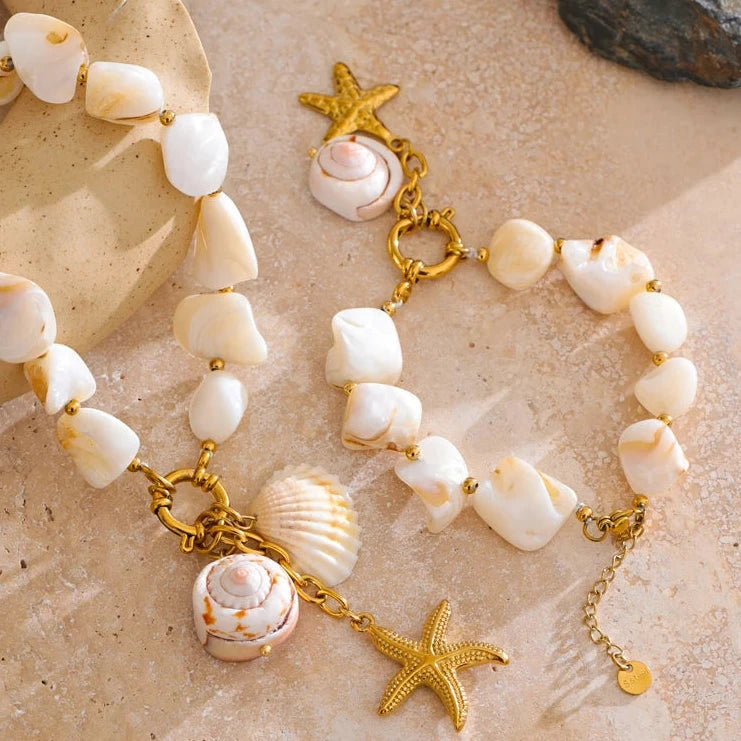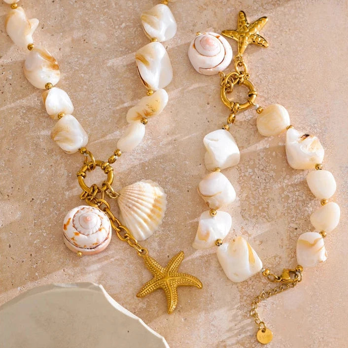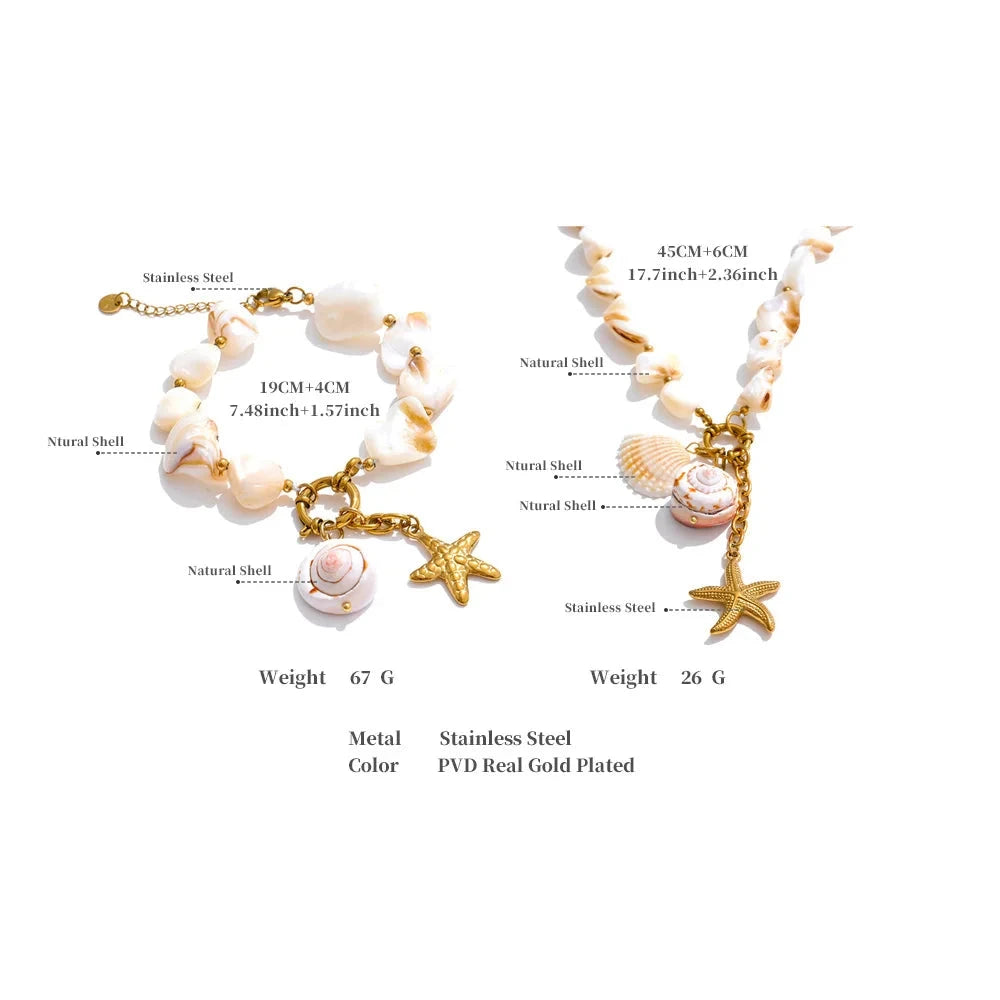 Embrace the essence of summer with this ocean style shell chain featuring conch and starfish charms crafted from durable stainless steel. This set offers versatile elegance perfect for beach outings or casual wear.