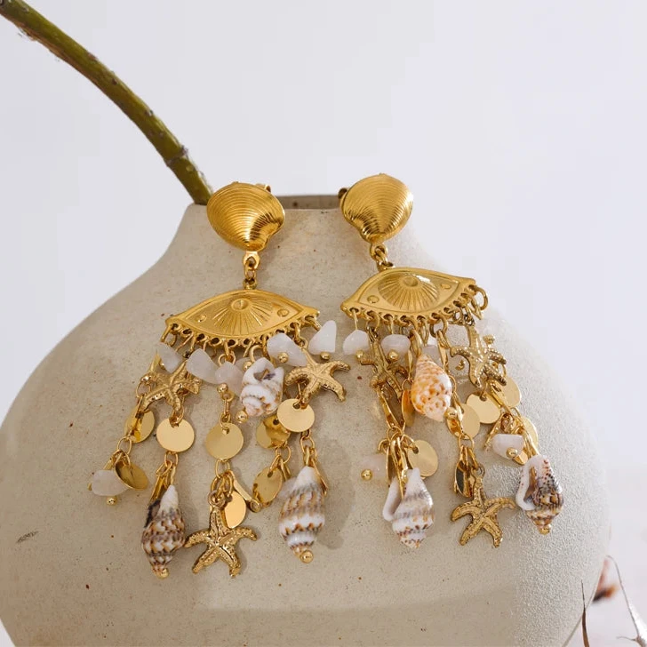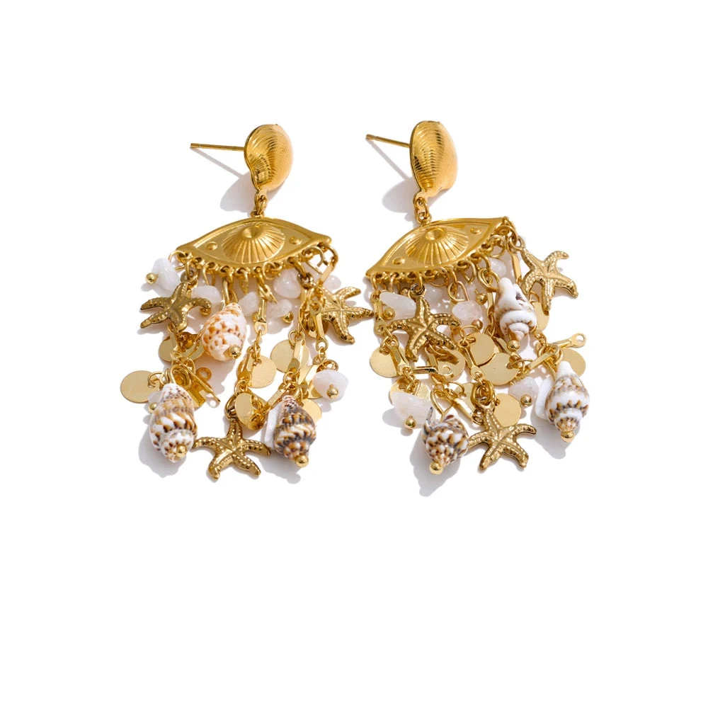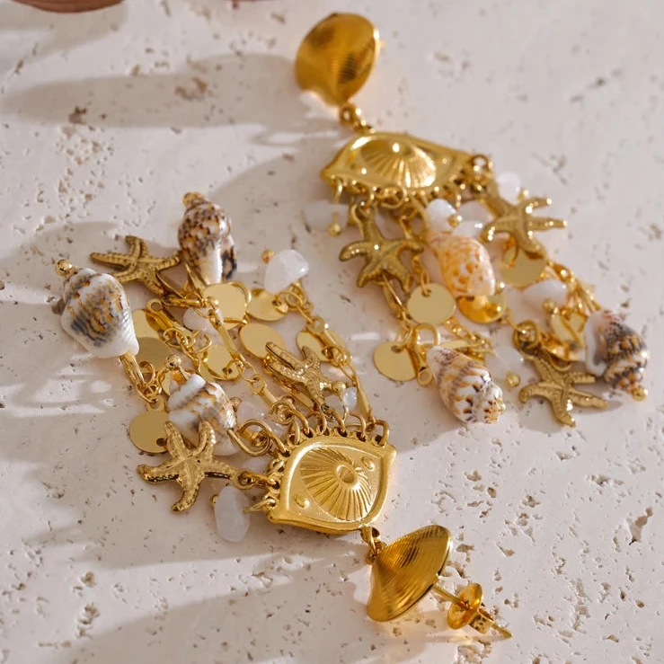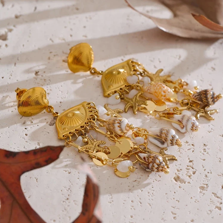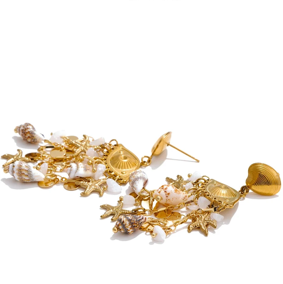 Elevate your summer look with the Oceana earrings, featuring delicate shell, conch, and starfish charms. Their golden finish adds a touch of elegance, making them perfect accessories for holiday outings or beach-inspired ensembles.