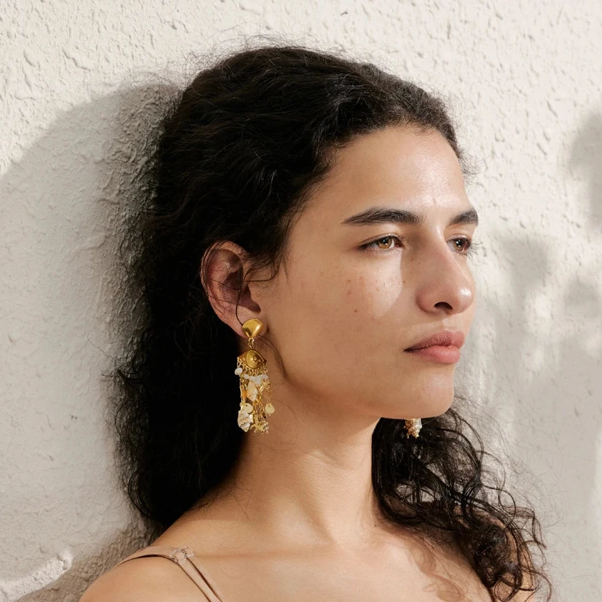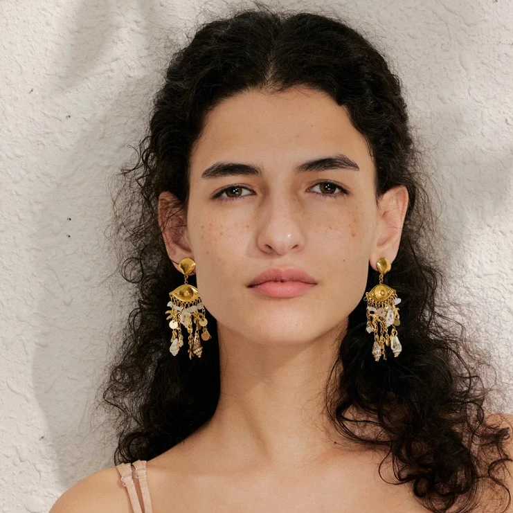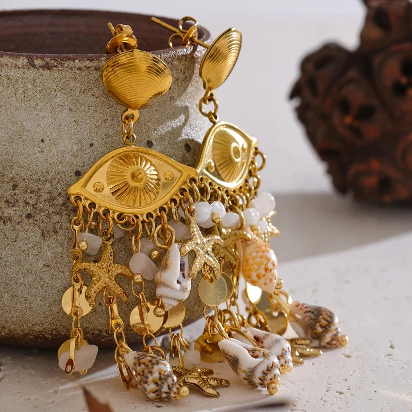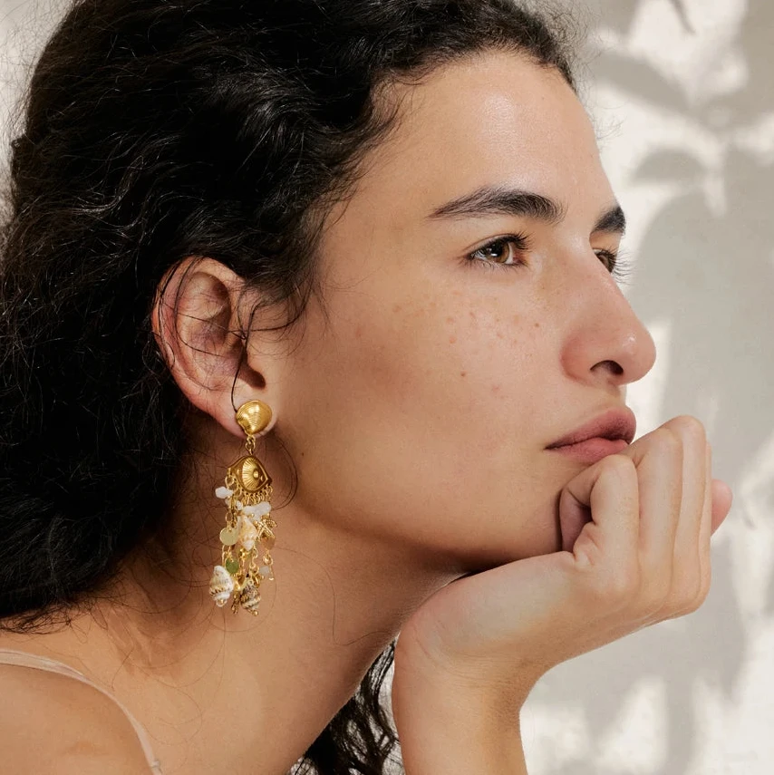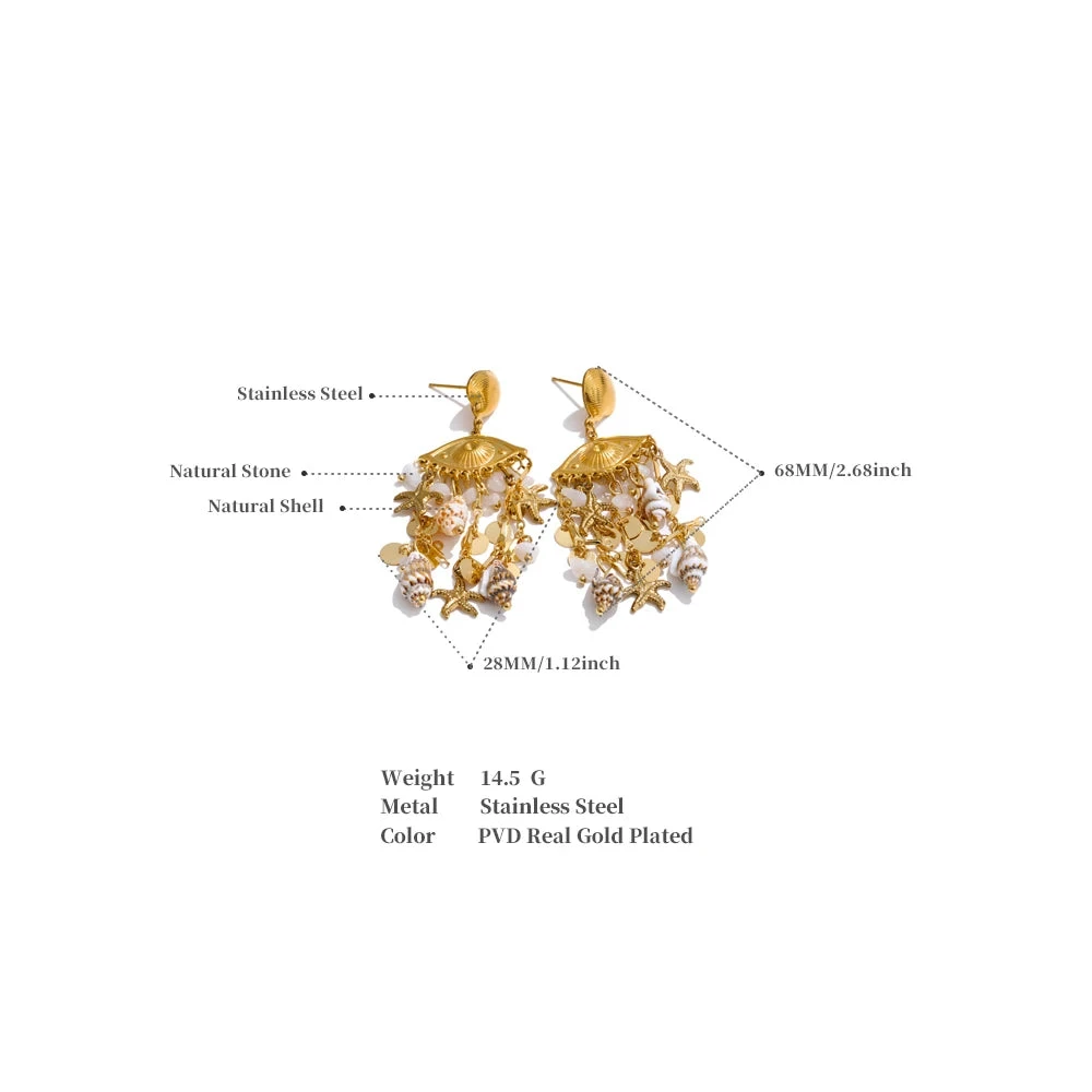 Elevate your summer look with the Oceana earrings, featuring delicate shell, conch, and starfish charms. Their golden finish adds a touch of elegance, making them perfect accessories for holiday outings or beach-inspired ensembles.