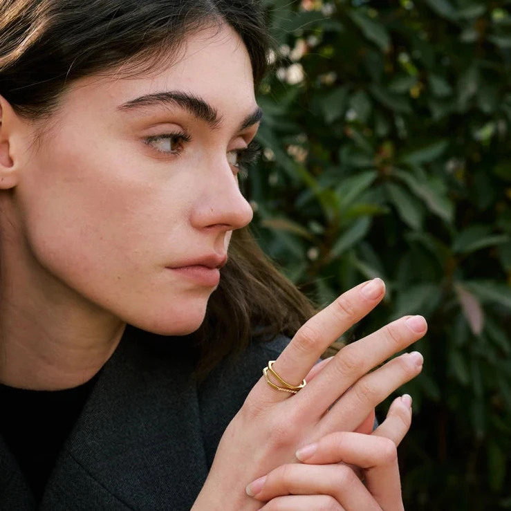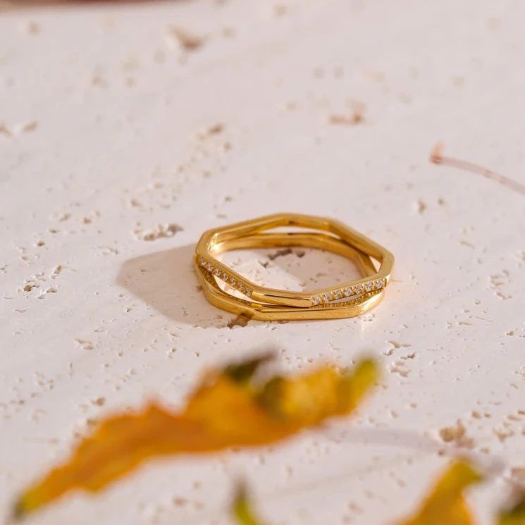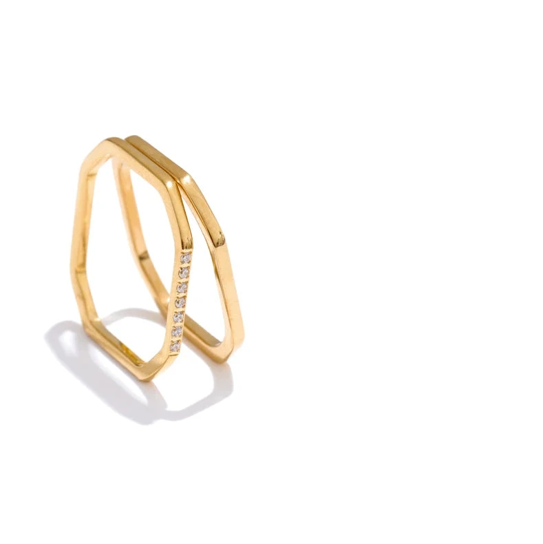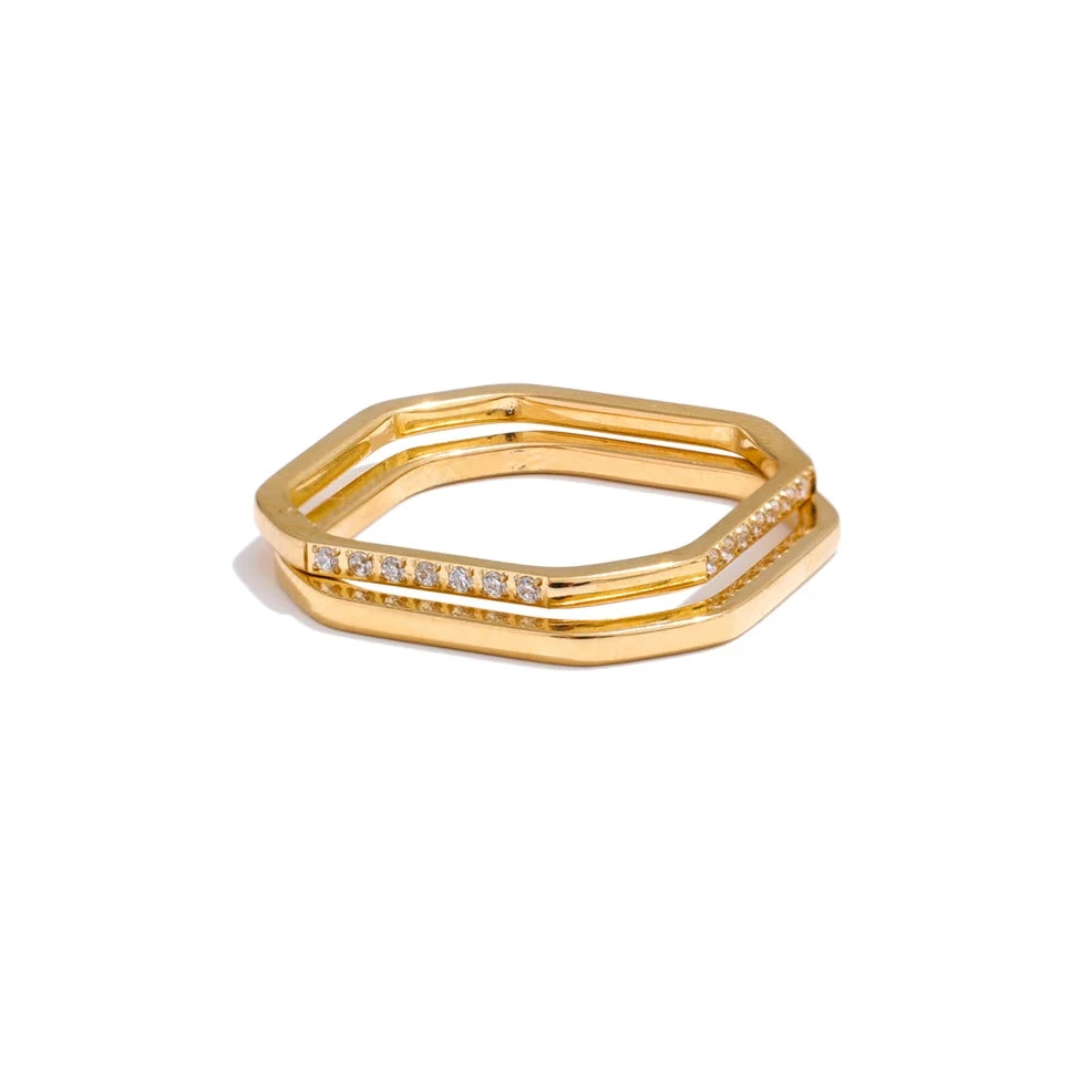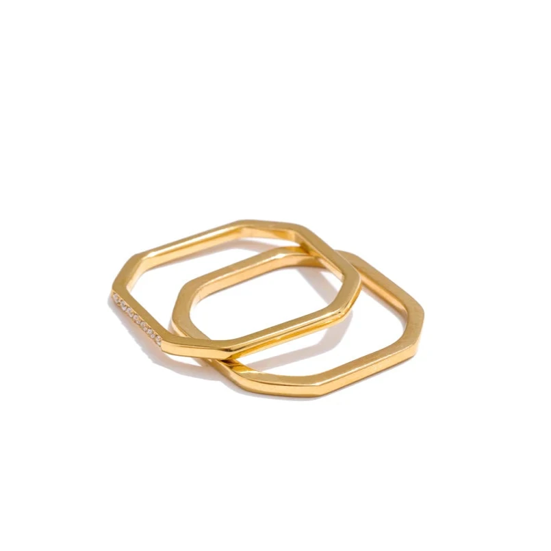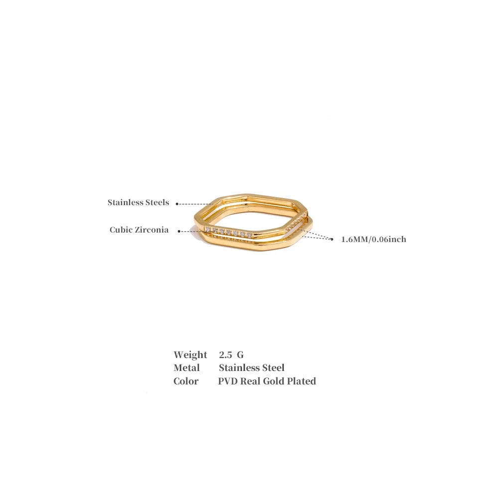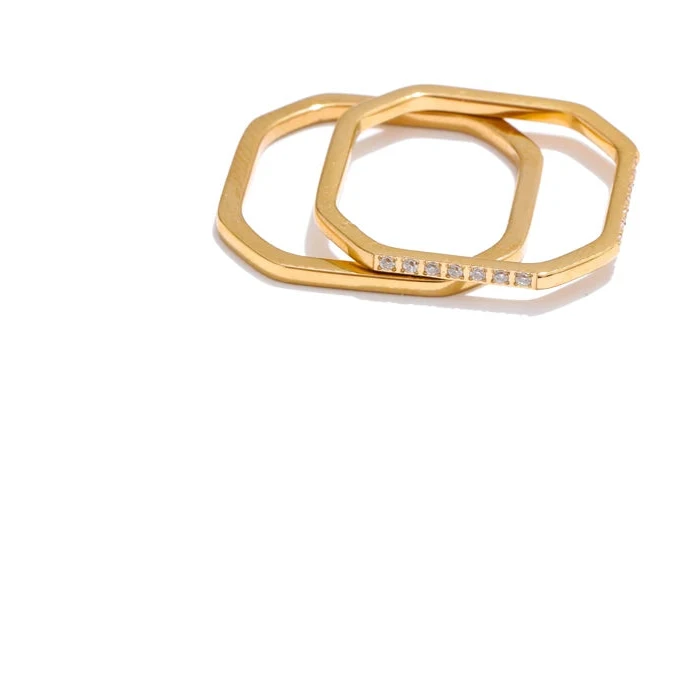 This elegant square stackable ring features a durable 18K gold PVD plating that ensures lasting shine and resistance to tarnish. Adorned with sparkling cubic zirconia, it offers a refined charm perfect for layering or wearing solo.