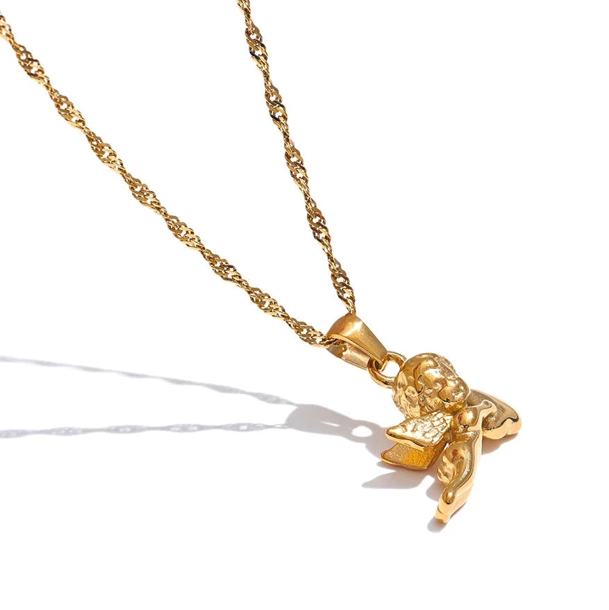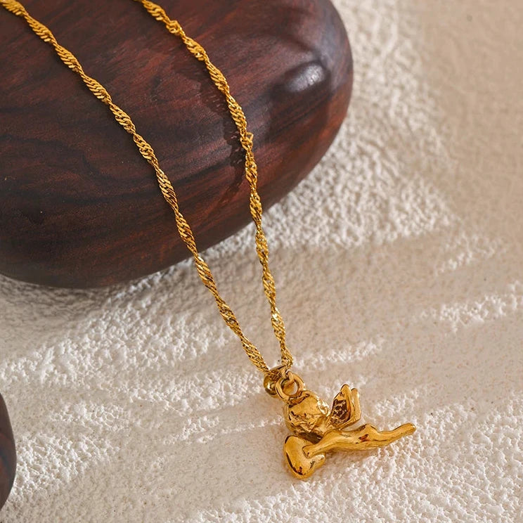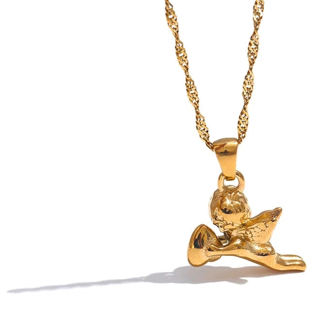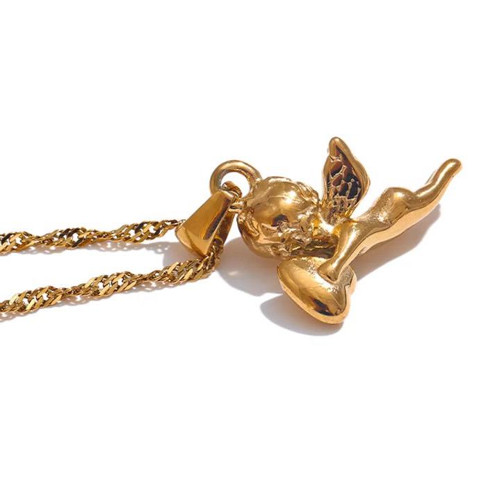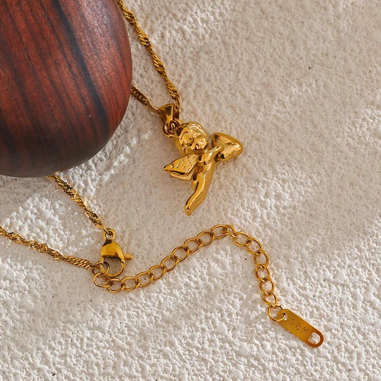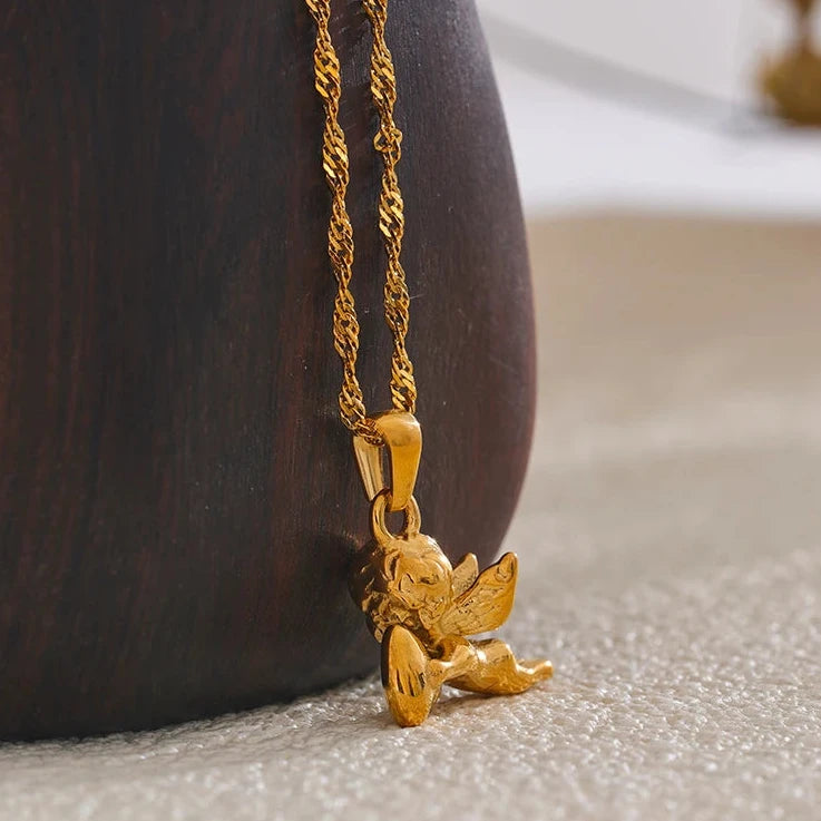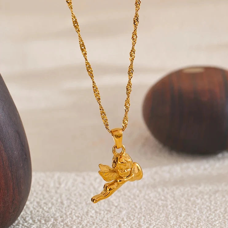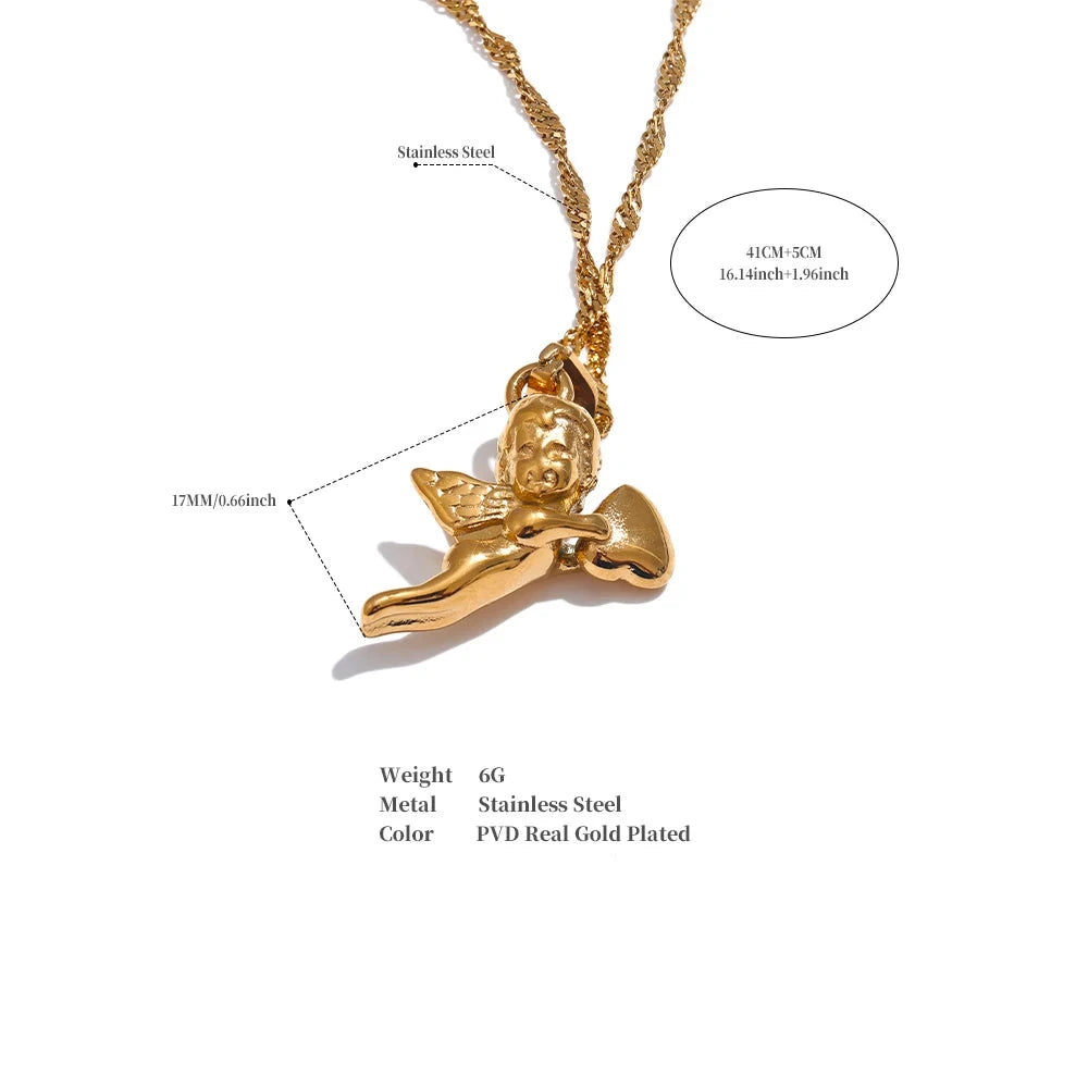 This stainless steel necklace features an elegant angel heart pendant, expressing love and blessings. With a 18K PVD plated finish, this waterproof necklace is the perfect way to show your love and appreciation.