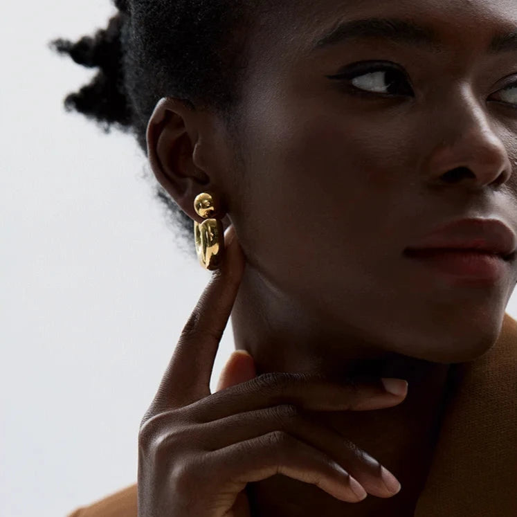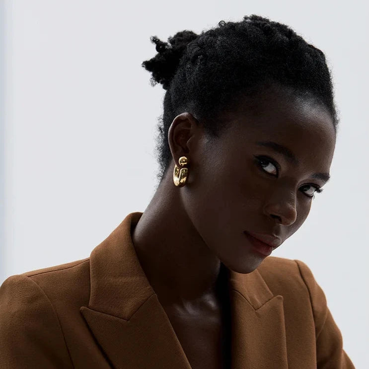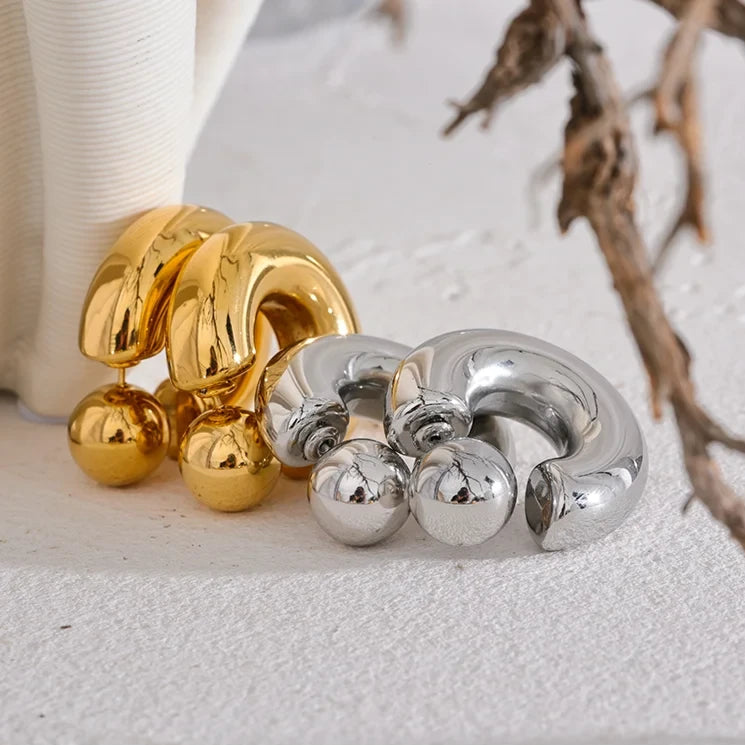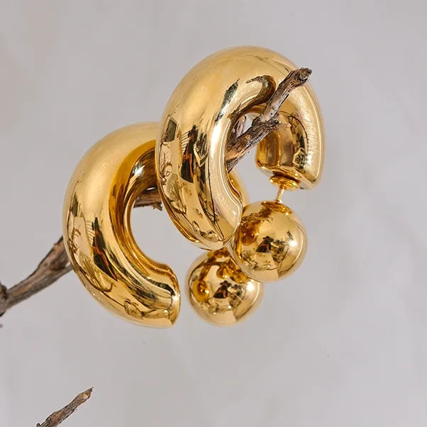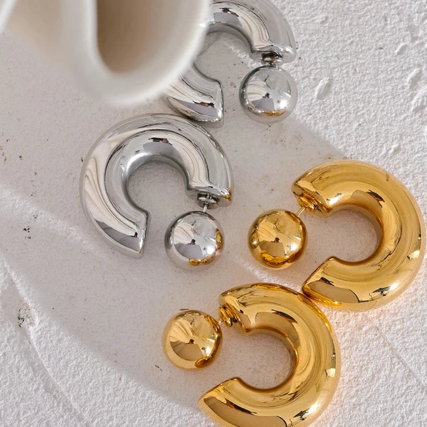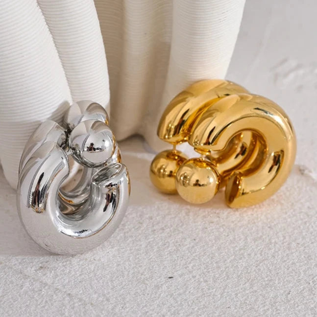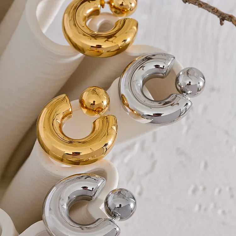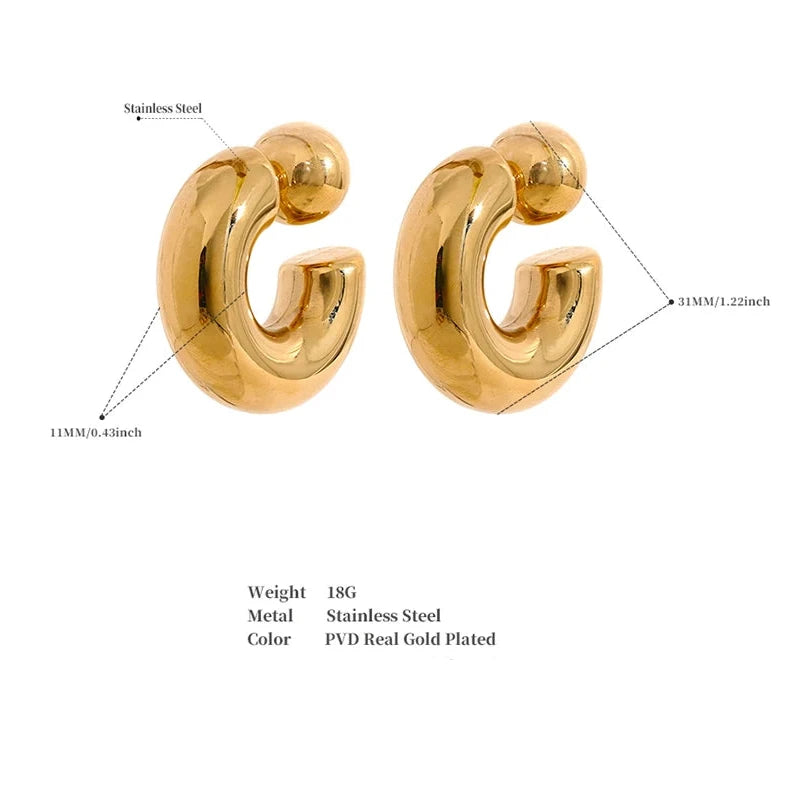 These stainless steel C-shaped earrings feature a unique chunky design and a water-resistant metal texture. Their durable construction is both practical and attractive, making them a stylish addition to any jewellery collection.