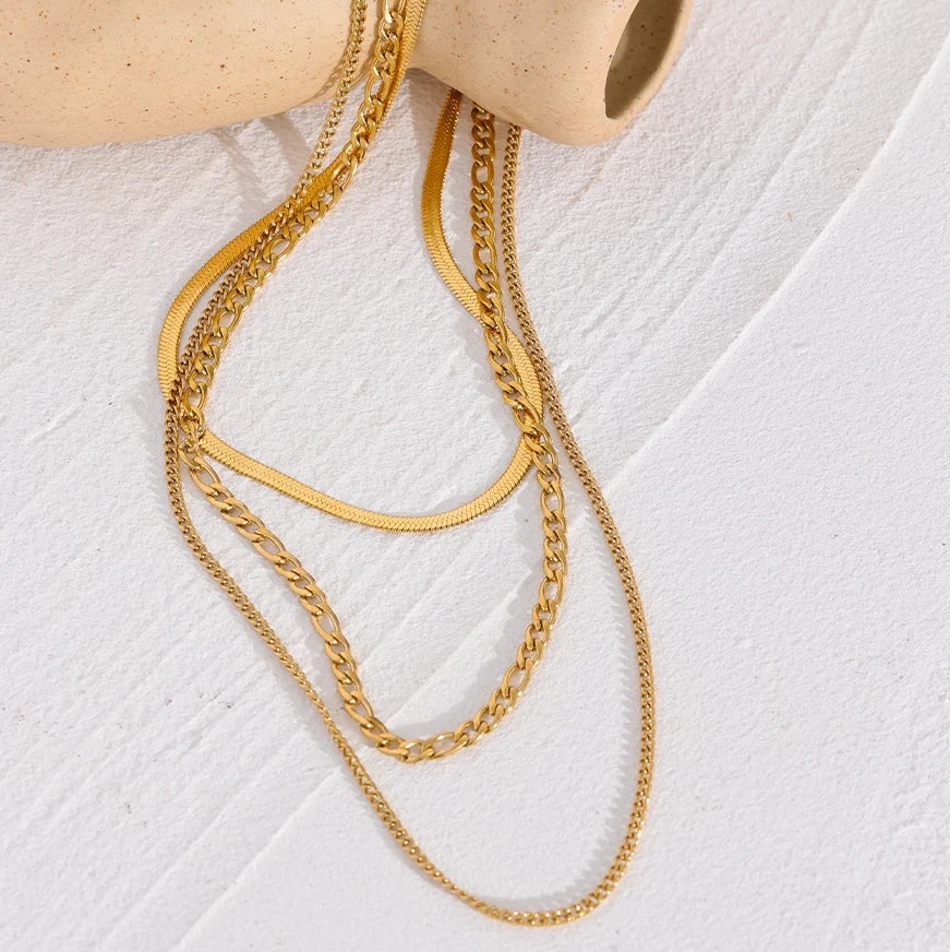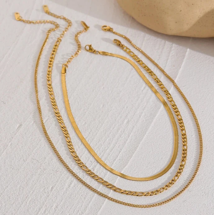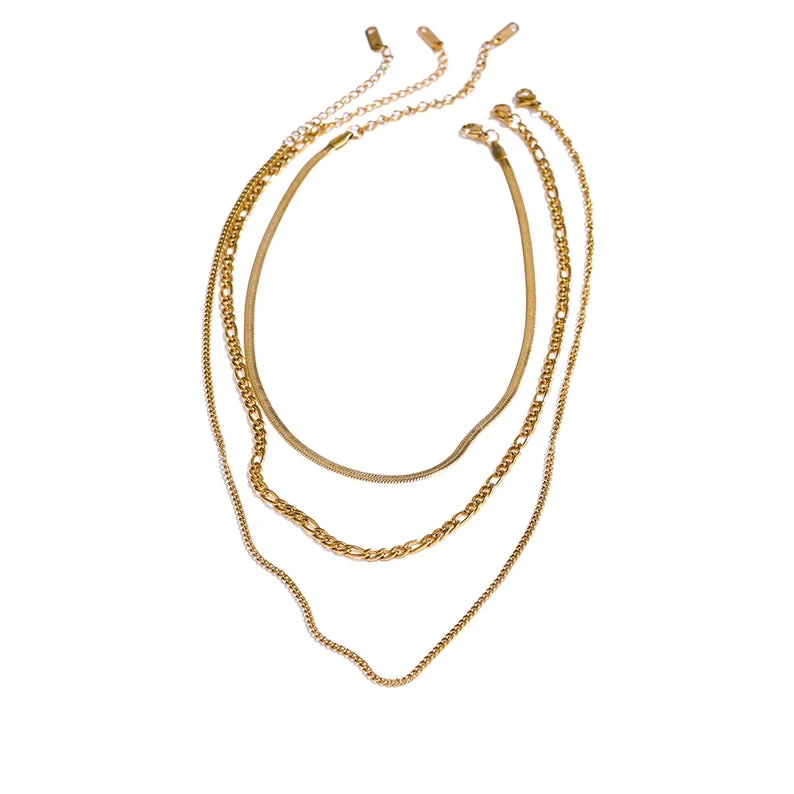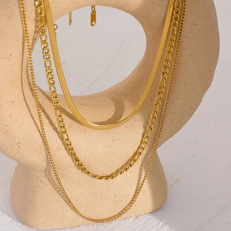 Elevate your style with this expertly crafted layered necklace set, featuring stainless steel chains in a striking golden metallic finish. Designed for durability and water resistance, this statement collar necklace offers both elegance and resilience.