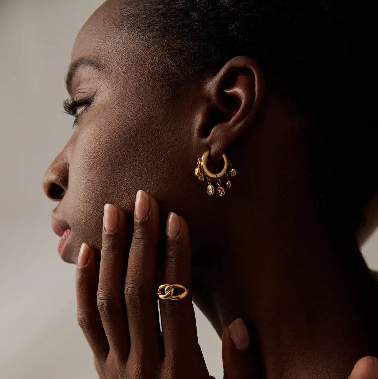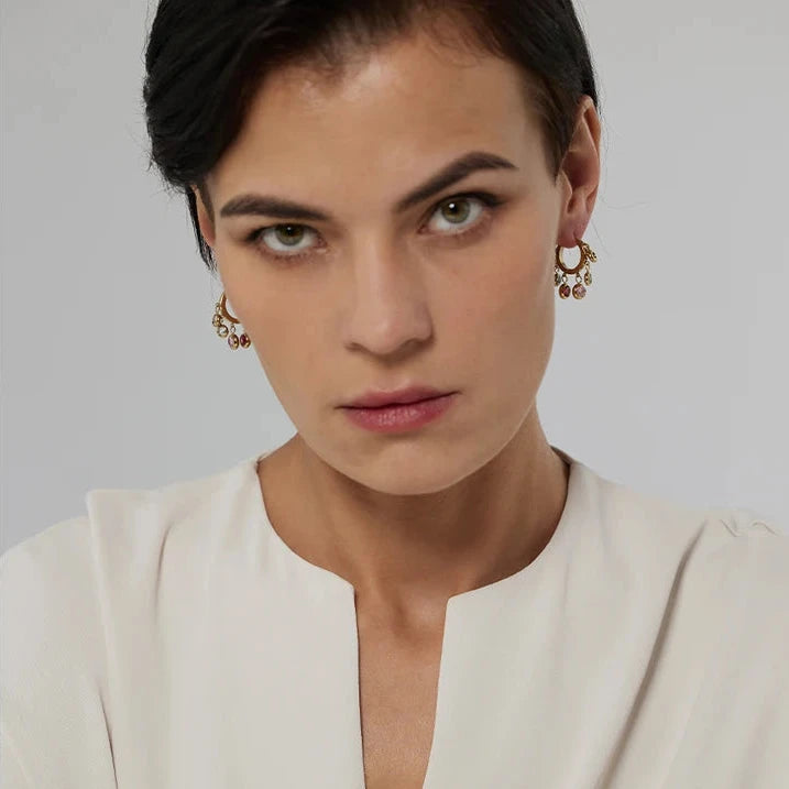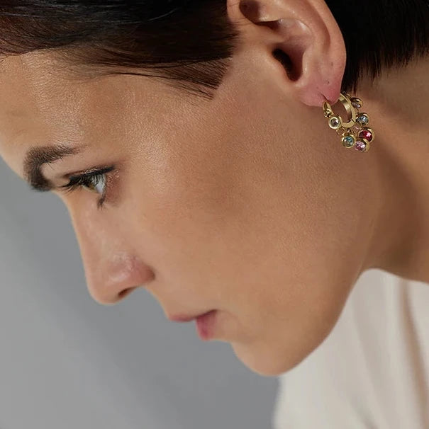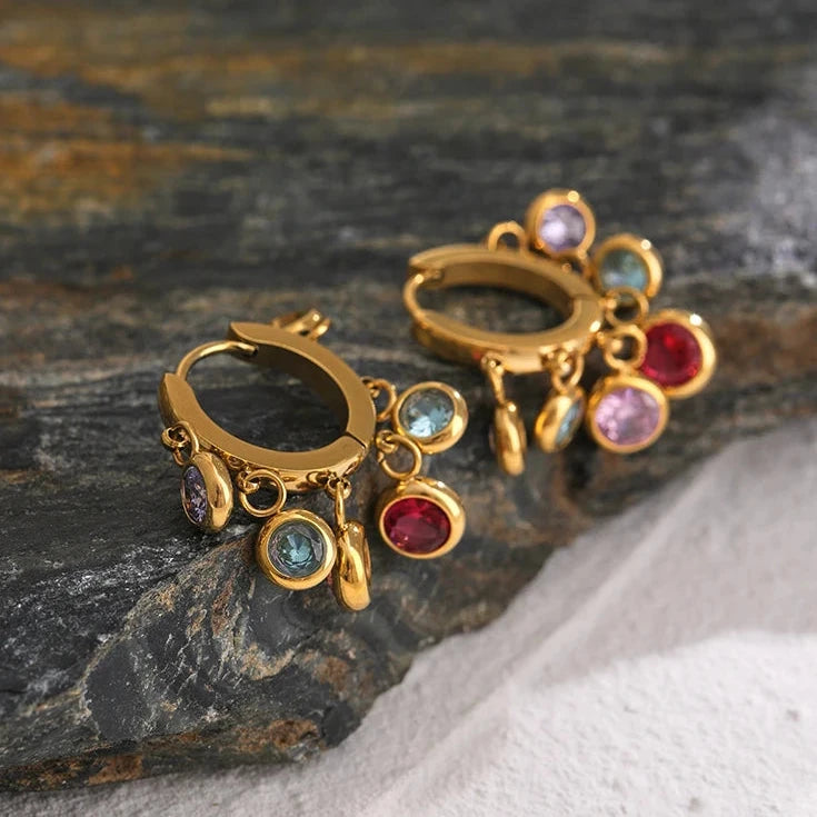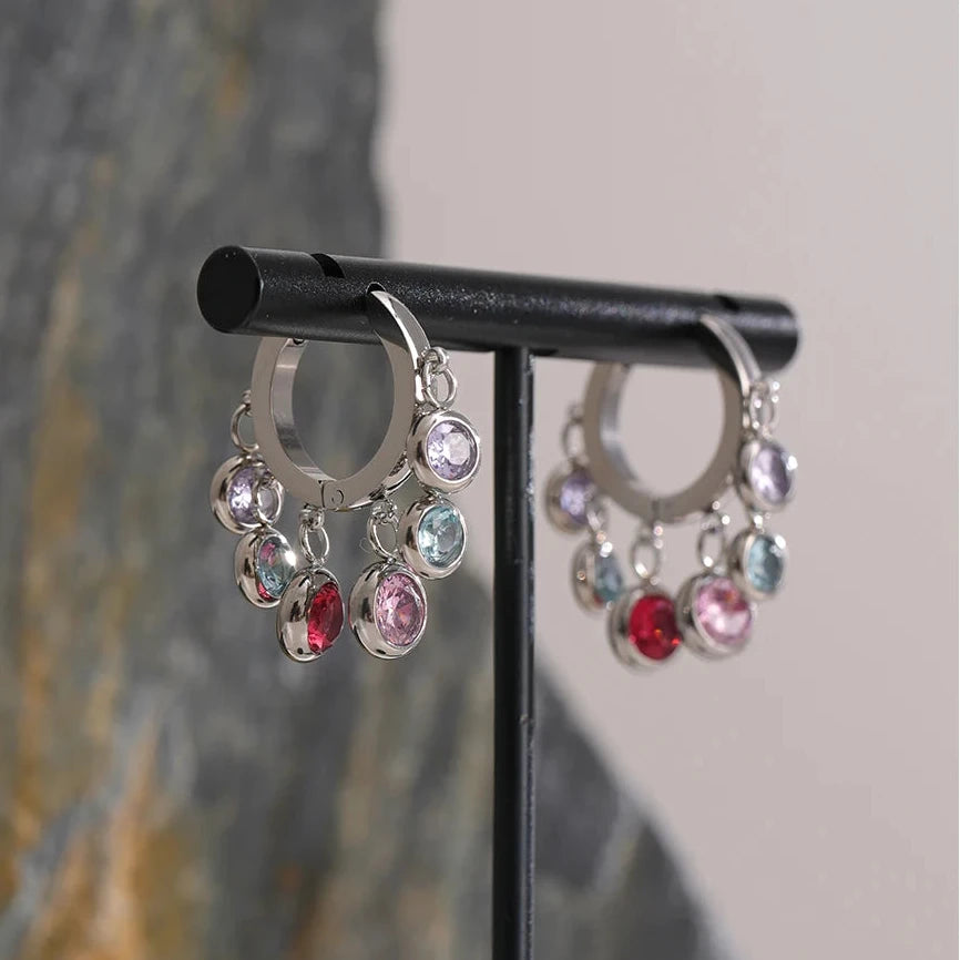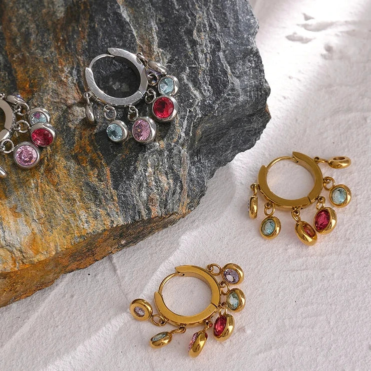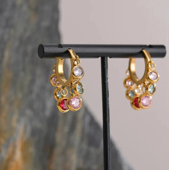 Made with beautiful colourful cubic zirconia stones, these exquisite earrings add a touch of glamour to any outfit. The metal texture and geometric design make them a fashion must-have. Perfect for gifting or treating yourself to a stylish accessory.