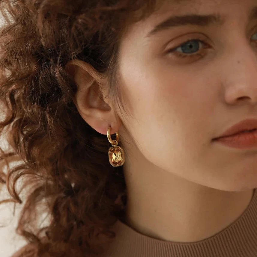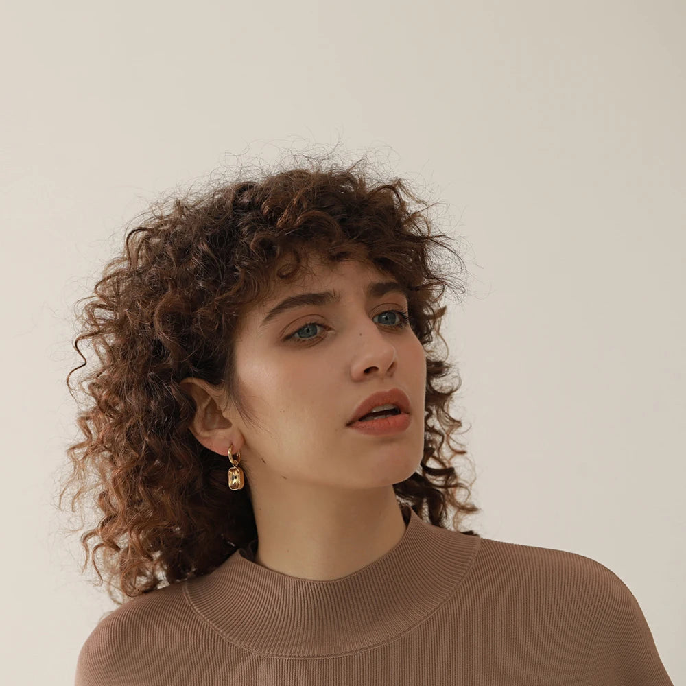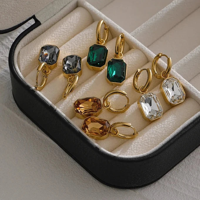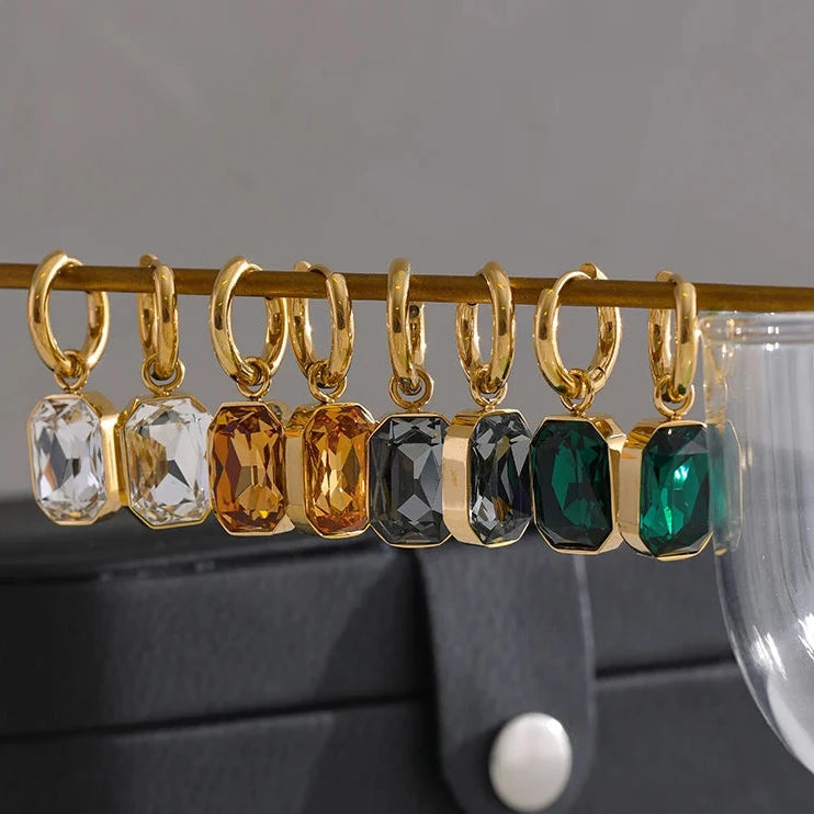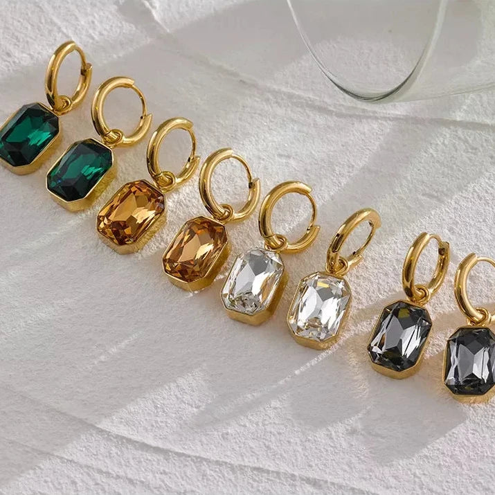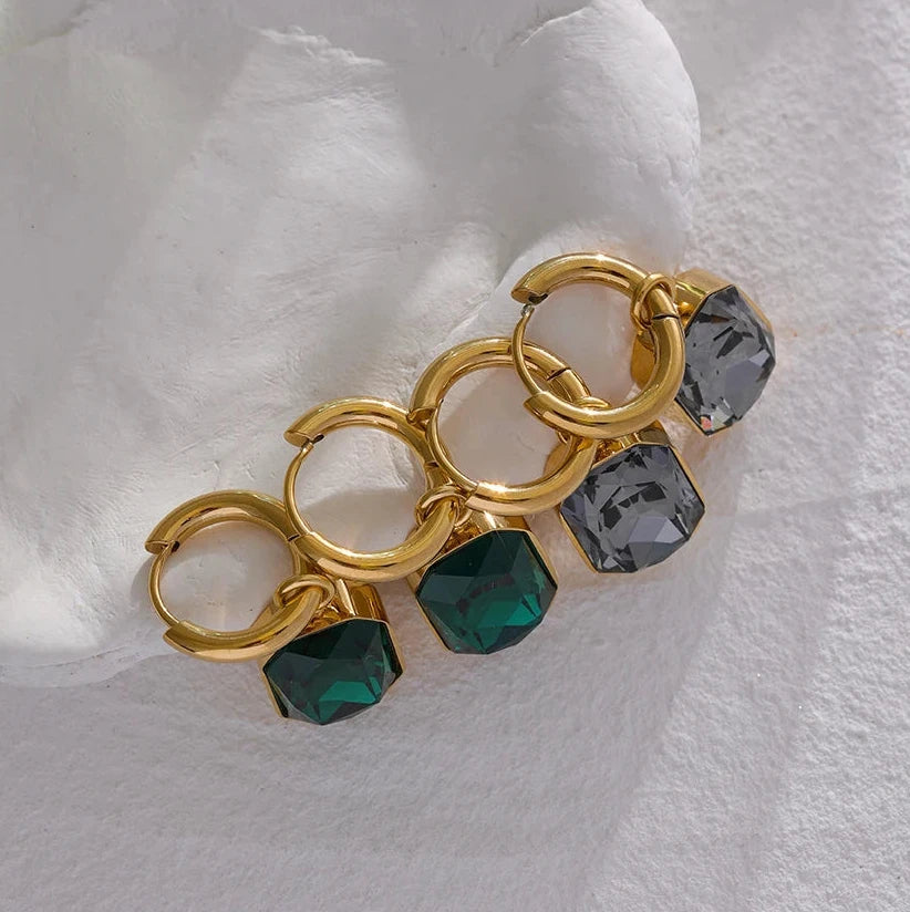 Made with 18k-gold-plated stainless steel and featuring green square geometric charms, these trendy earrings are sure to add a touch of elegance to any outfit. The cubic zirconia stones add a touch of sparkle, making these earrings perfect for any occasion.