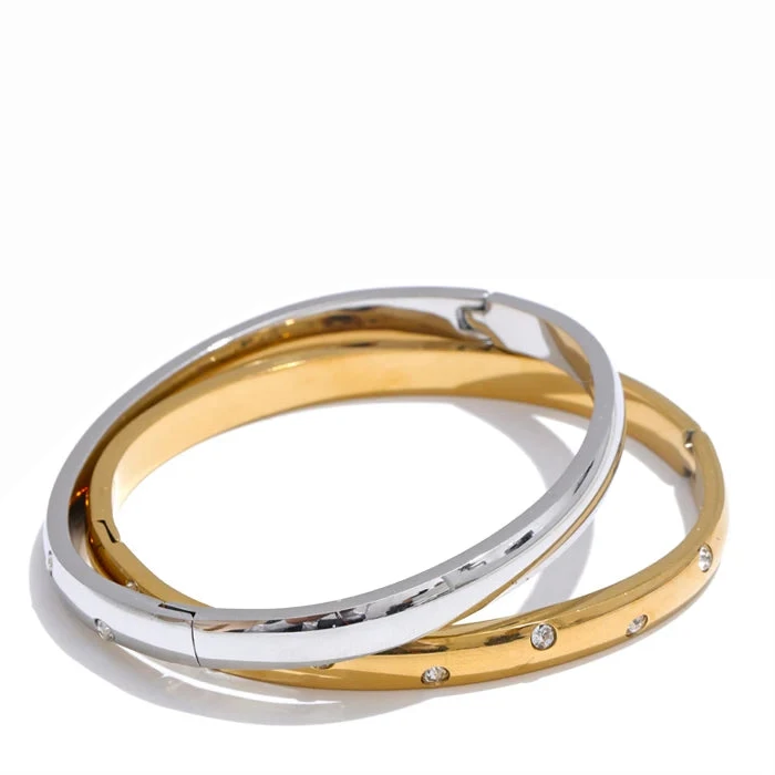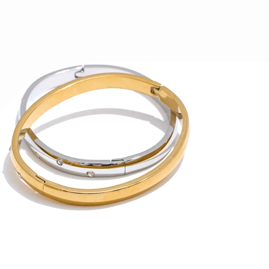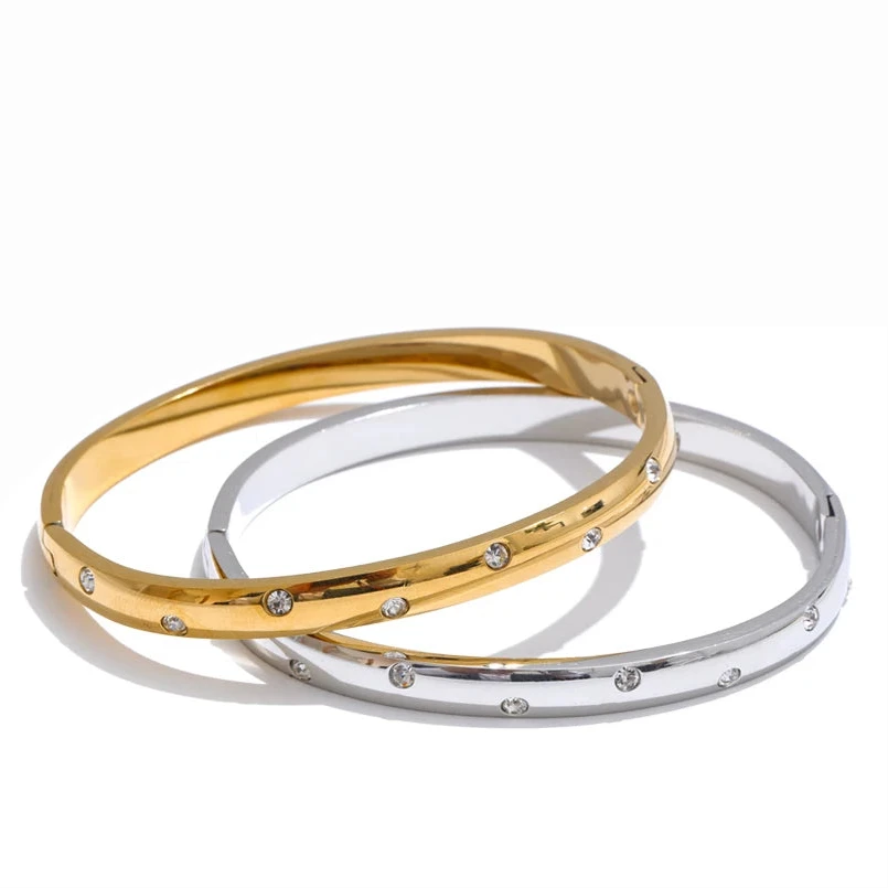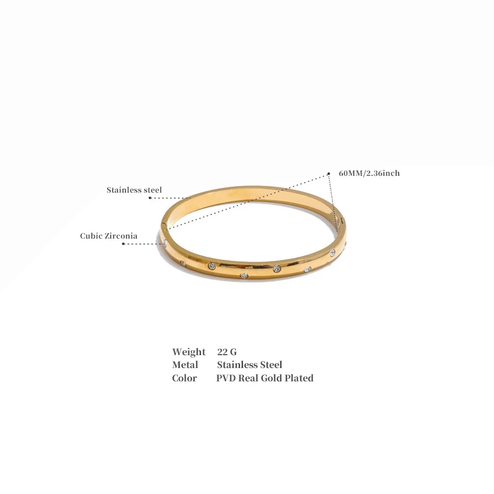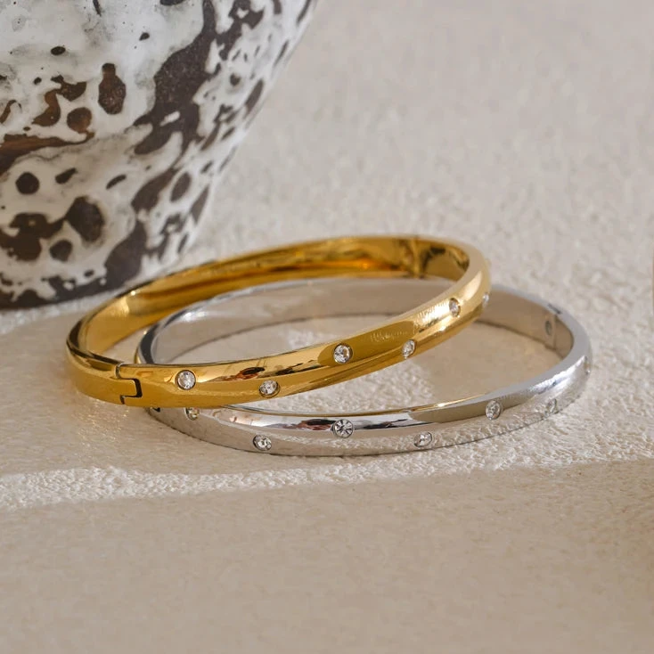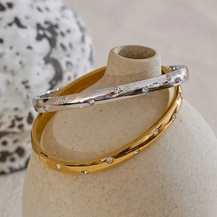 This bangle is expertly crafted from stainless steel and adorned with brilliant cubic zirconia stones. Available in both gold and silver tones, it features a high-quality PVD coating that ensures waterproof durability and long-lasting colour retention.