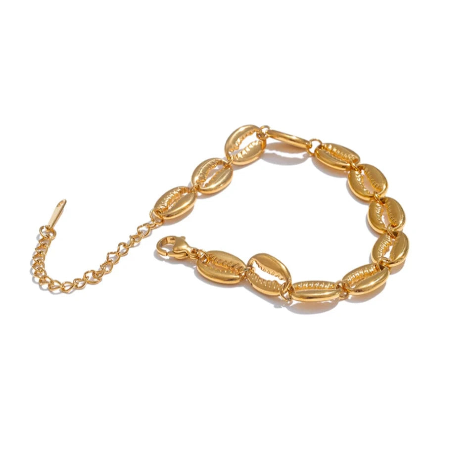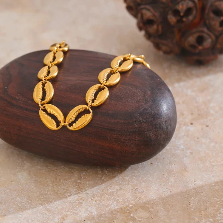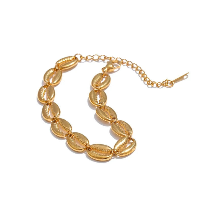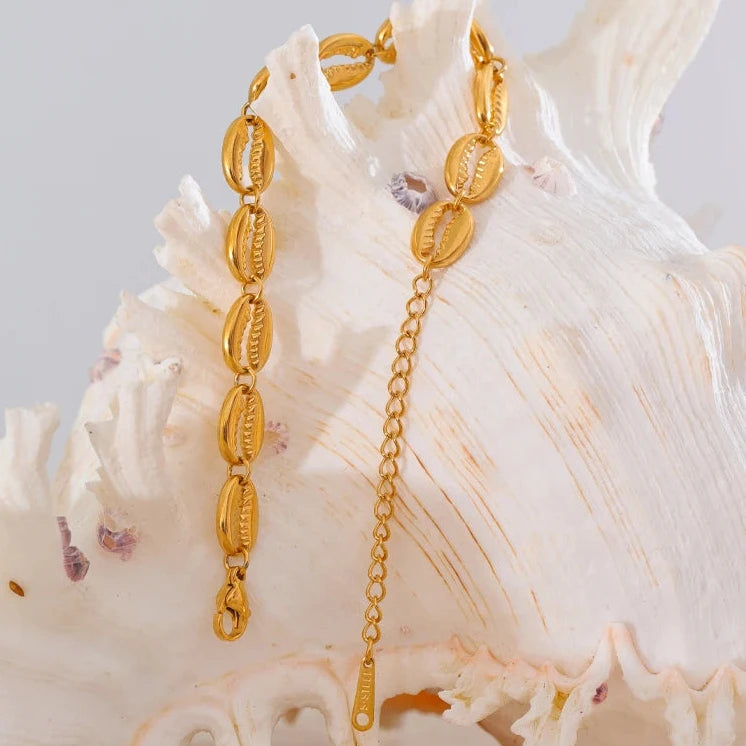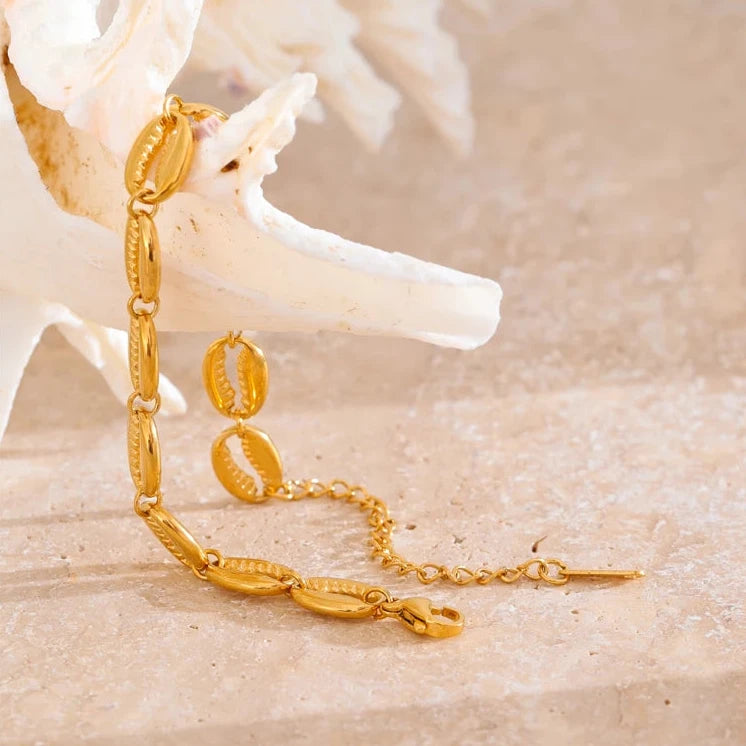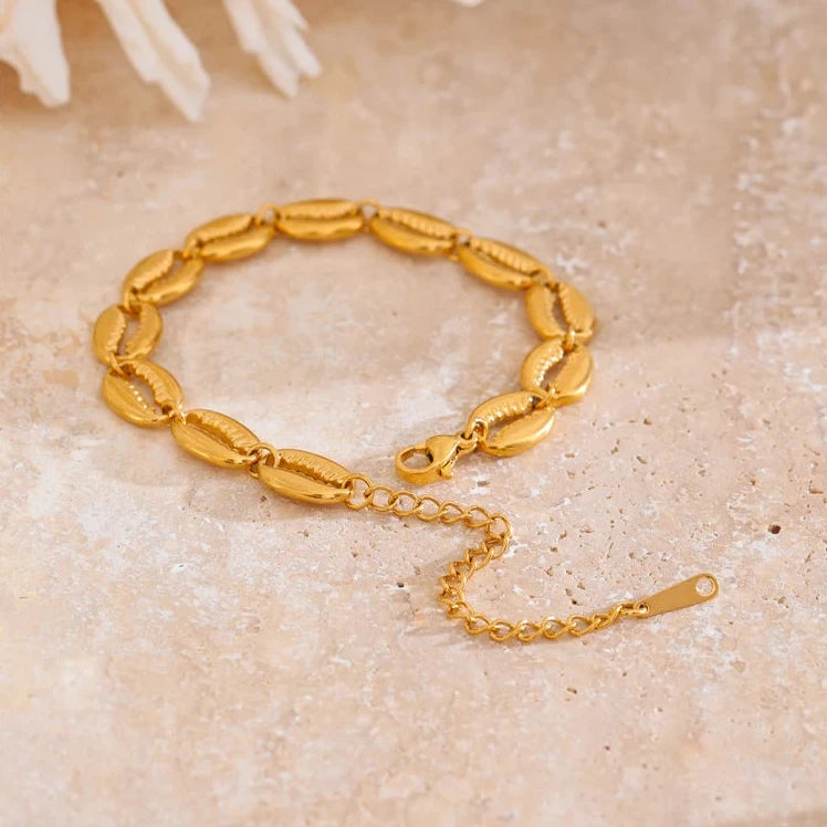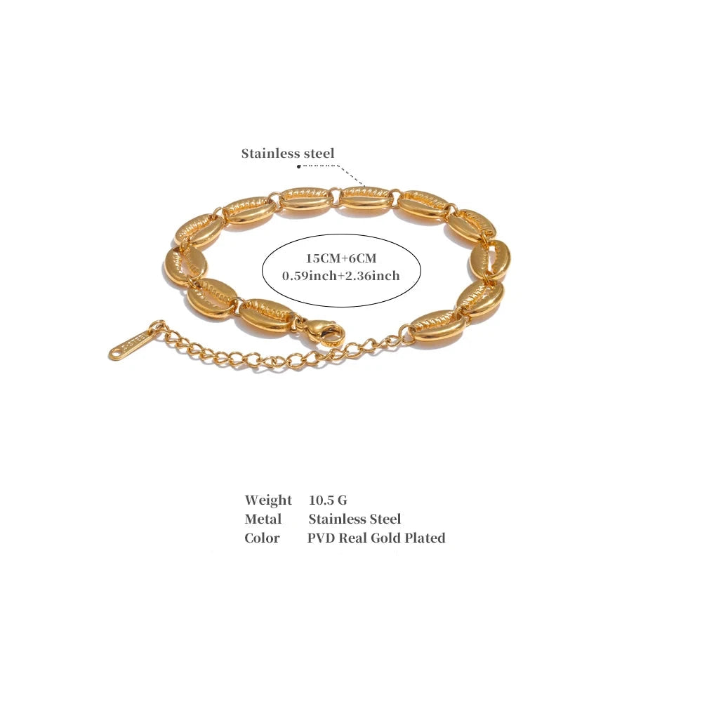 This handcrafted bracelet features a durable stainless steel shell design with an elegant 18K gold plating, combining lasting quality with sophisticated style. Designed for beach and holiday wear, its waterproof construction ensures it withstands summer adventures while maintaining its radiant finish.