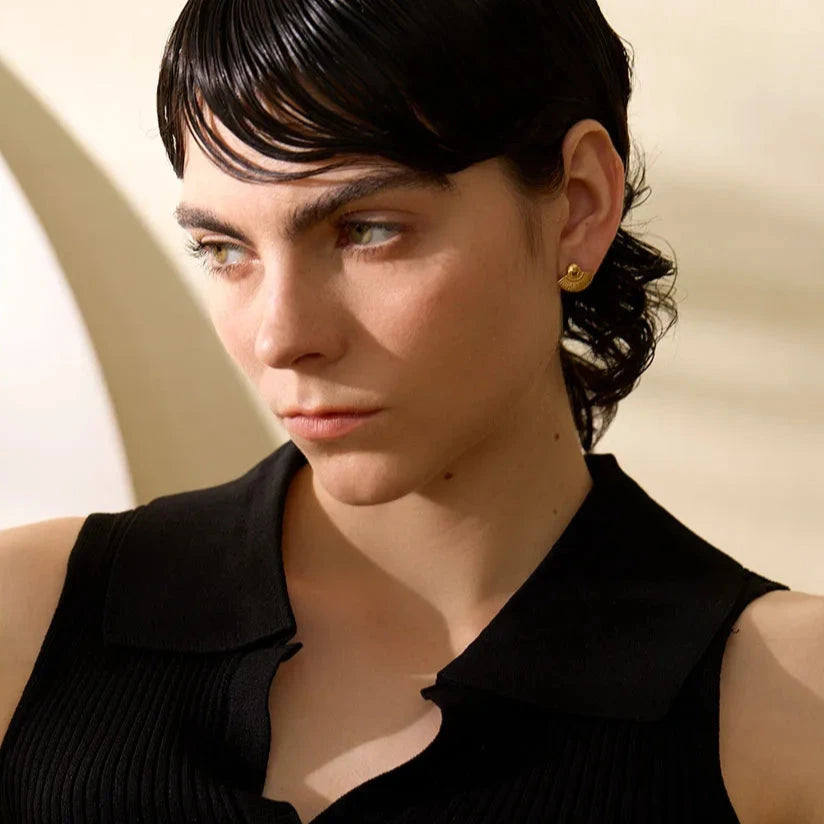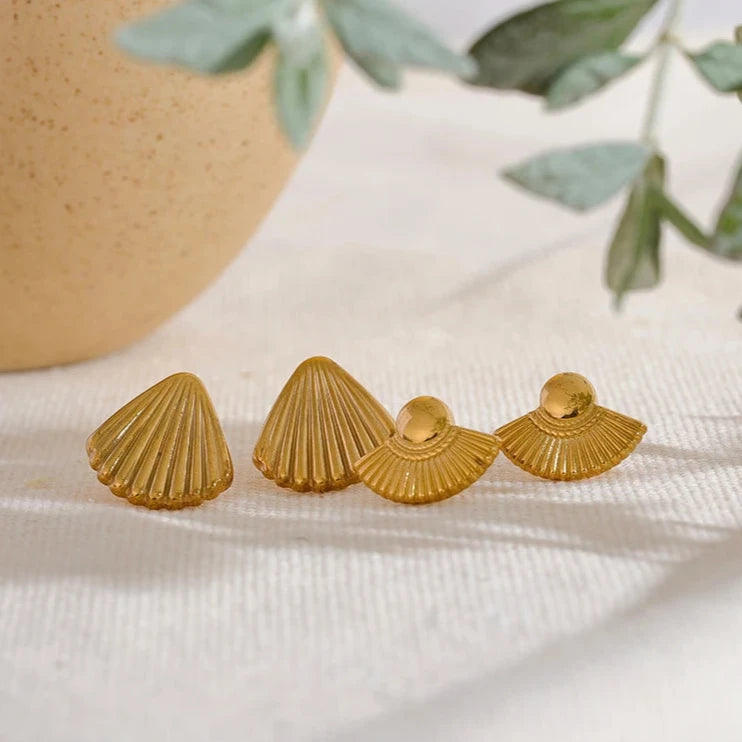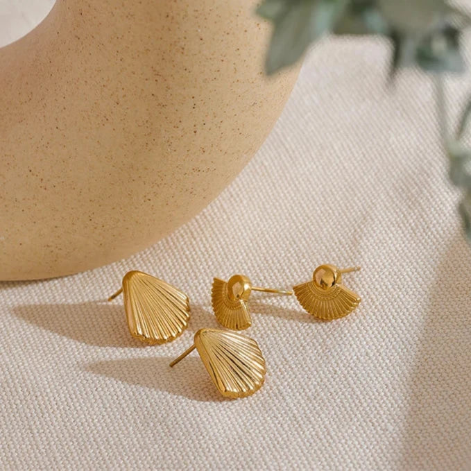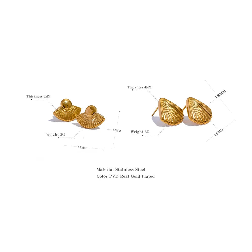 These minimalist stud earrings add a touch of elegance with their 18K gold-plated stainless steel and waterproof design. These earrings feature two stylish shell casts and are sure to be a popular addition to your collection.