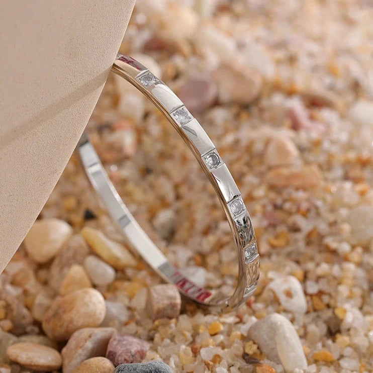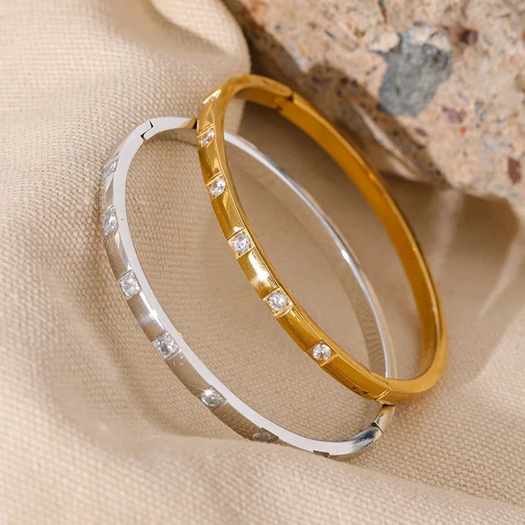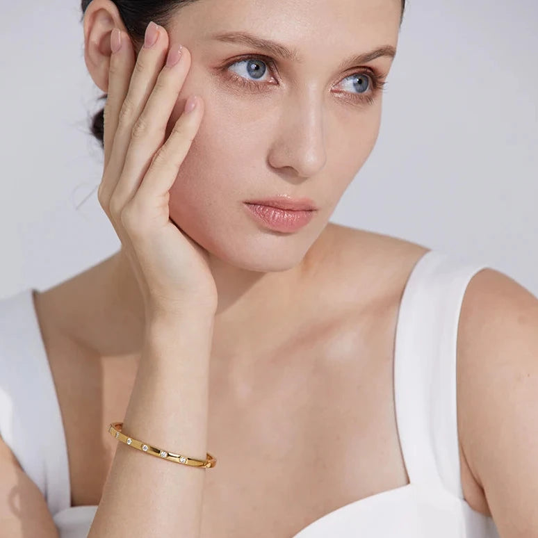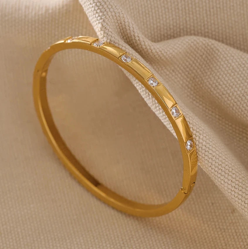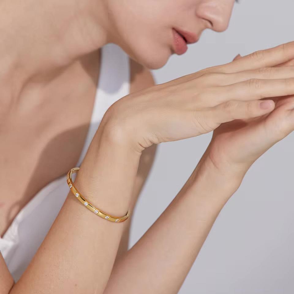 Expertly crafted with 18K gold plating and stainless steel, this wrist bangle is the perfect addition to any woman's jewellery collection. Its waterproof design ensures long-lasting wearability, while the shimmering cubic zirconia stones add a touch of charm.