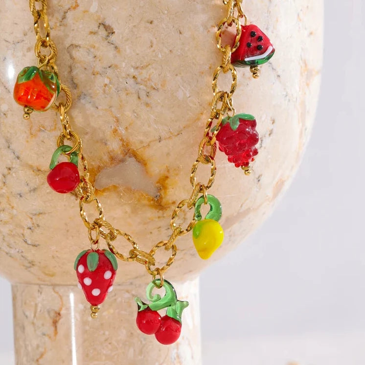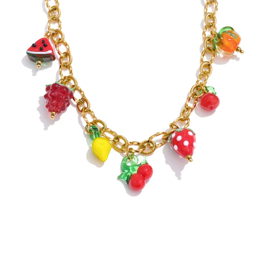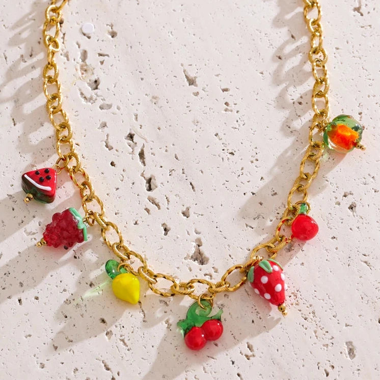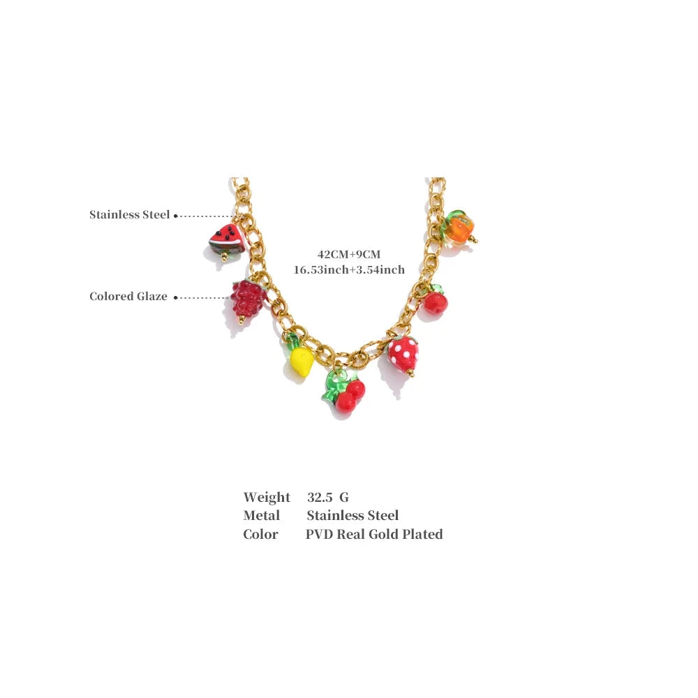 This gold-coloured stainless steel pendant necklace features a charming fruit design with a vibrant spring-summer glaze. Crafted for durability and style, it offers a trendy accessory choice for girls and ladies seeking a fresh, colourful touch.