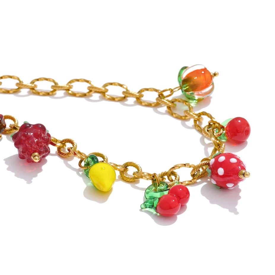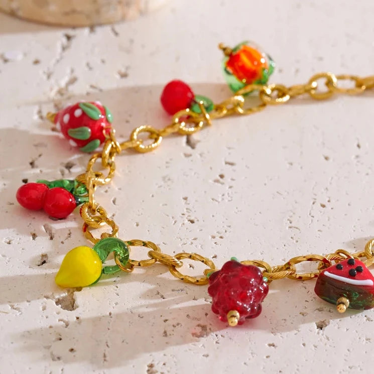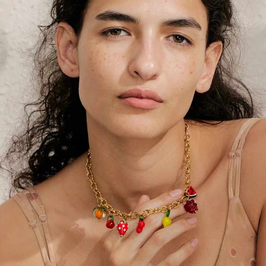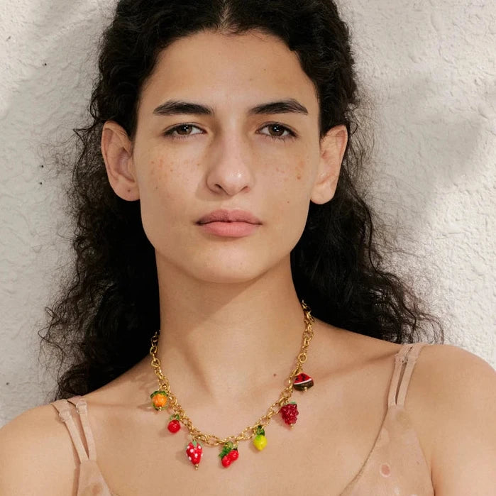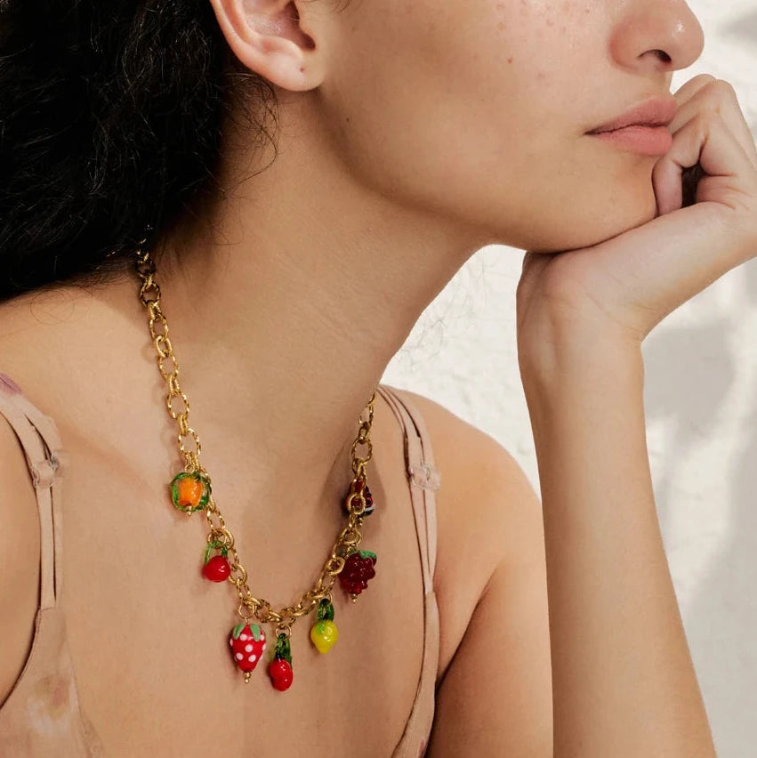 This gold-coloured stainless steel pendant necklace features a charming fruit design with a vibrant spring-summer glaze. Crafted for durability and style, it offers a trendy accessory choice for girls and ladies seeking a fresh, colourful touch.