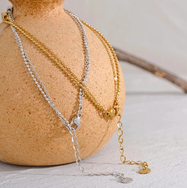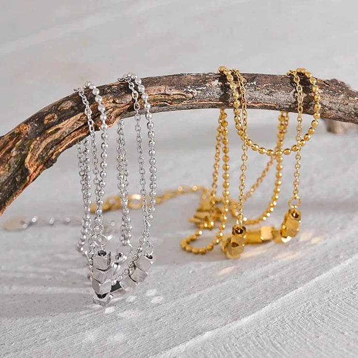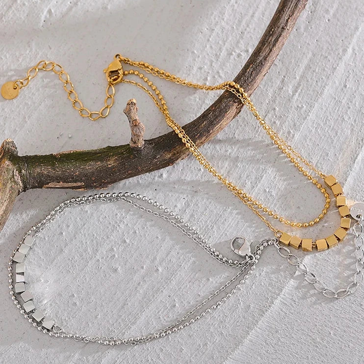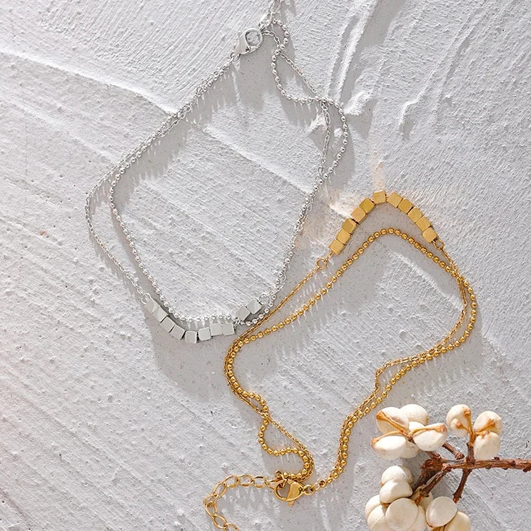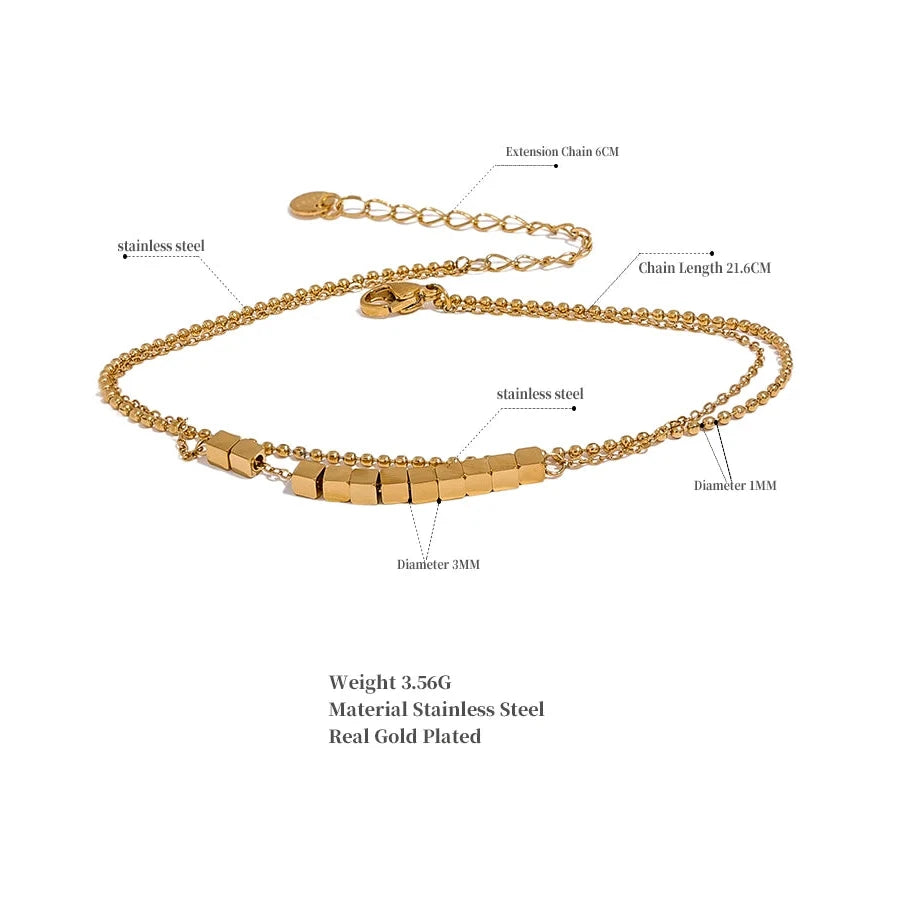 This gold-coloured layered anklet features a waterproof stainless steel square bead chain, it adds a statement touch to any outfit. Made of durable materials, it can withstand sand and water without losing its shine.