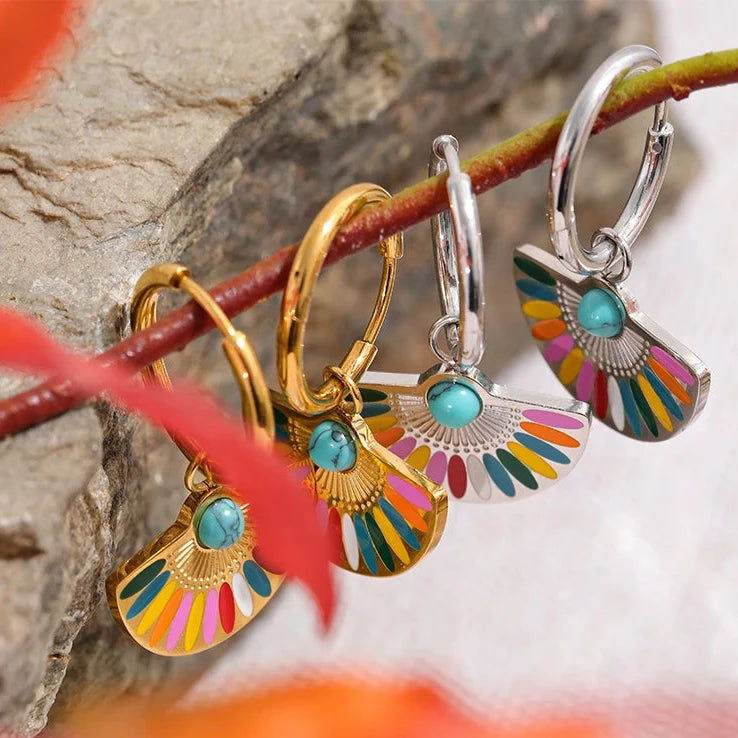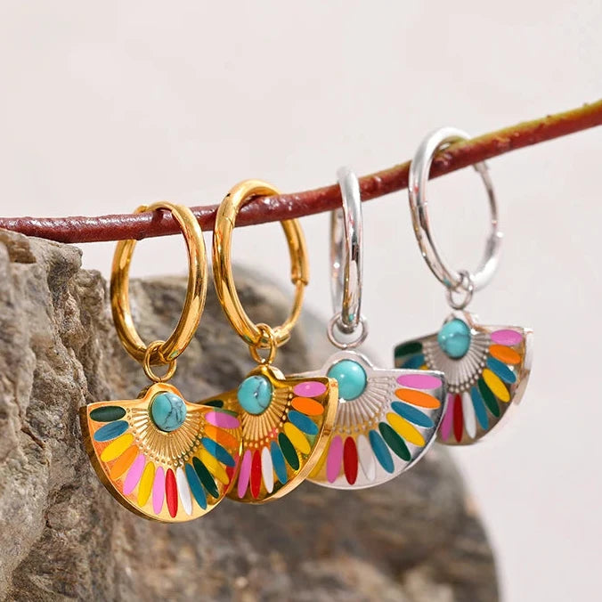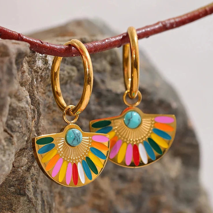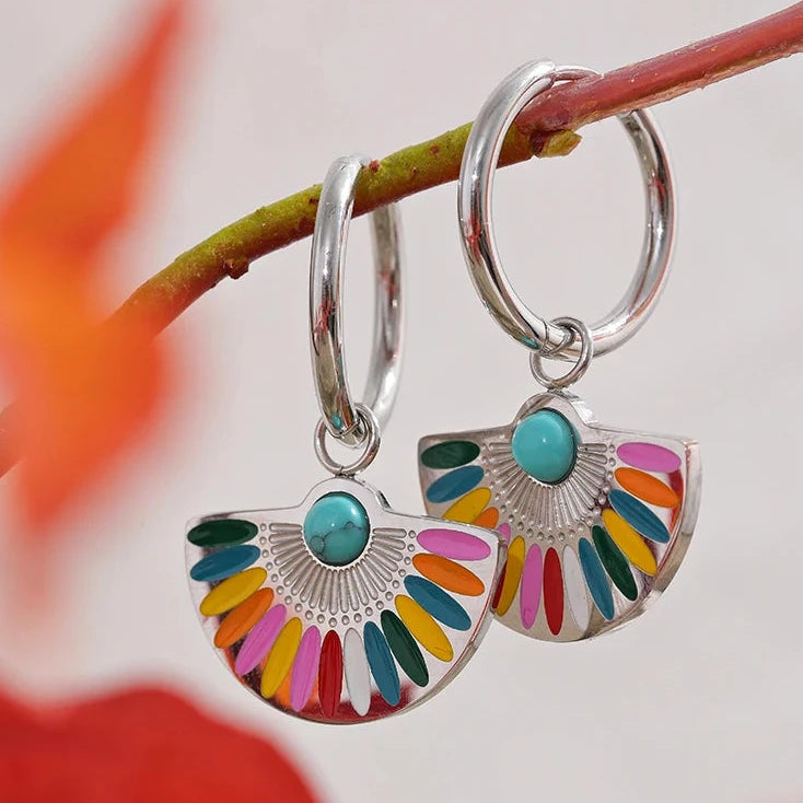 Add a touch of colour and charm to your outfit with these enamel hoop earrings. Made with stainless steel, these geometric bohemian earrings feature a fan design and rainbow drops, perfect for trendsetters. Elevate your fashion game with these stylish and durable pieces.